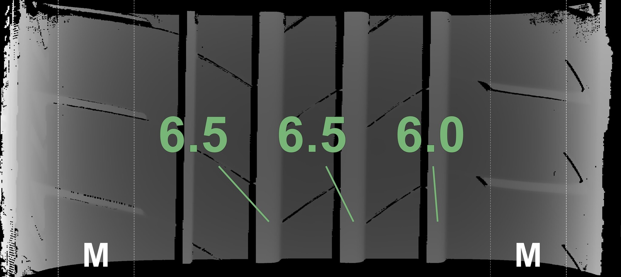 | Condition | Profile depth | DOT | Front Left | Demo nubs still visible | 6.5 mm | 0725 |