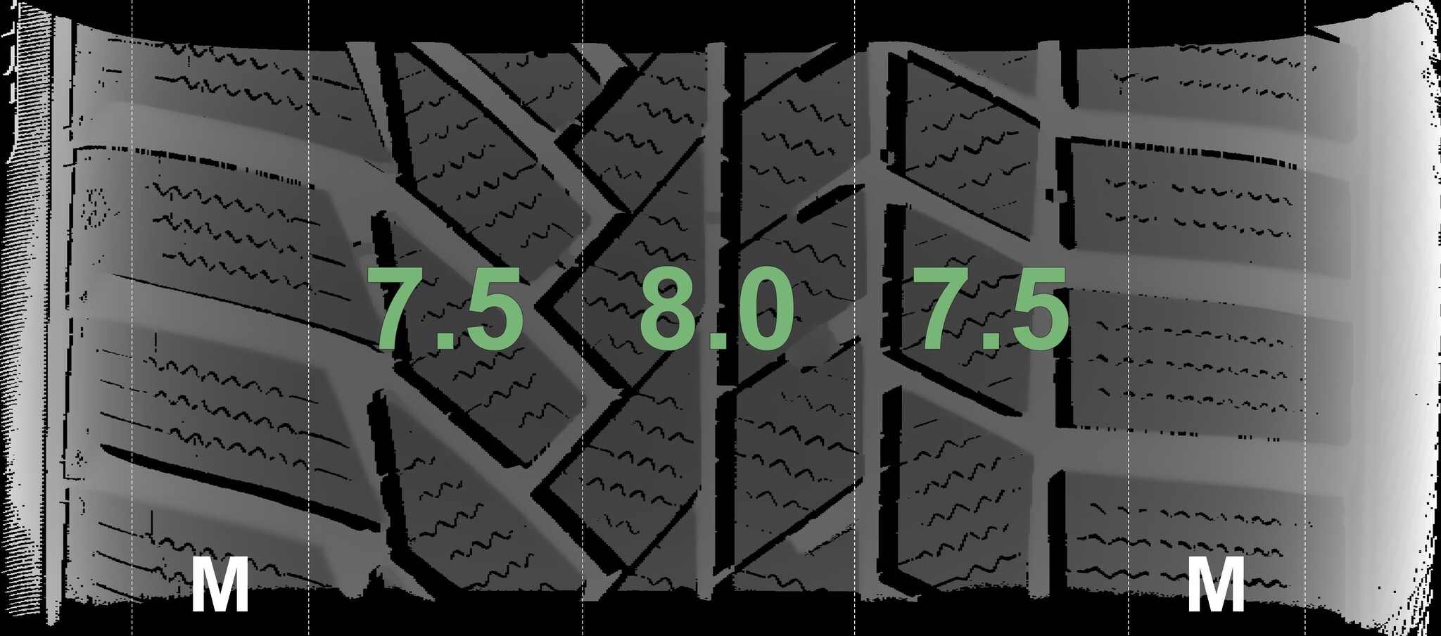| Condition | Profile depth | DOT | Front Left | Used | 8.0 mm | 1623 |