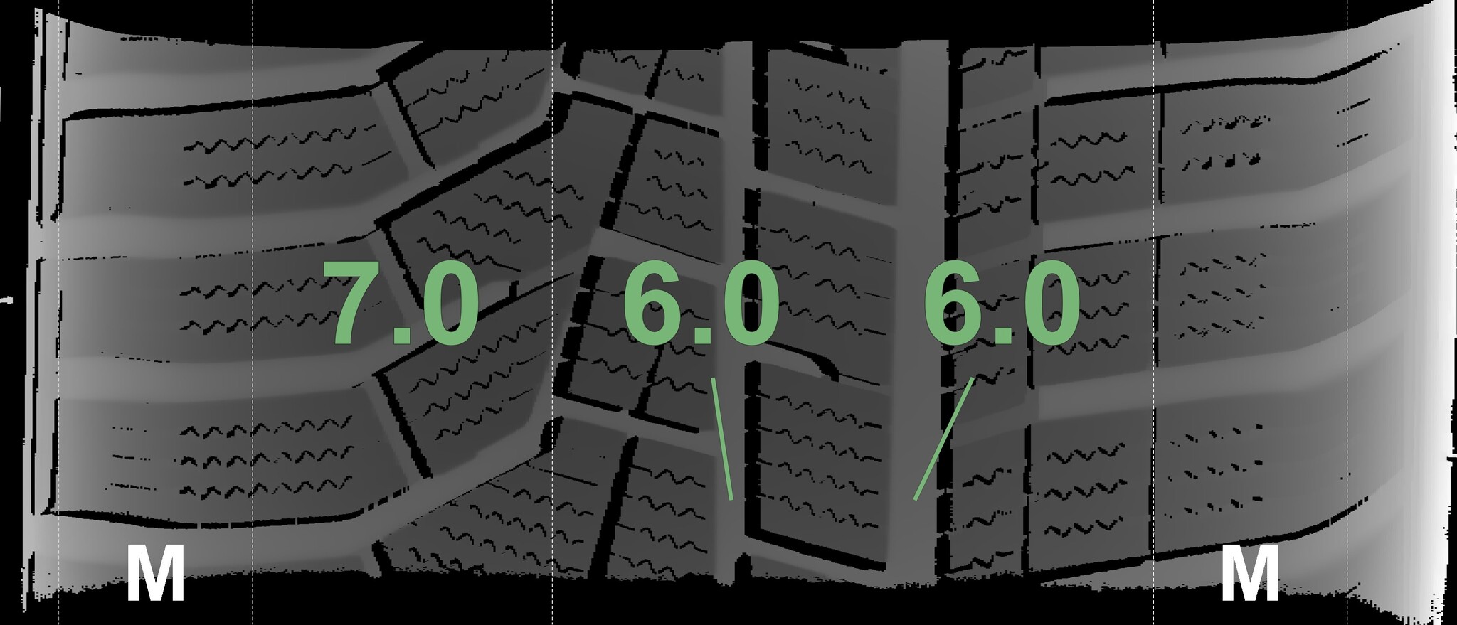| Condition | Profile depth | DOT | Front Right | Used | 6.7 mm | 4523 |