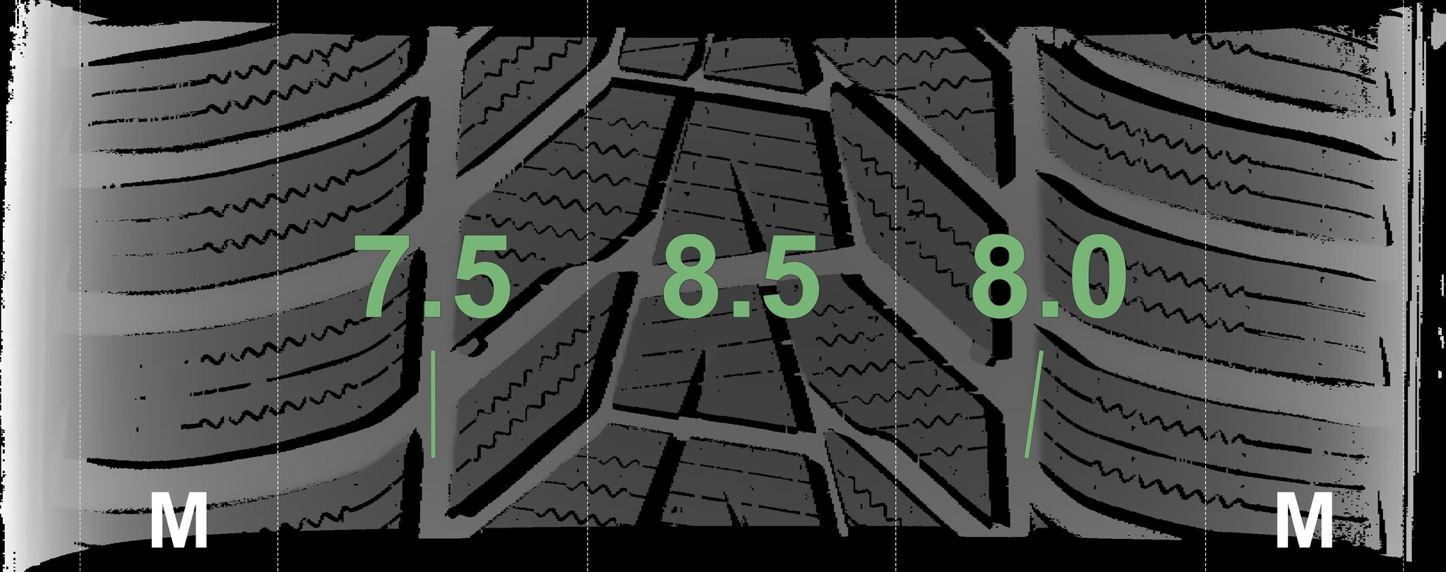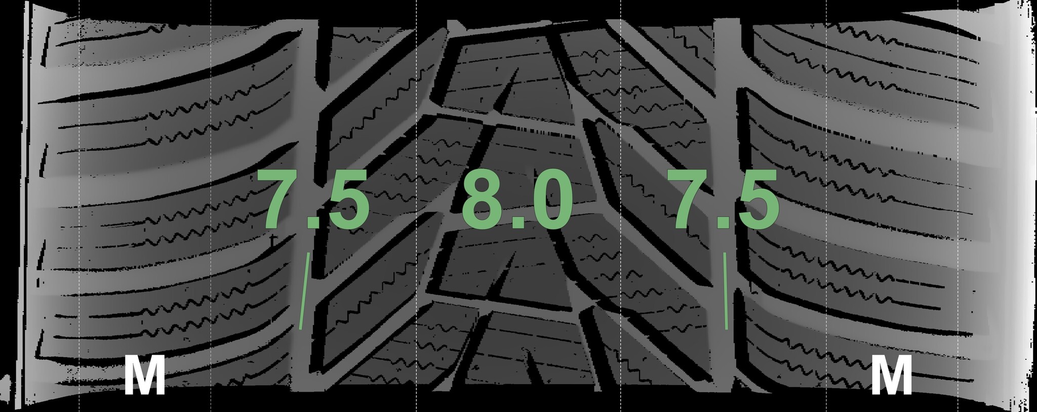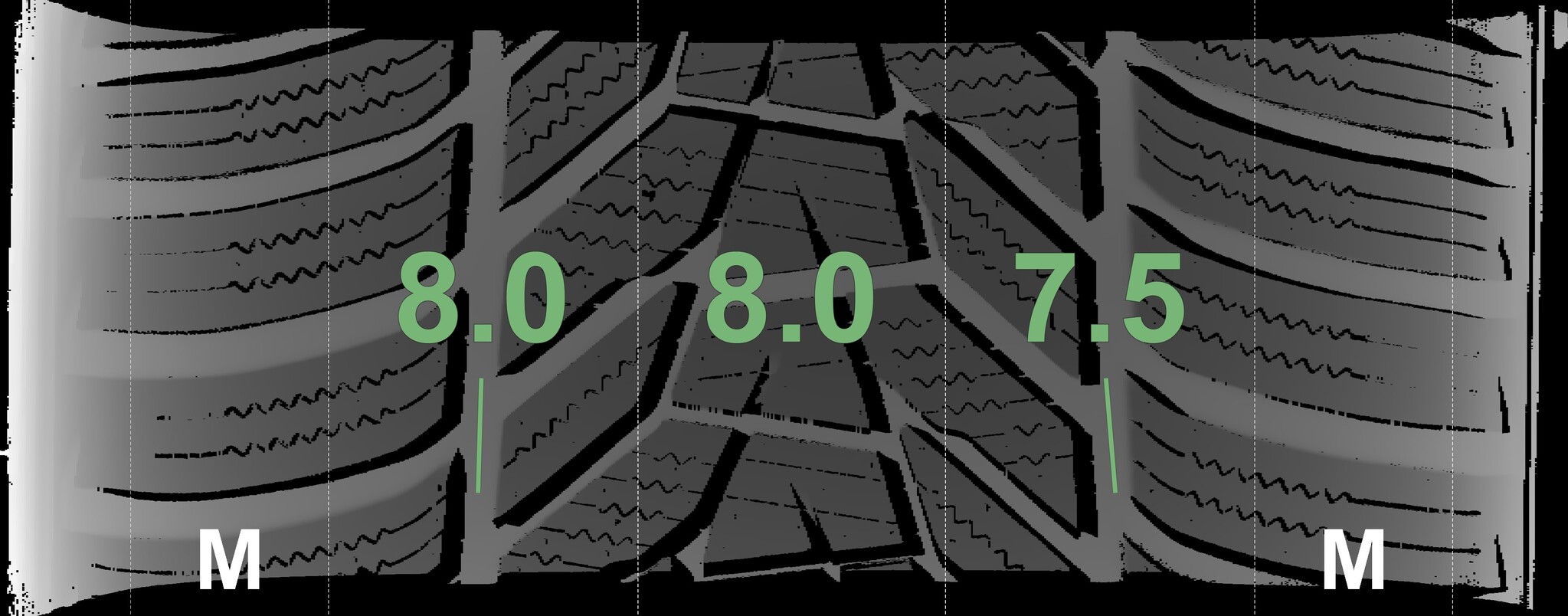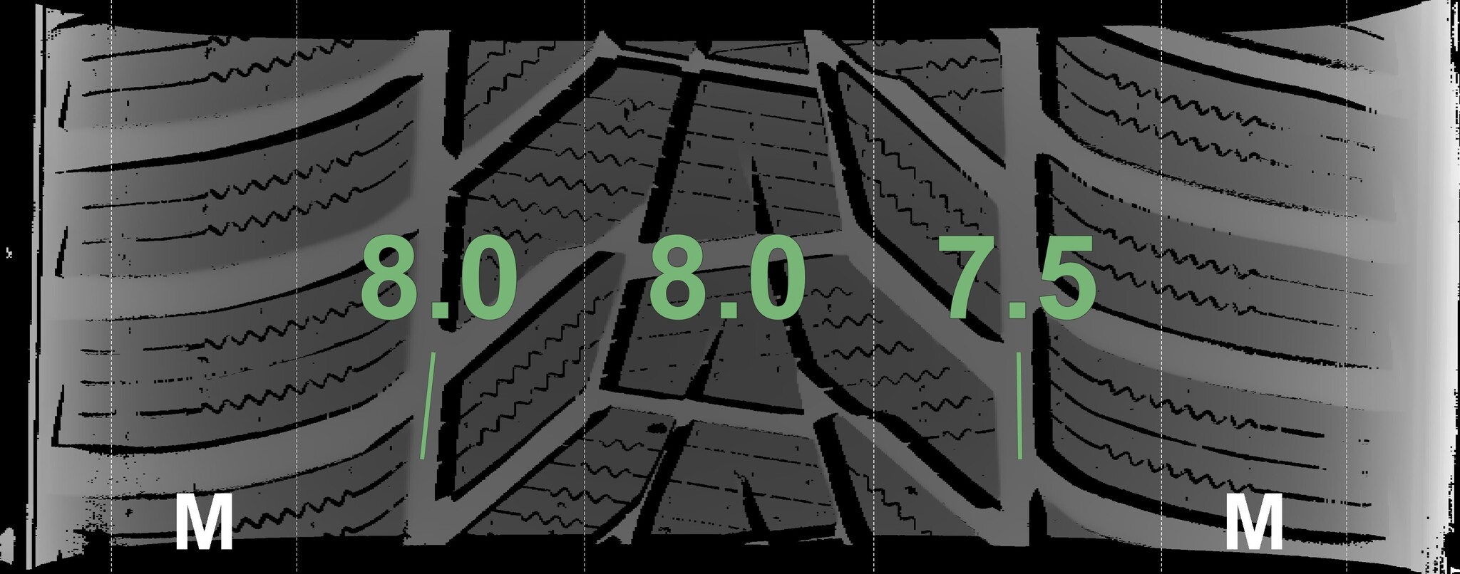 The measured tread depths and the details of the rims are shown above.