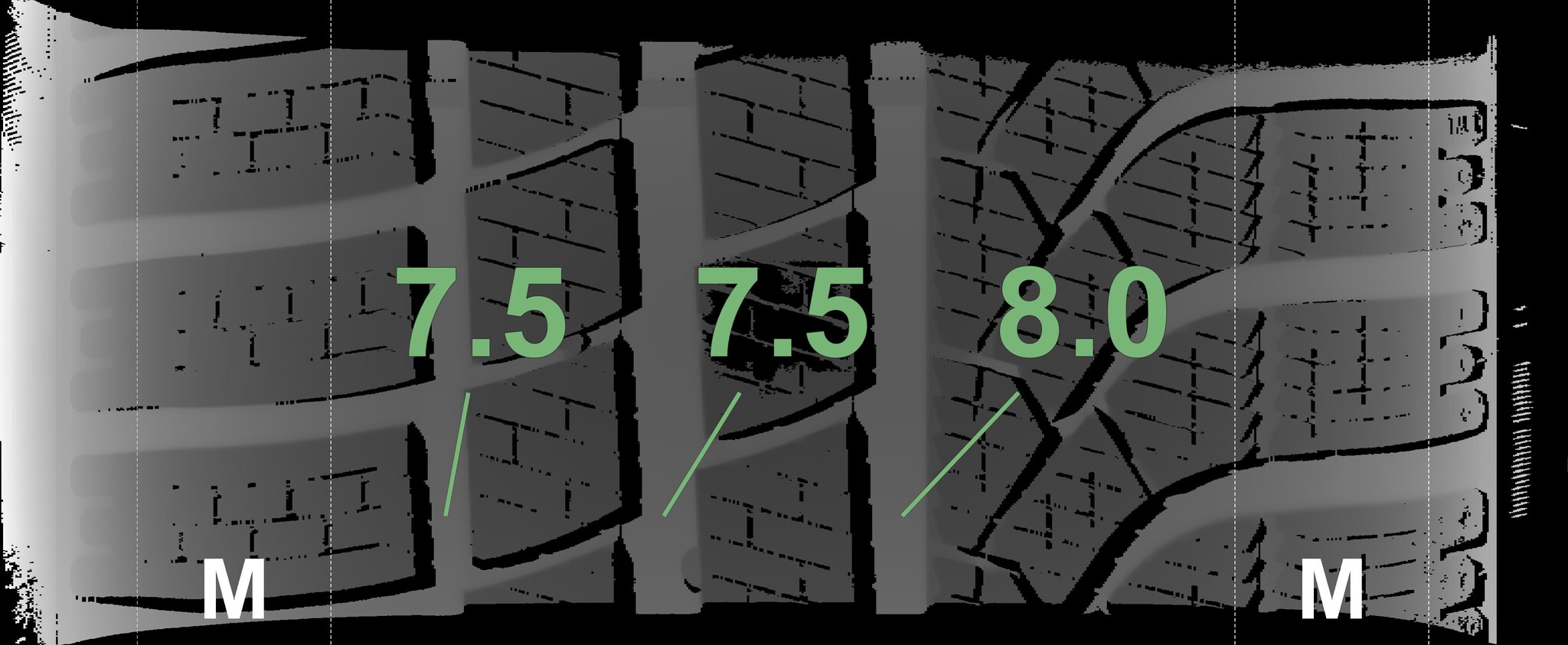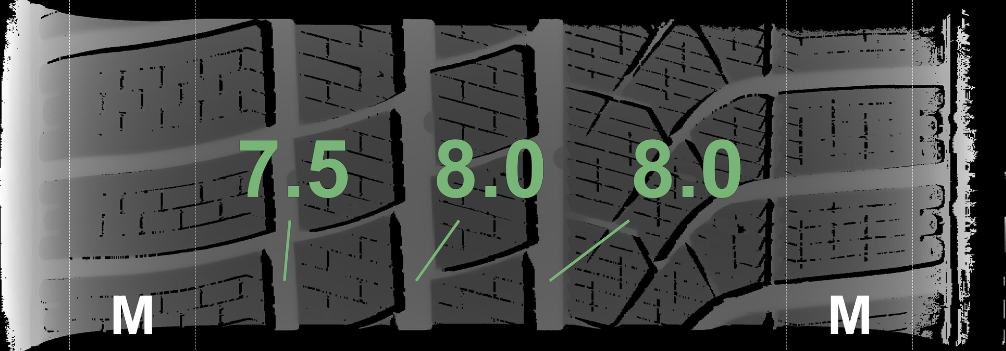 Condition | Profile depth | DOT | Front Left | Demo studs still visible | 7.5 mm | 3923 |