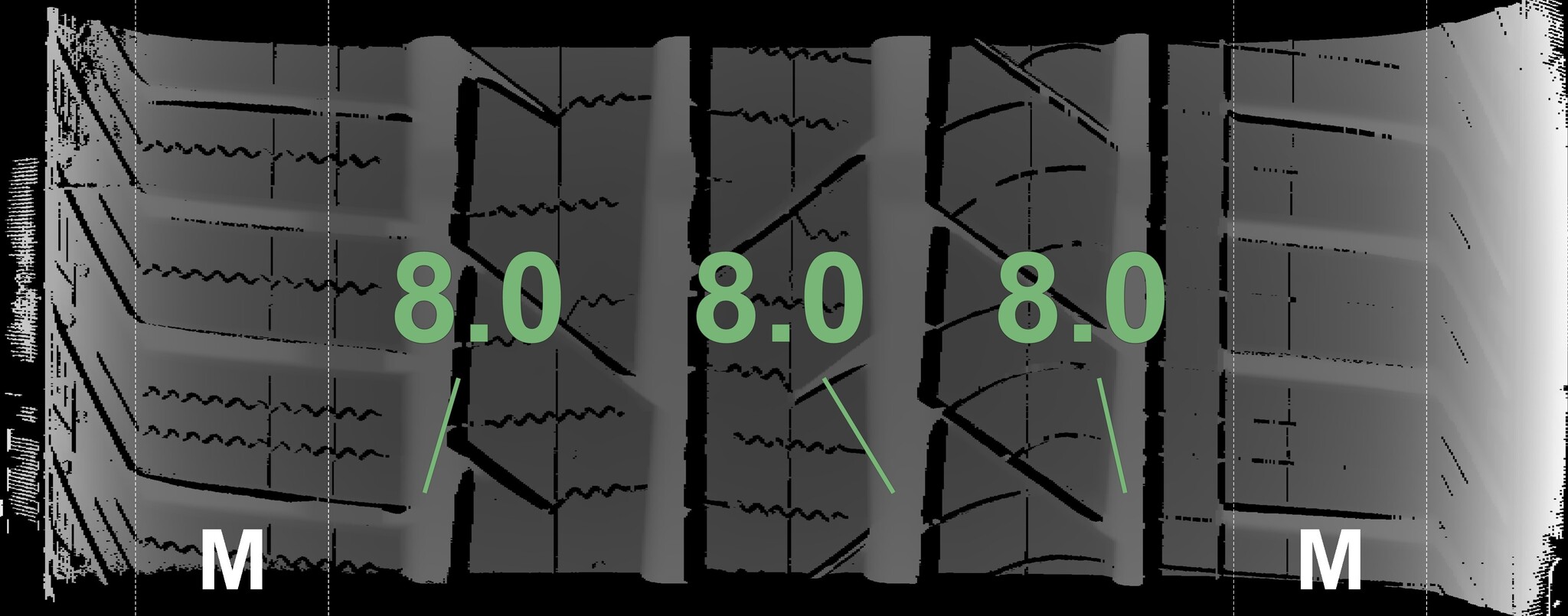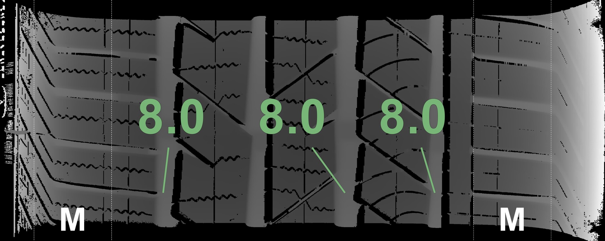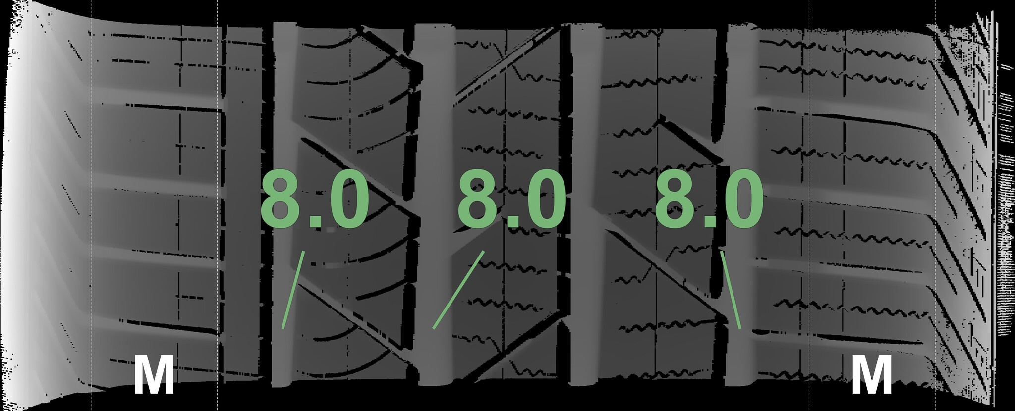 Condition | Profile depth | DOT | Front Left | Demo studs still visible | 8.0 mm | 4622 |