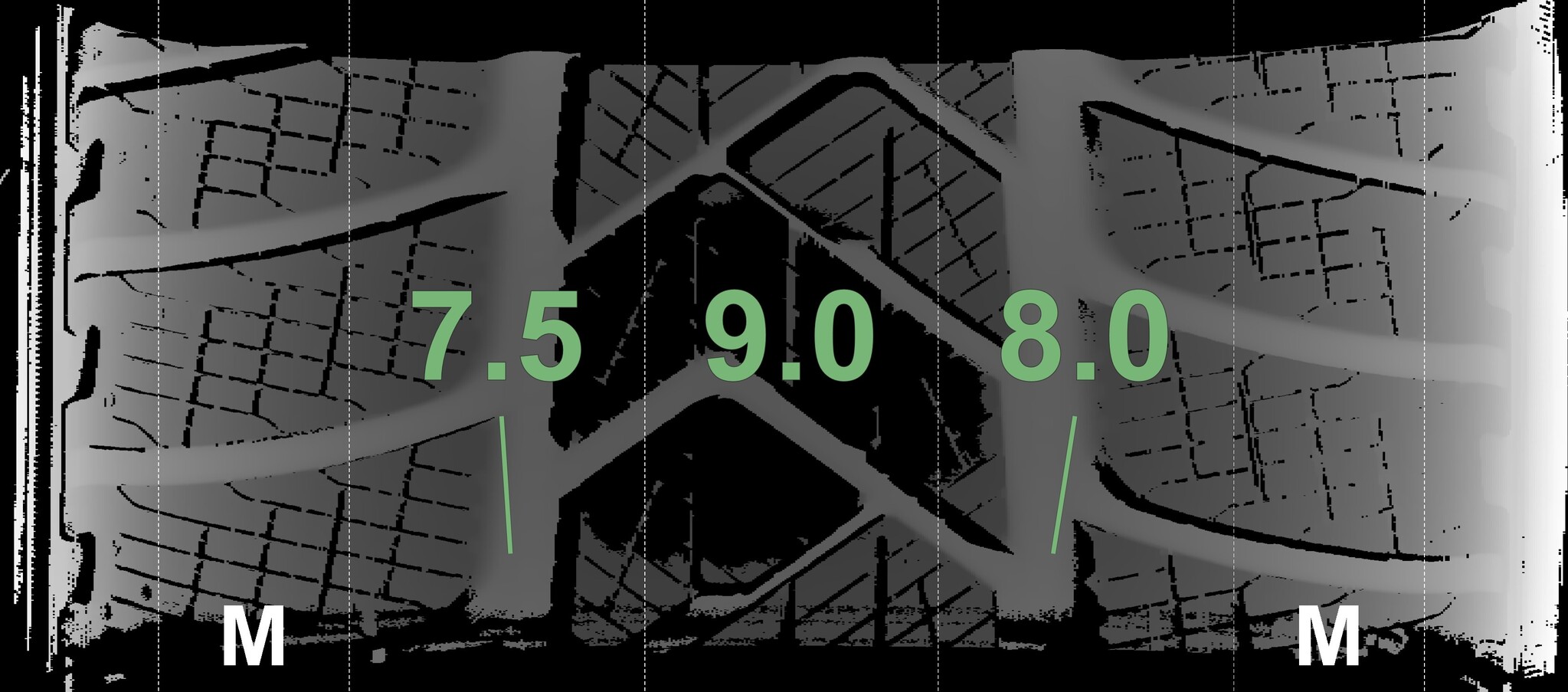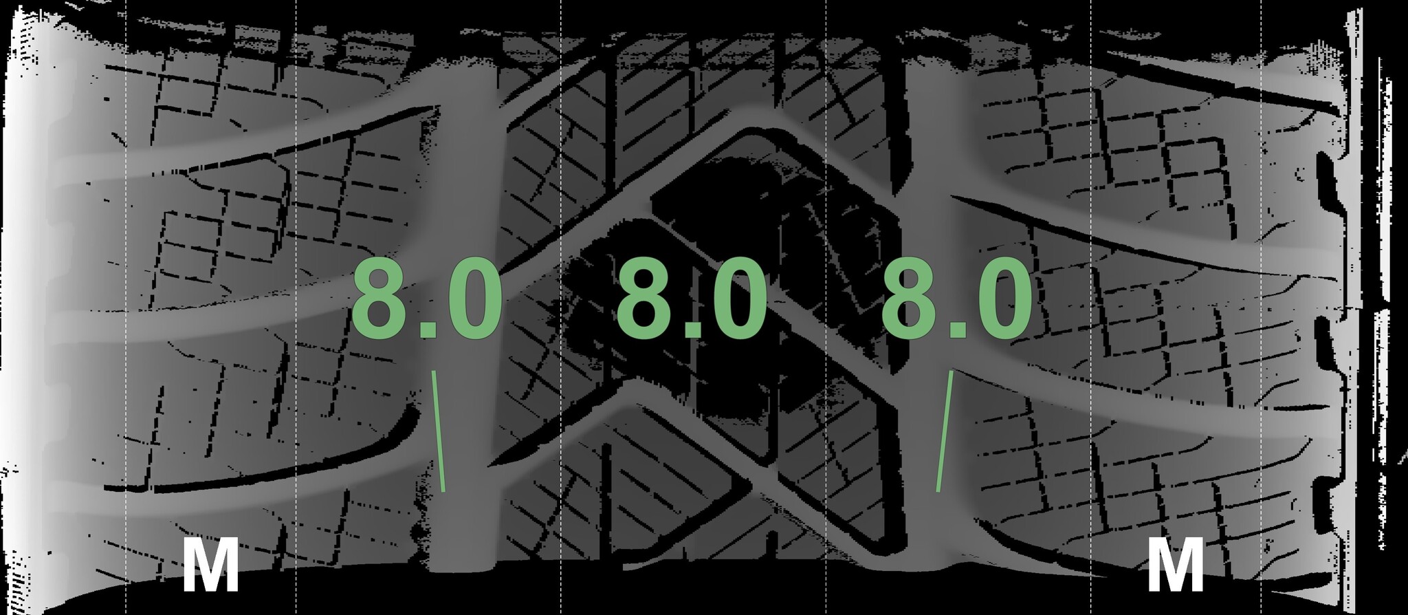 Condition | Profile depth | DOT | Front Left New | 8.0 mm | 1825