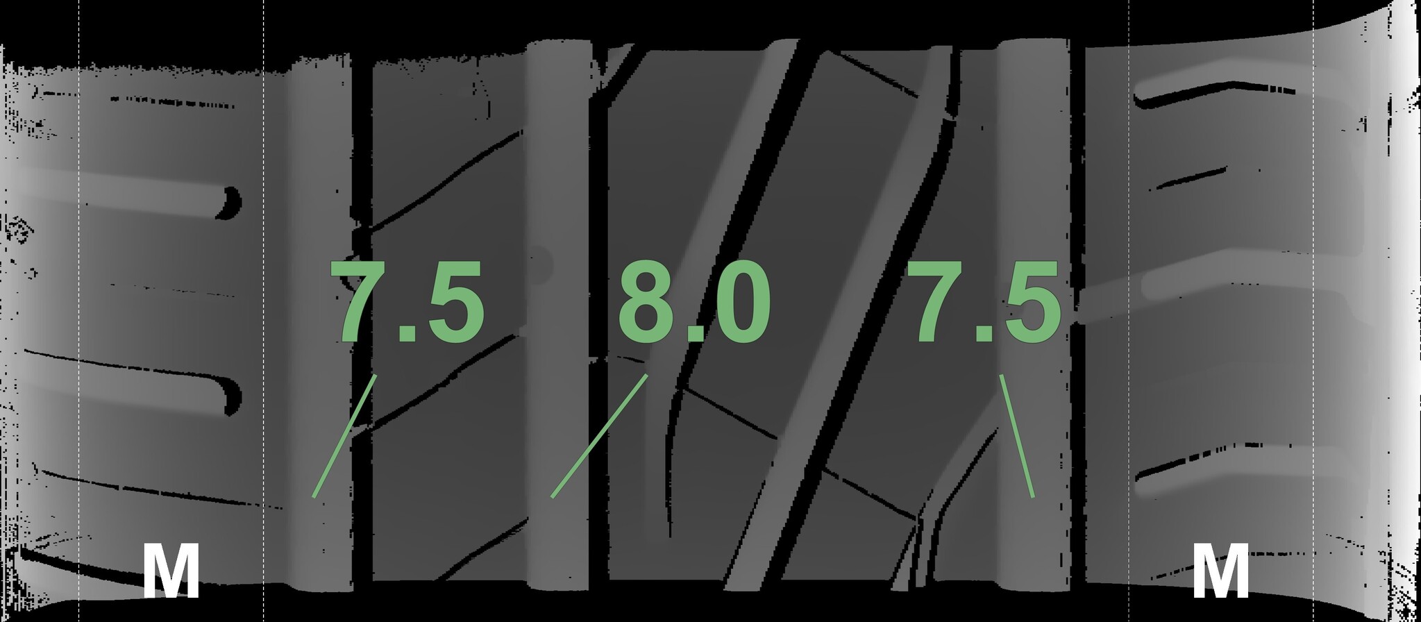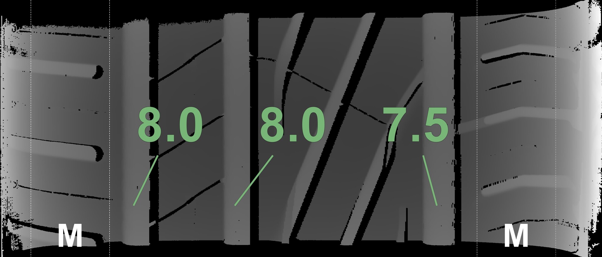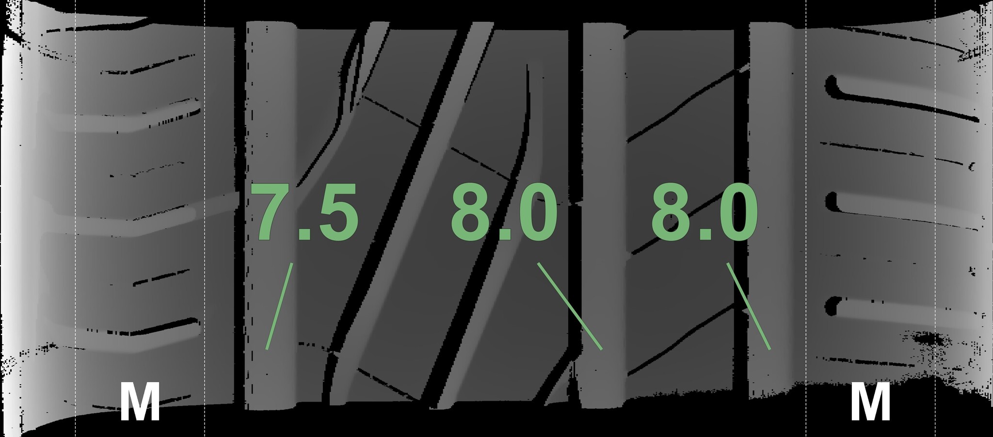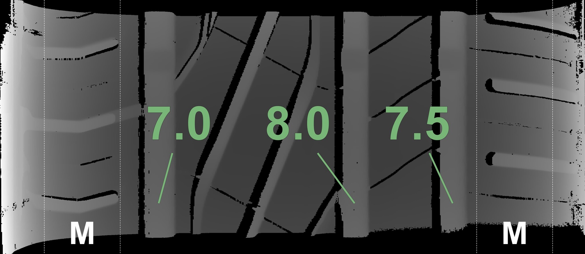 The measured tread depths and details of the rims are shown above.
