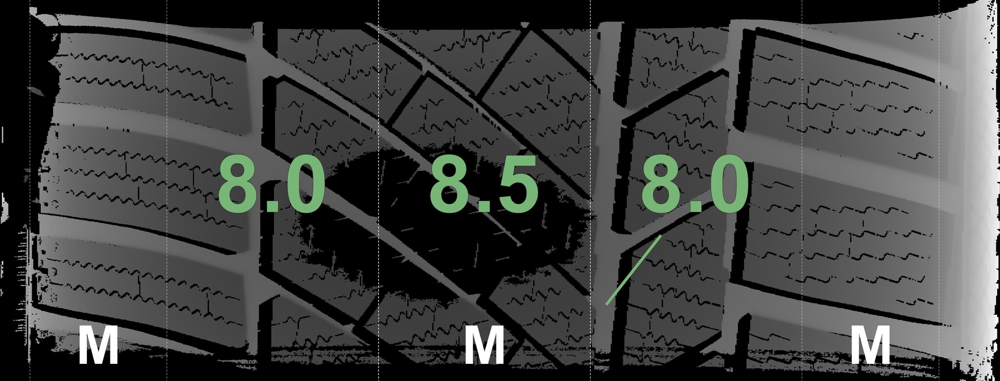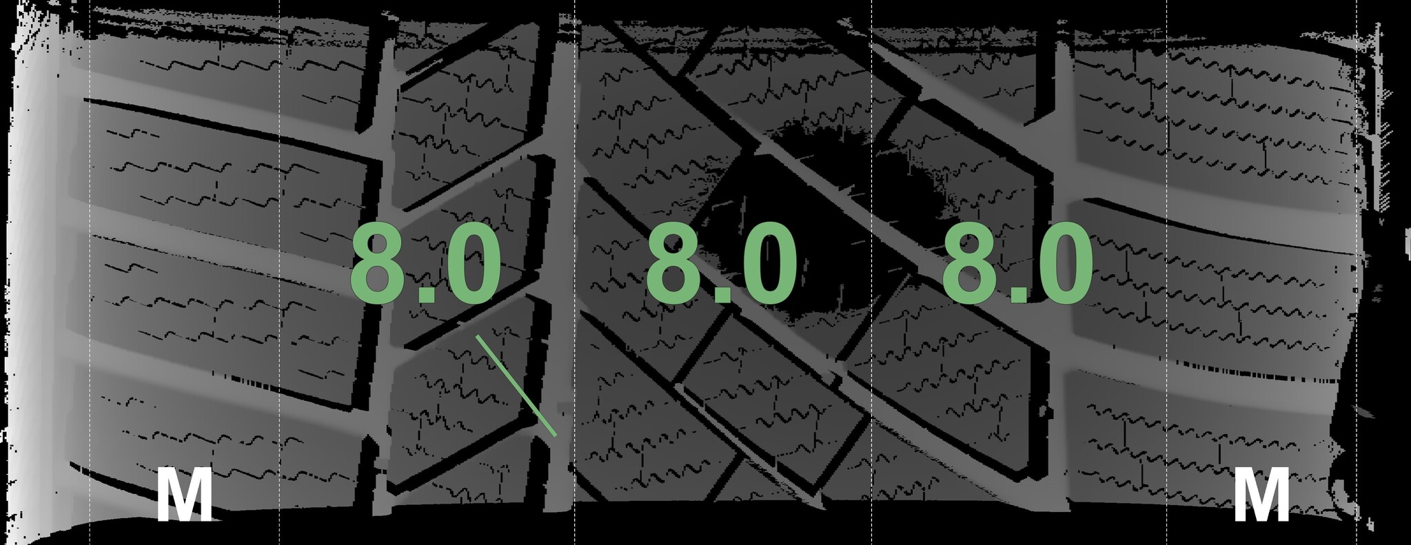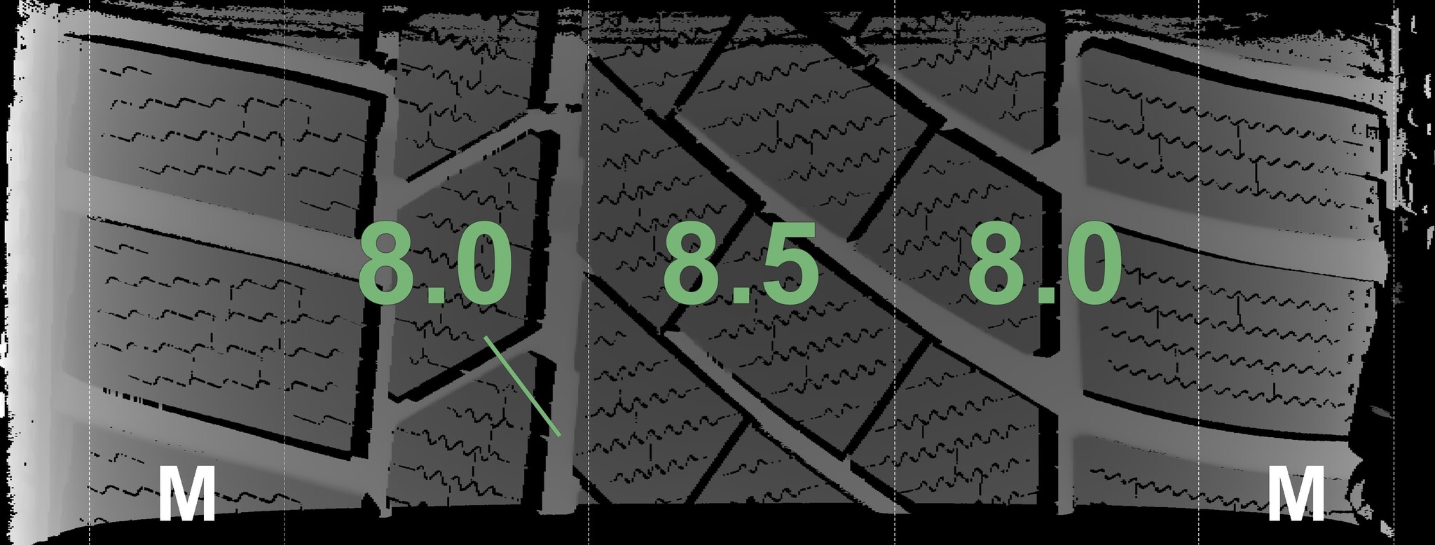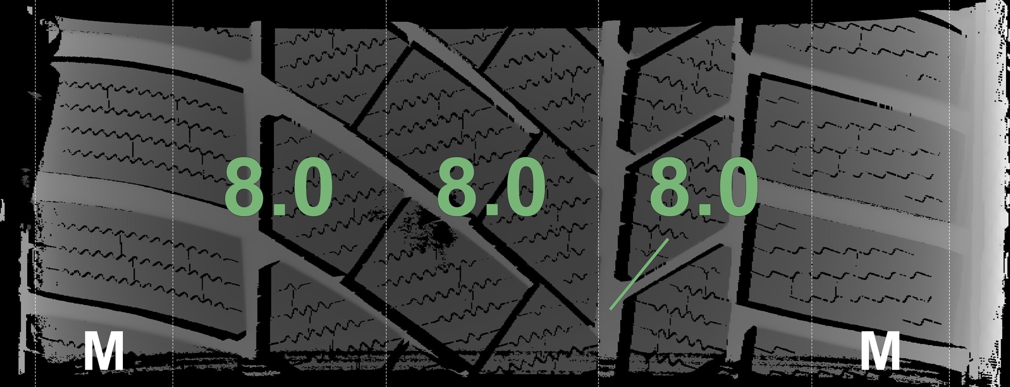 | Condition | Profile depth | DOT | Front Left | Demo knobs still visible | 8.0 mm | 2721 |