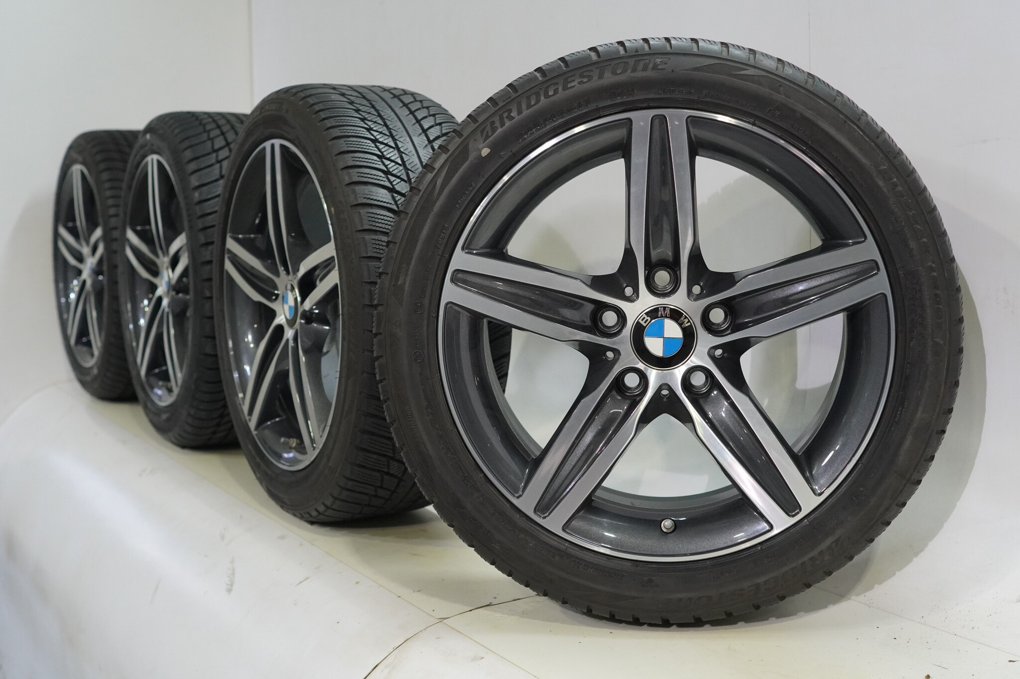 Original BMW wheel set, styling 379, 17-inch rims with Bridgestone BLIZZAK LM001 Runflat Winter Tires. These rims are original BMW rims and suitable for: BMW 1 2 series F20 F21 F22 F23.