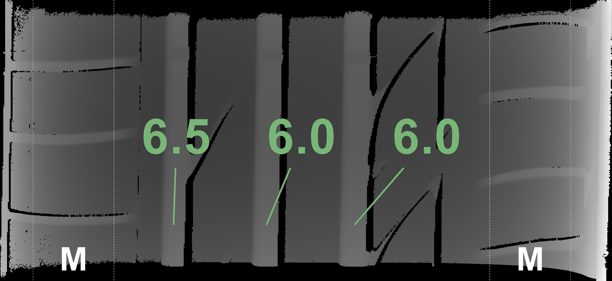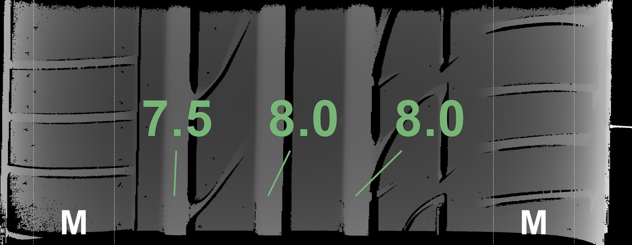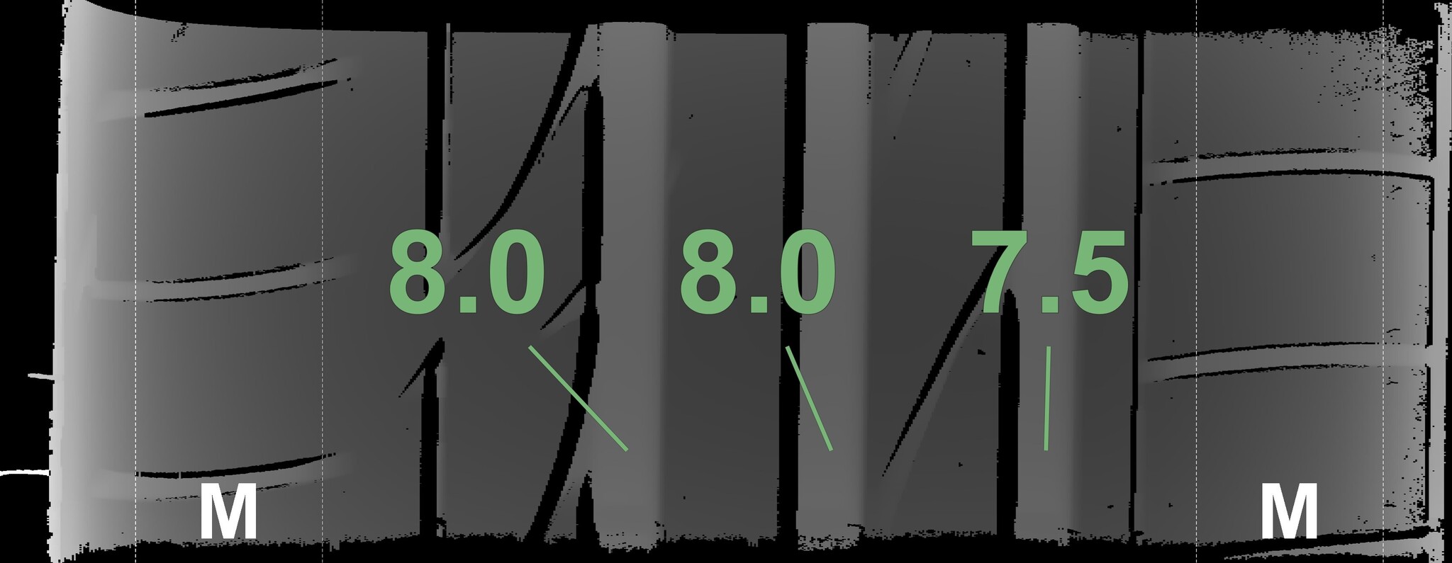 The measured tread depths and the details of the rims are shown above.