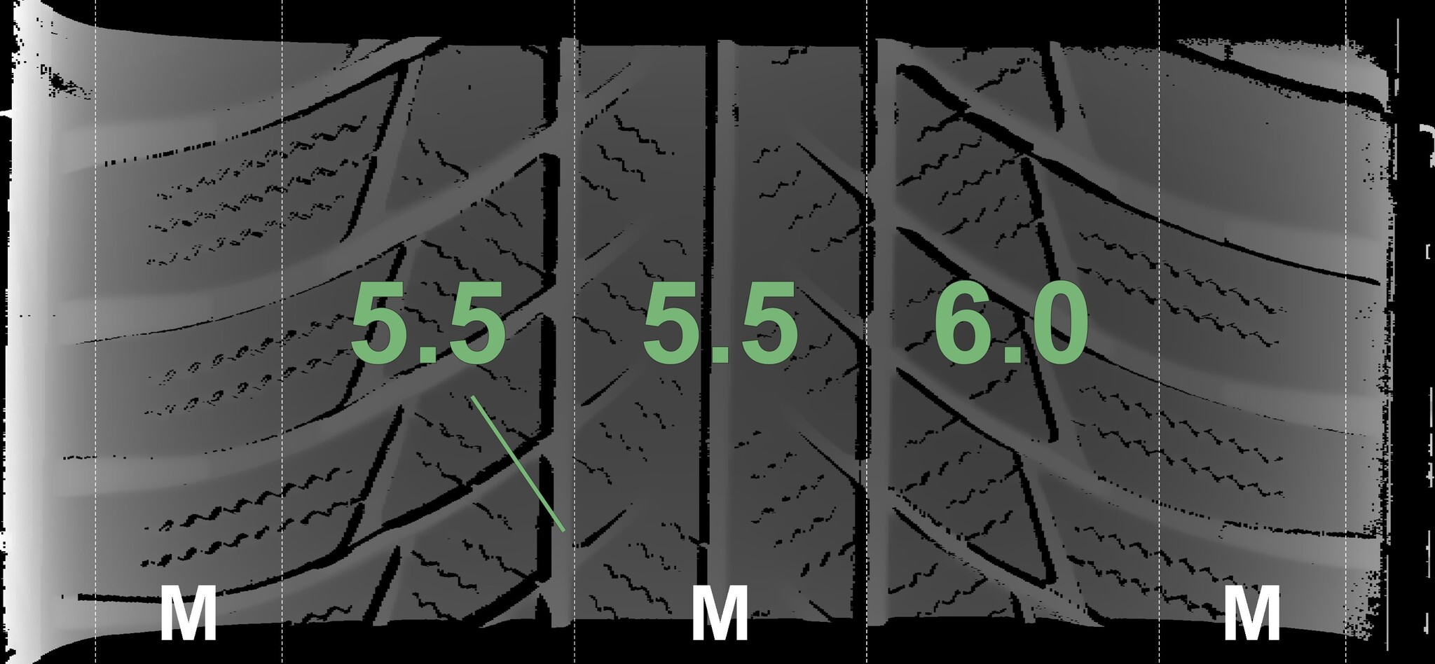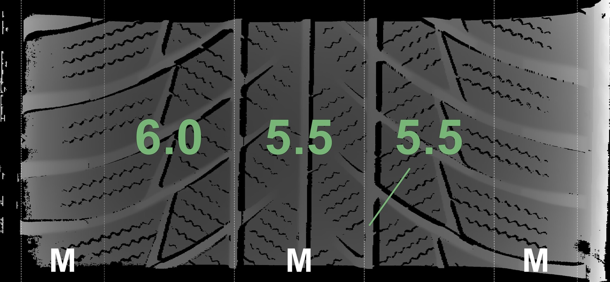 | Condition | Profile depth | DOT | Front Left | Used | 5.5 mm | 2919 |