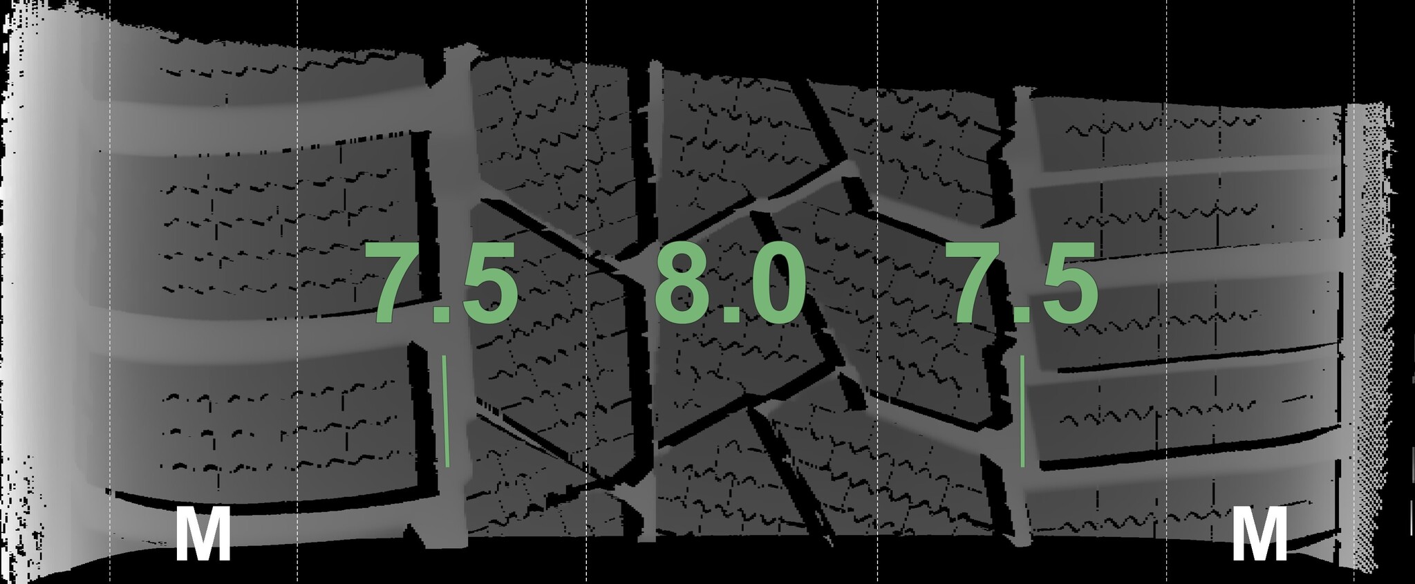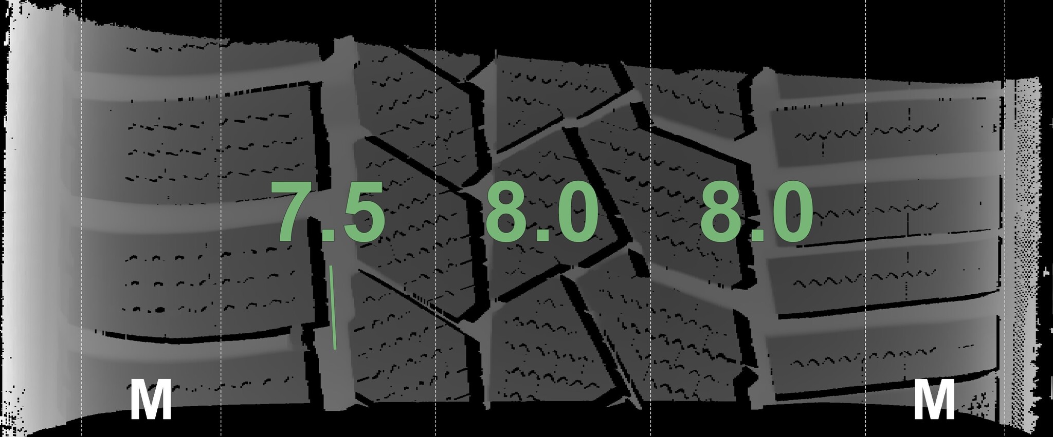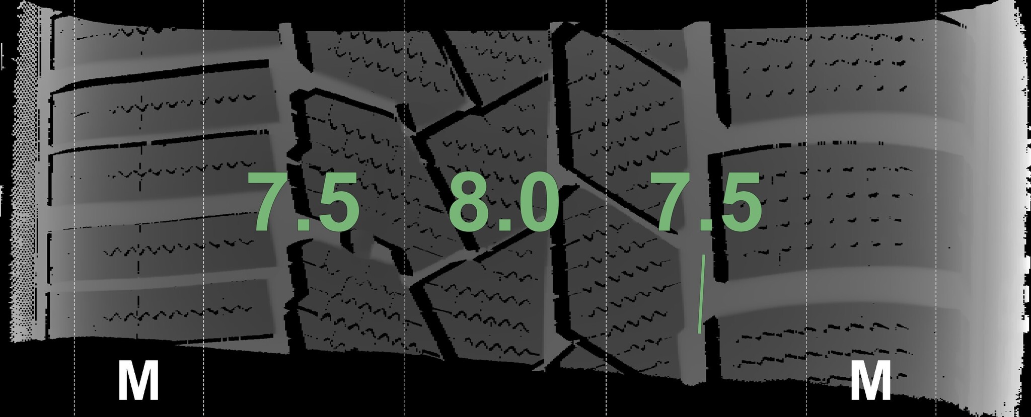 The measured tread depths and the details of the rims are shown above.