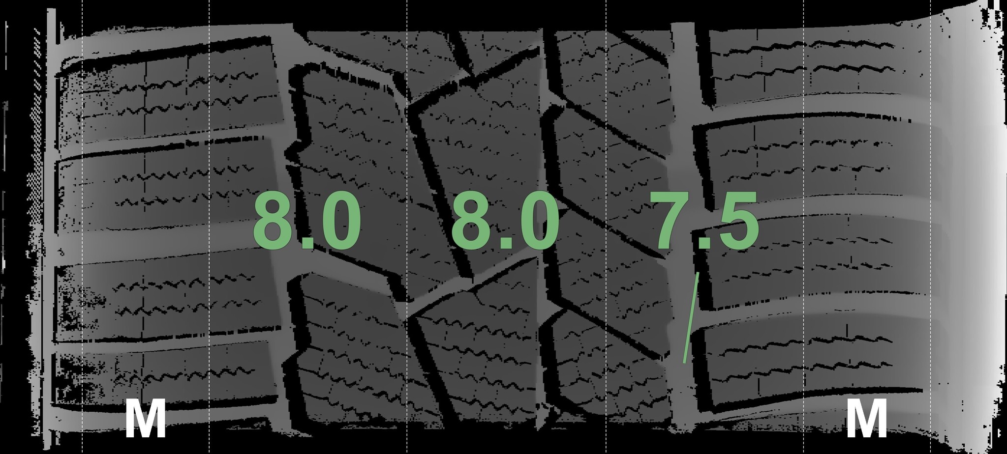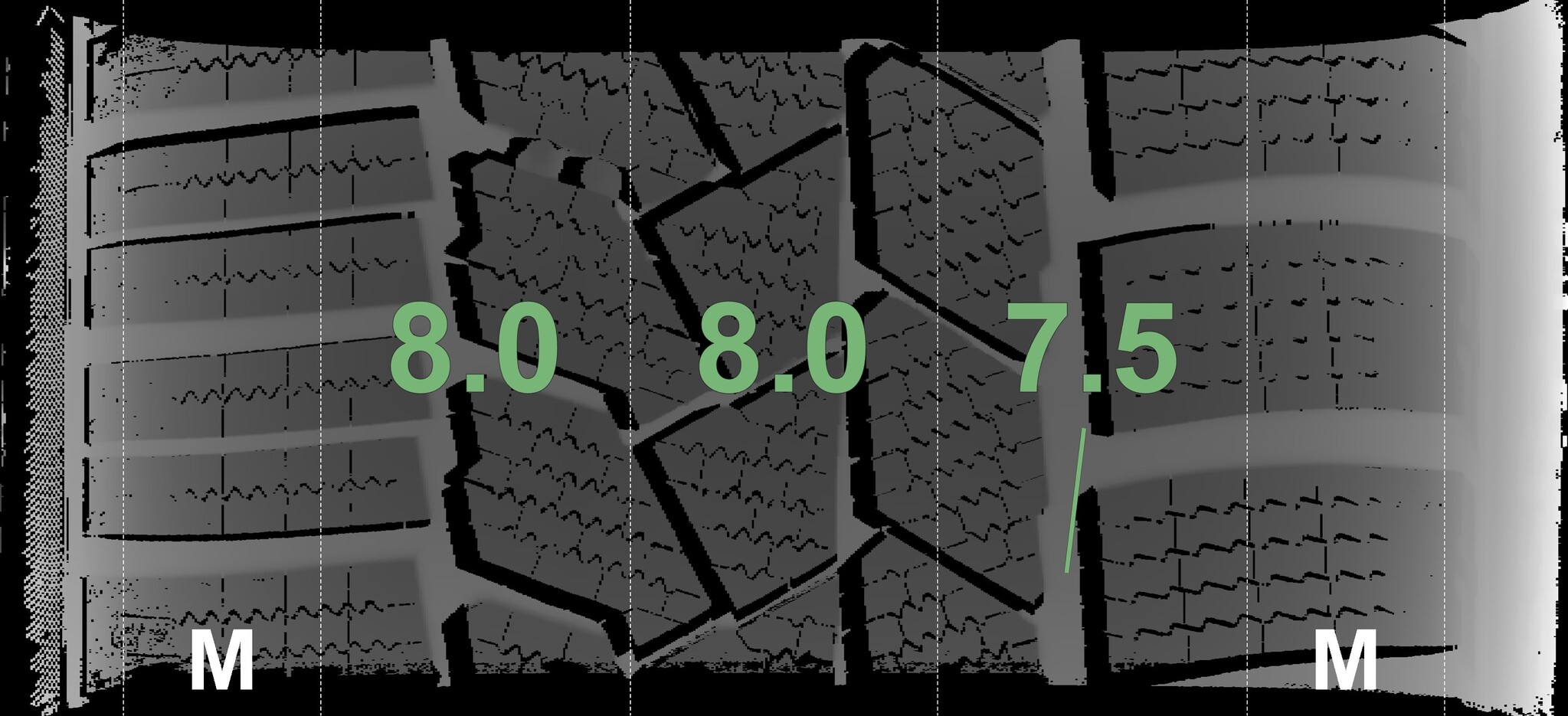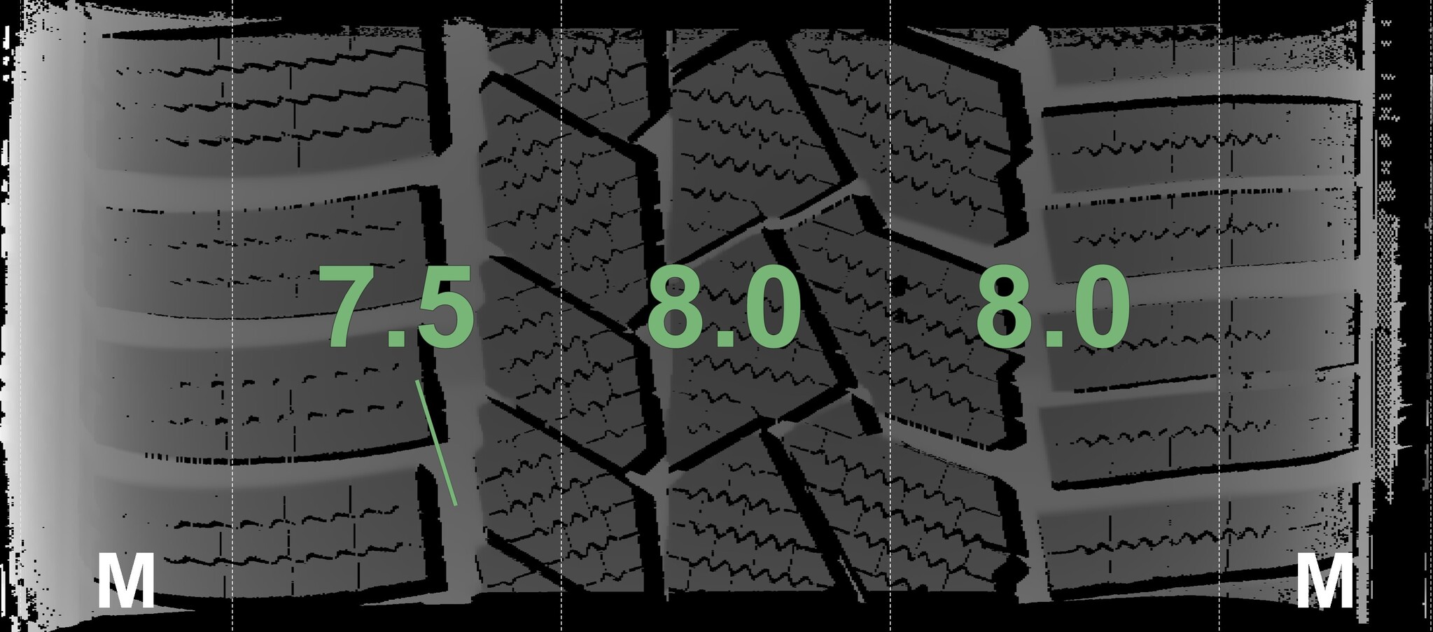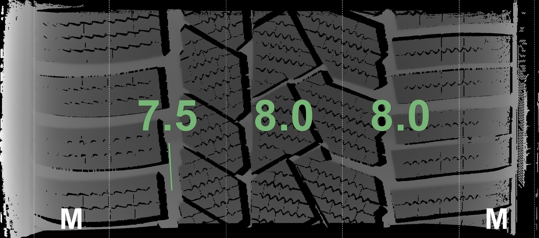 | Condition | Profile depth | DOT | Front Left | Used | 7.5 mm | 3920 |
