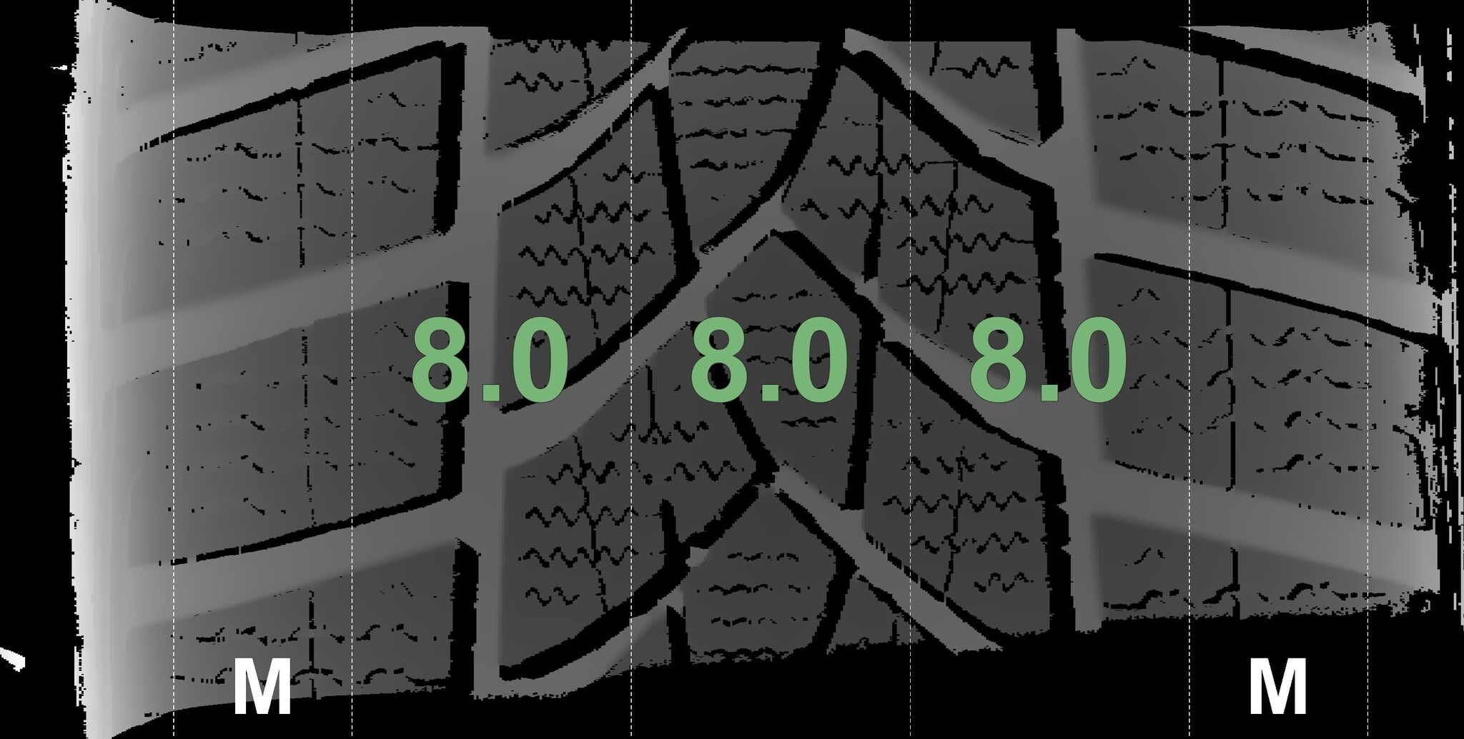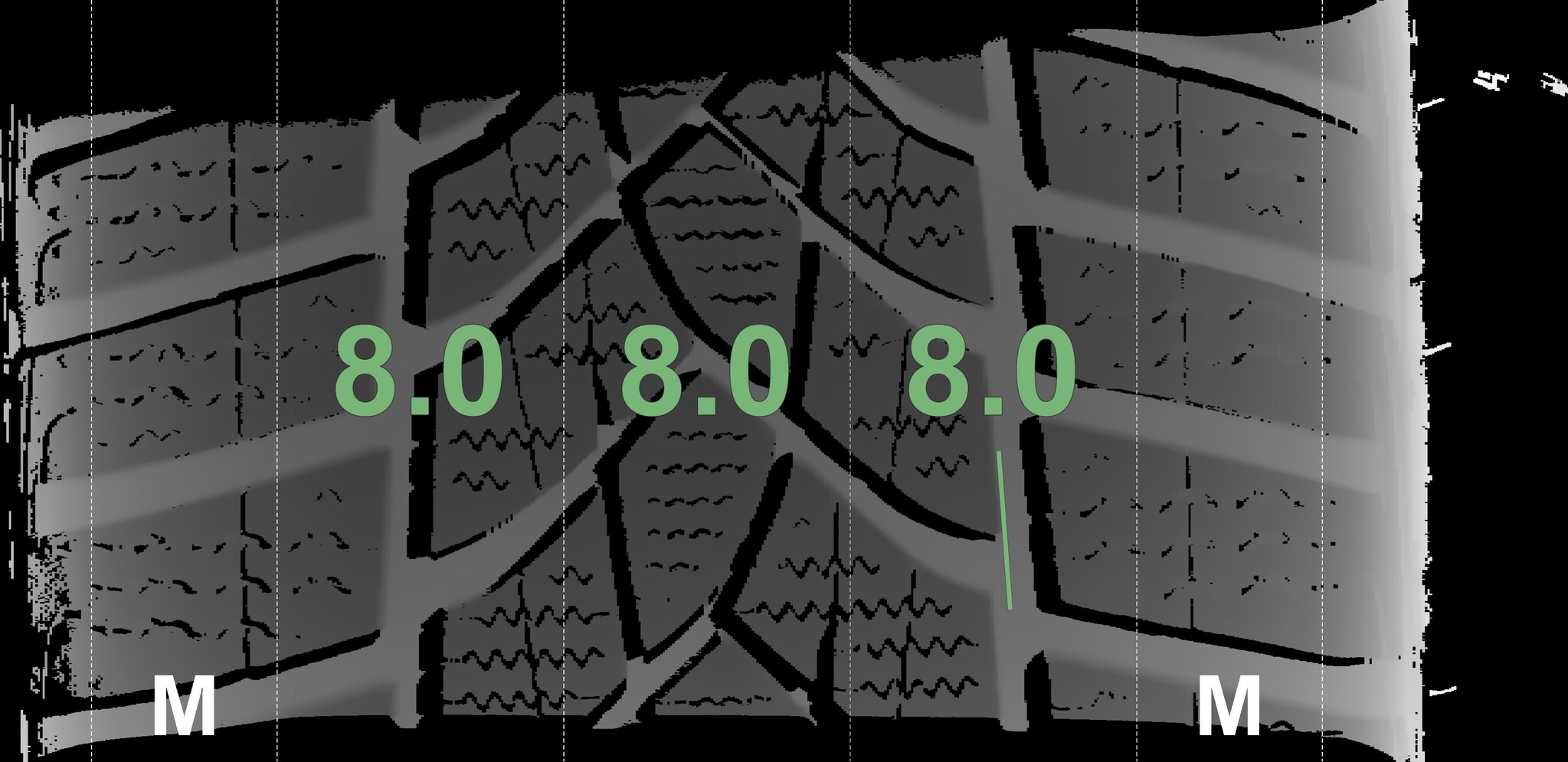 | Condition | Profile depth | DOT | Front Left | Used | 8.0 mm | 3621 |