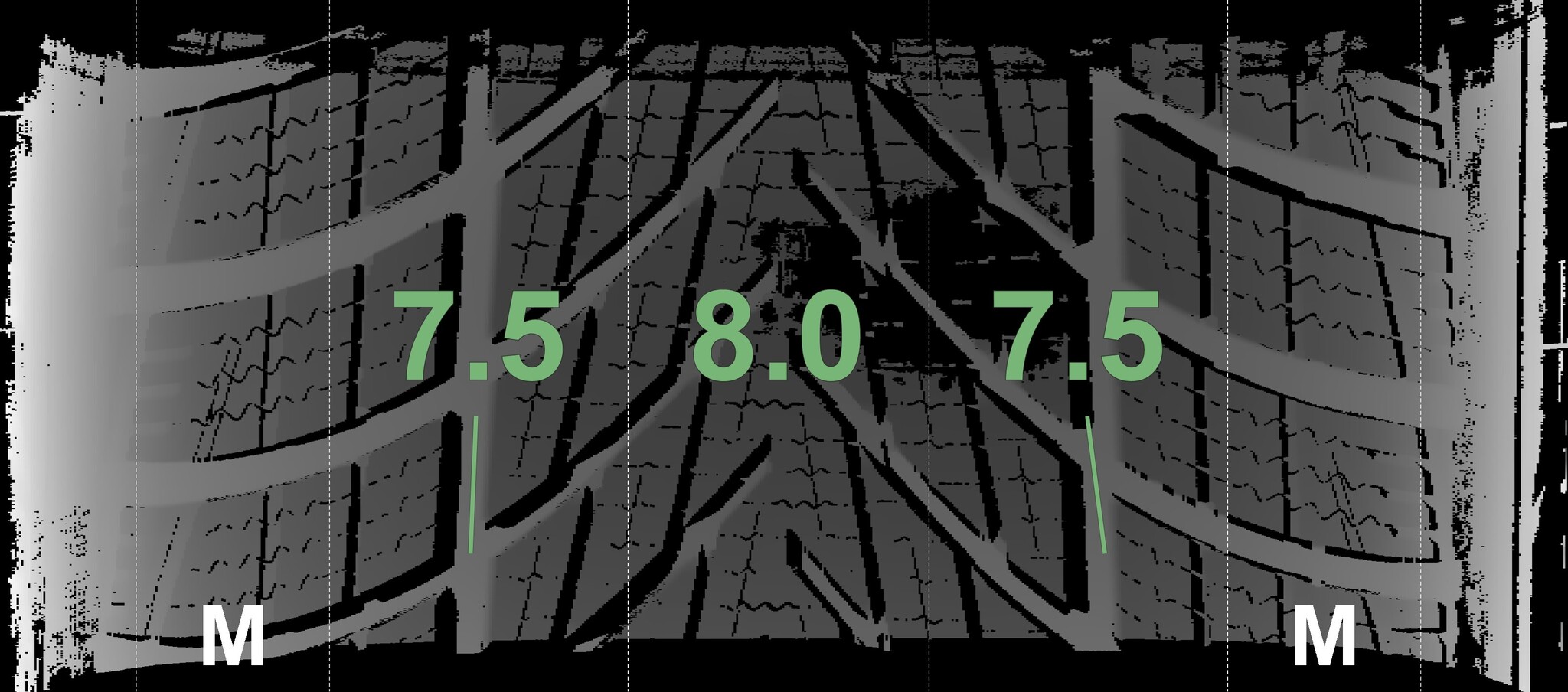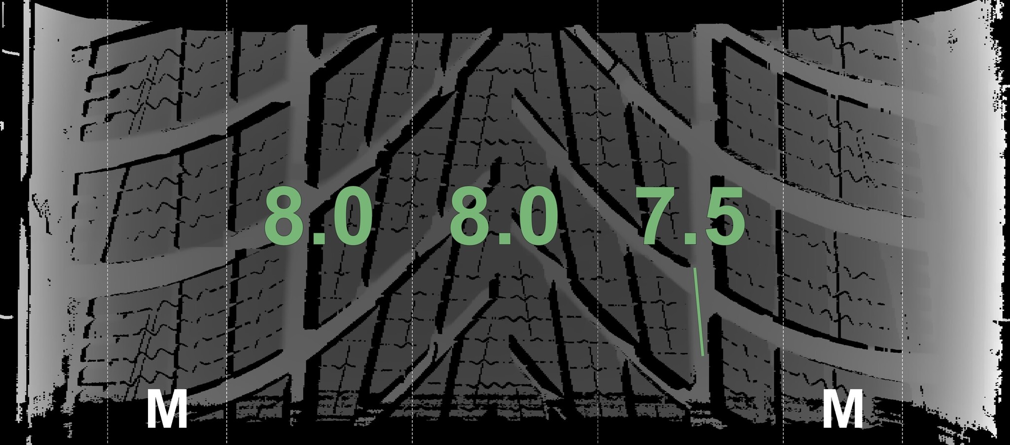 | Condition | Profile depth | DOT | Front Left | Used | 7.2 mm | 3725 |