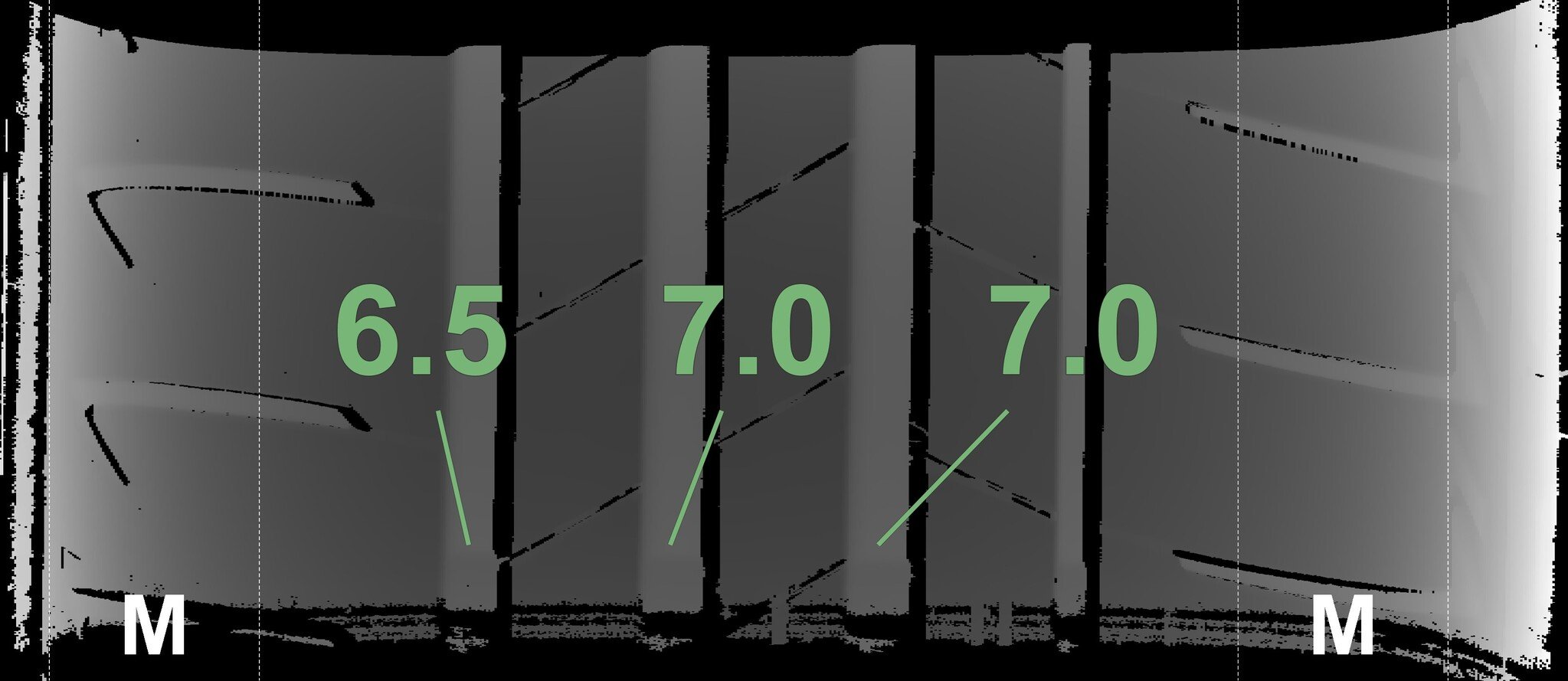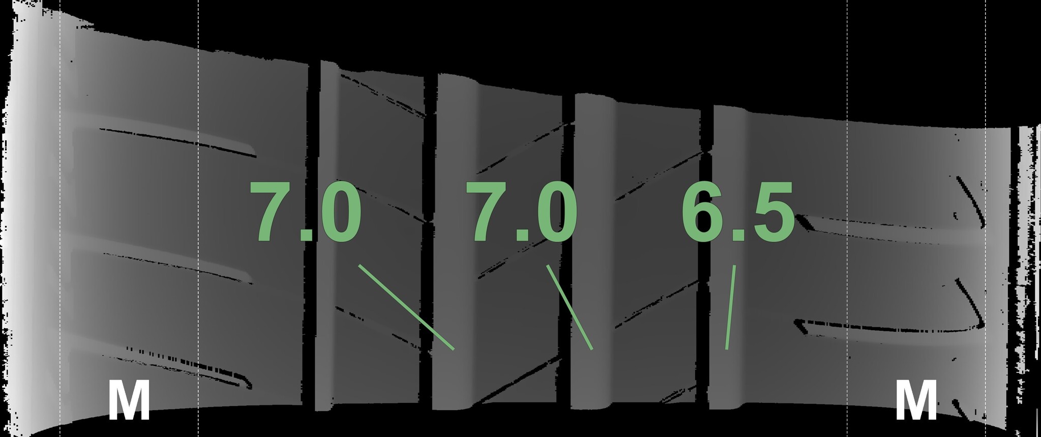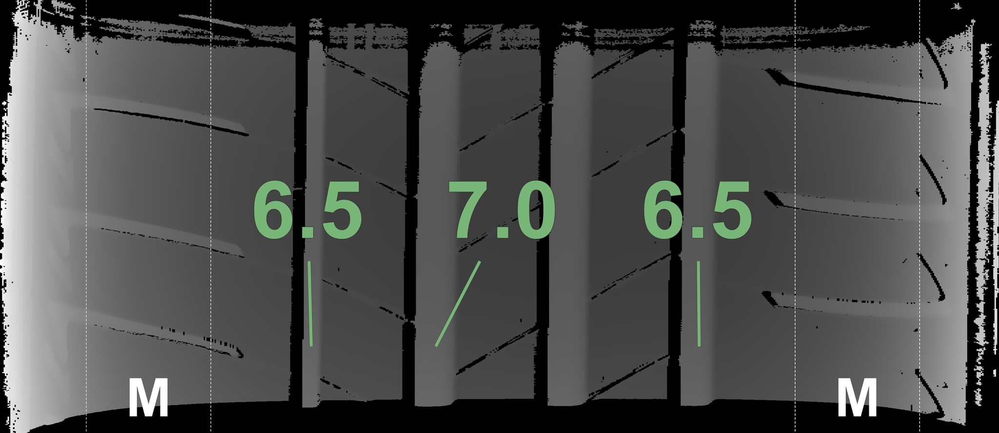 The measured tread depths and the details of the rims are shown above.