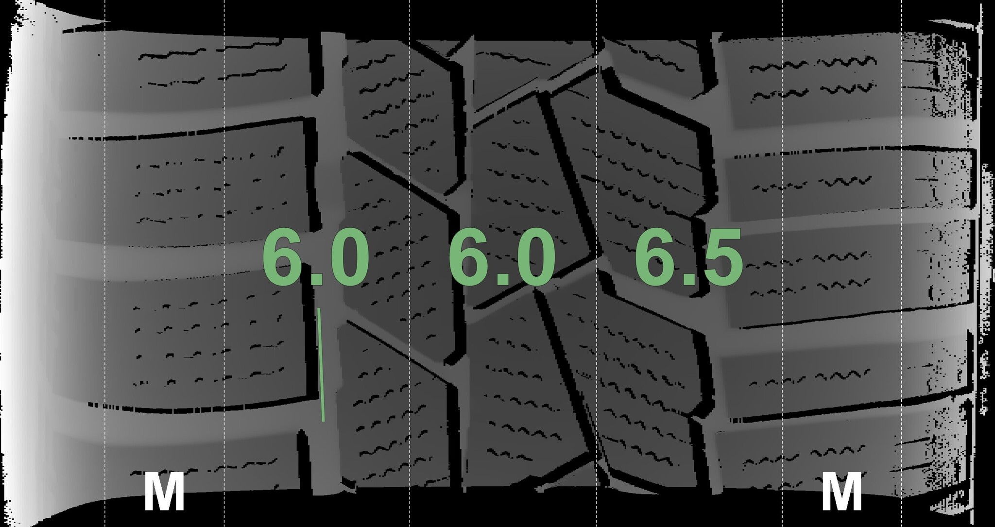 | Condition | Profile depth | DOT | Front Left | Used | 6.2 mm | 3121 |