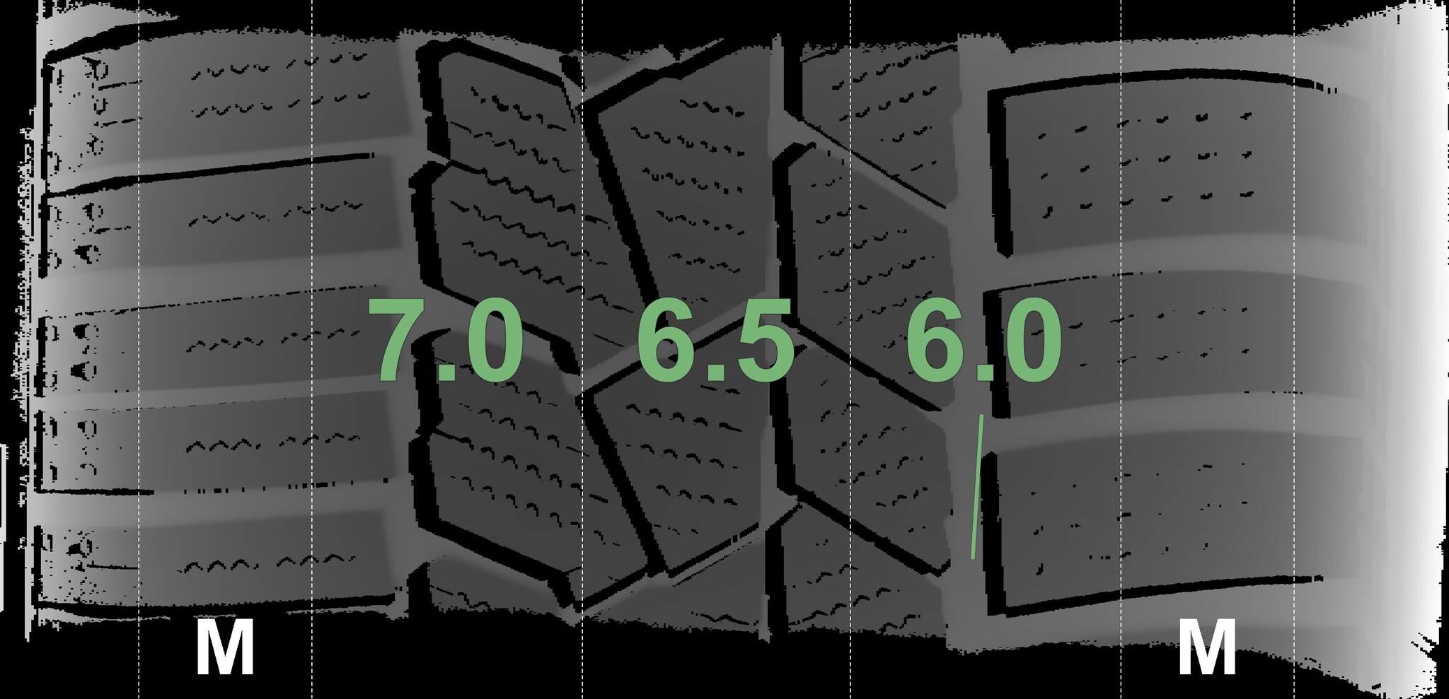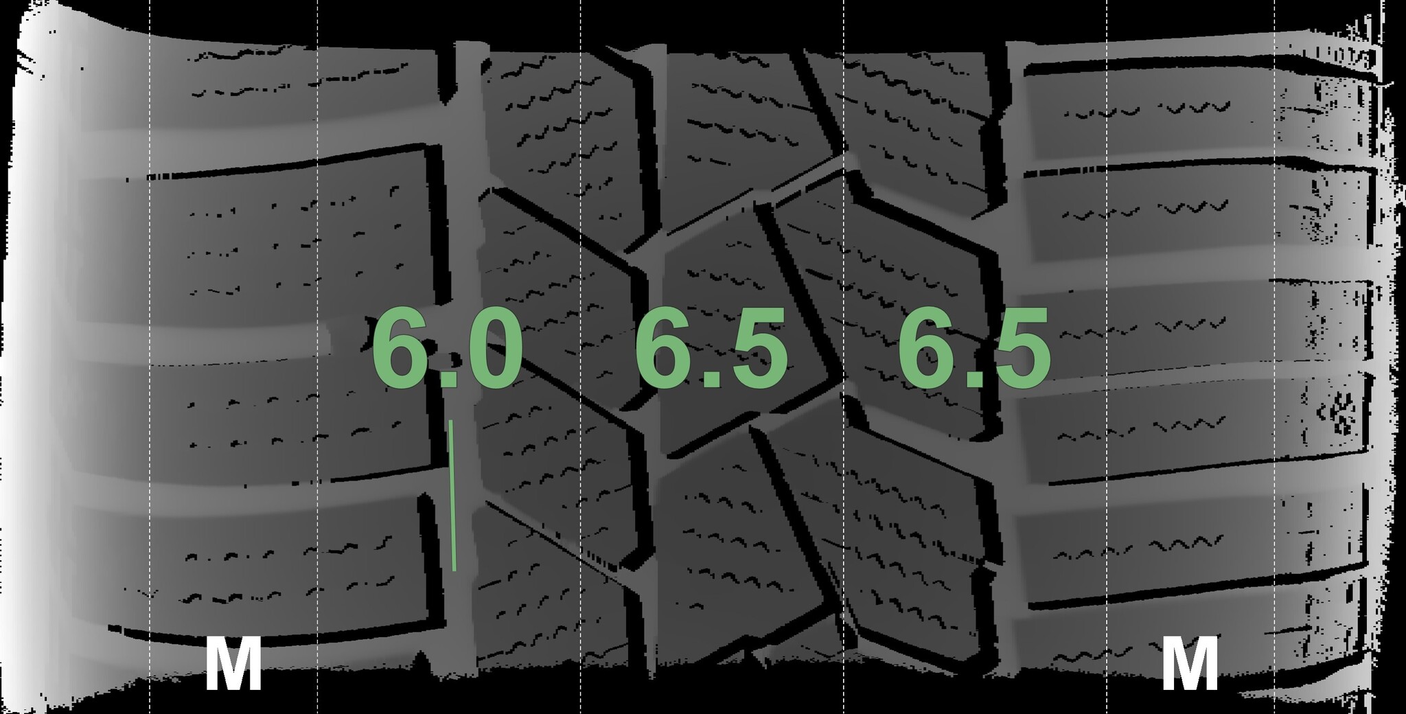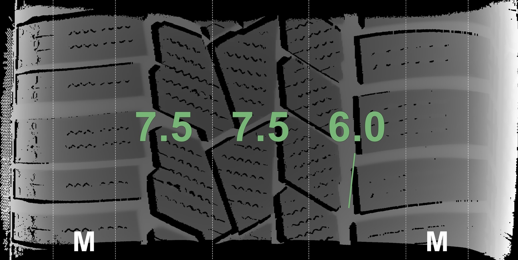 | Condition | Profile depth | DOT | Front Right | Used | 6.5 mm | 4120 |