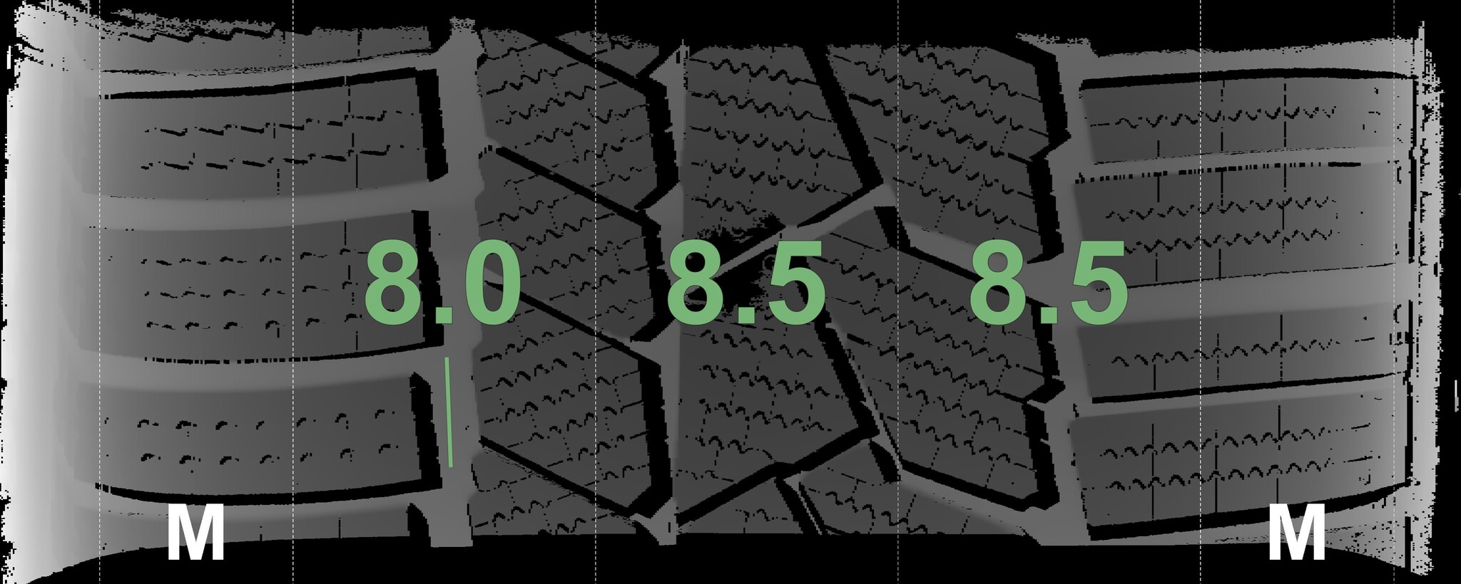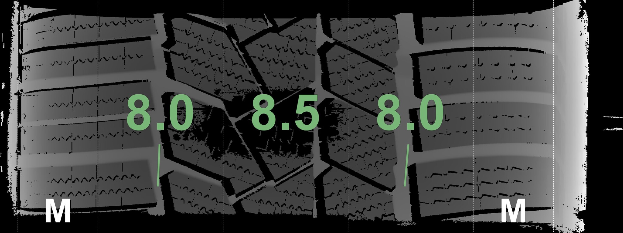 Condition | Profile depth | DOT | Front Left New | 8.0 mm | 2625