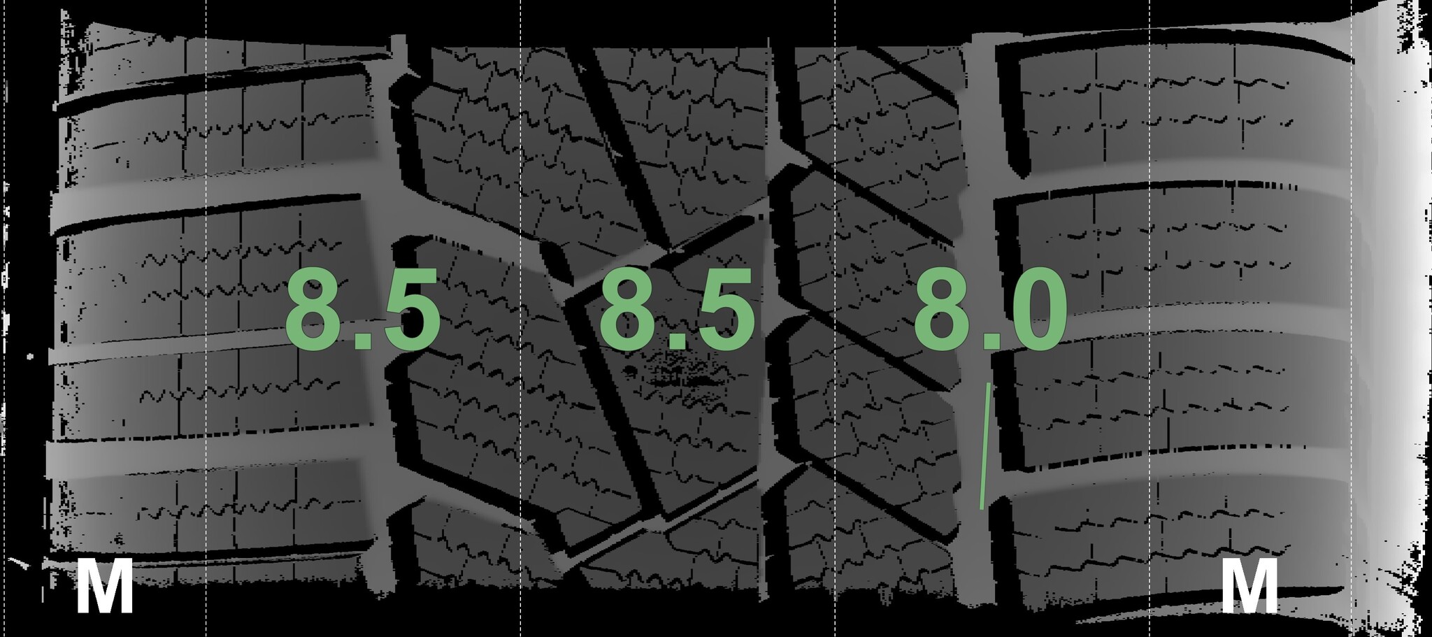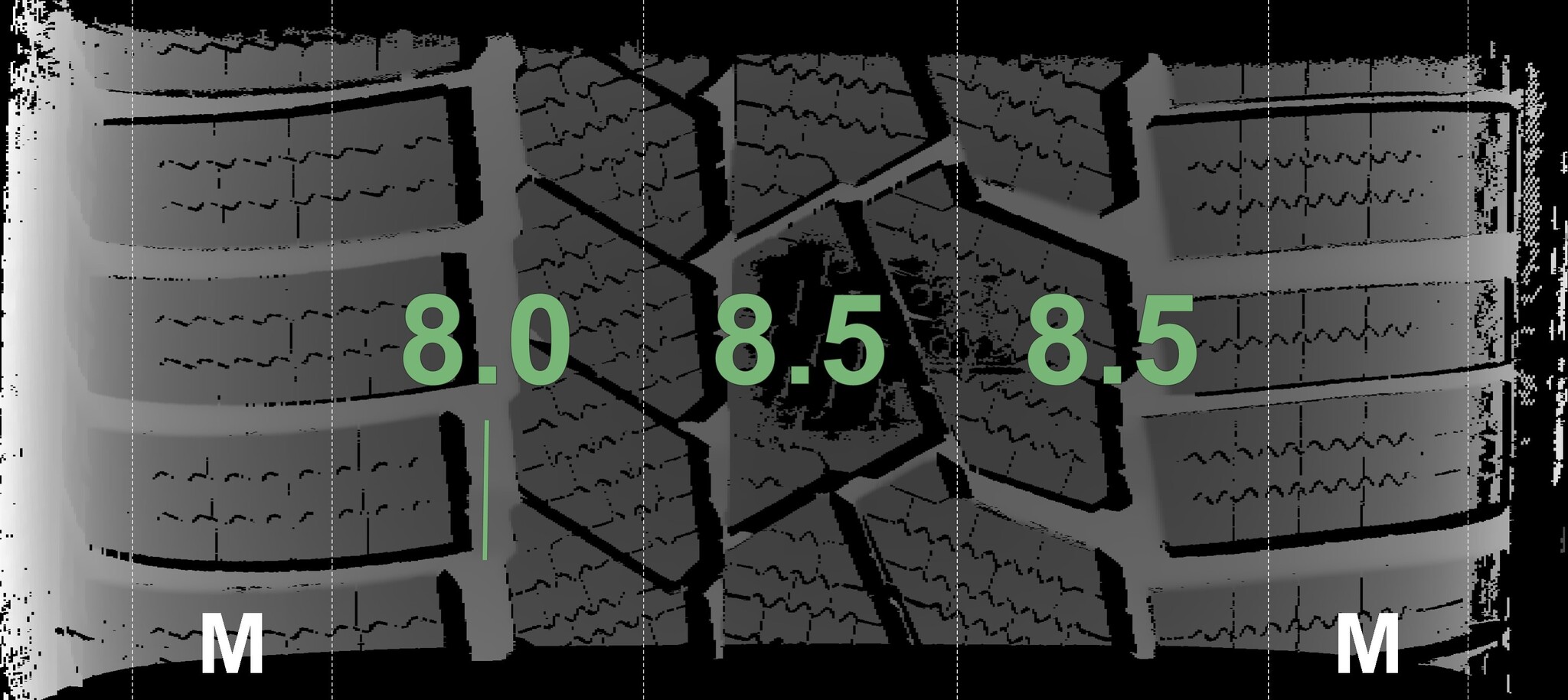 Condition | Profile depth | DOT | Front Right New | 8.0 mm | 2625