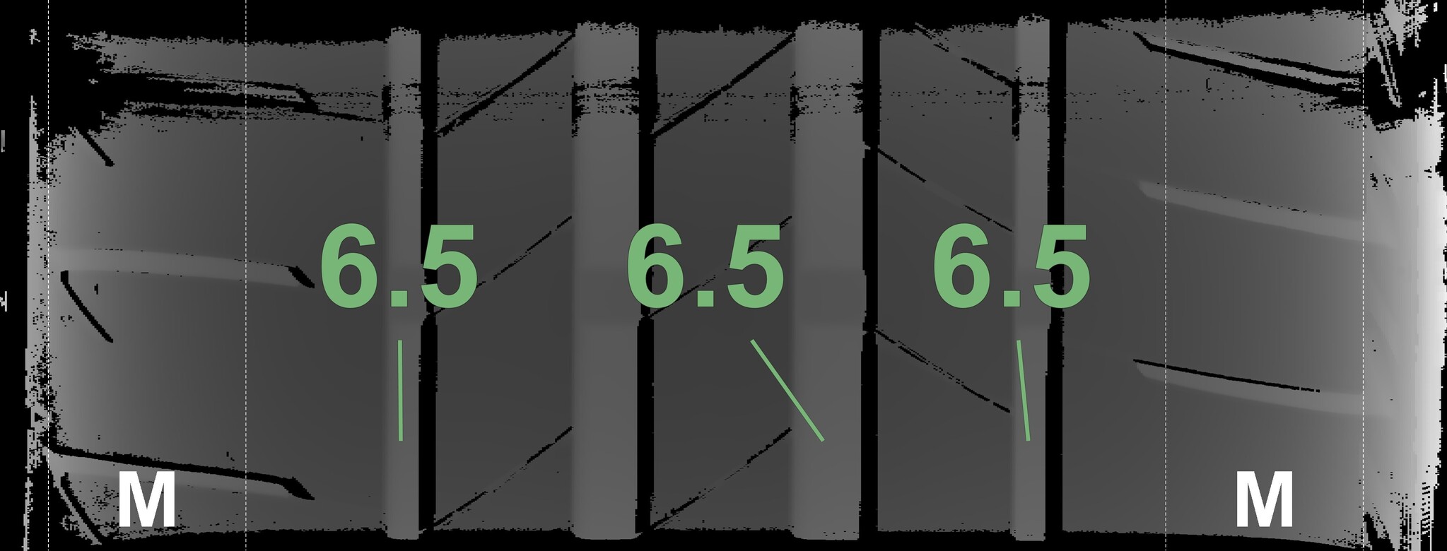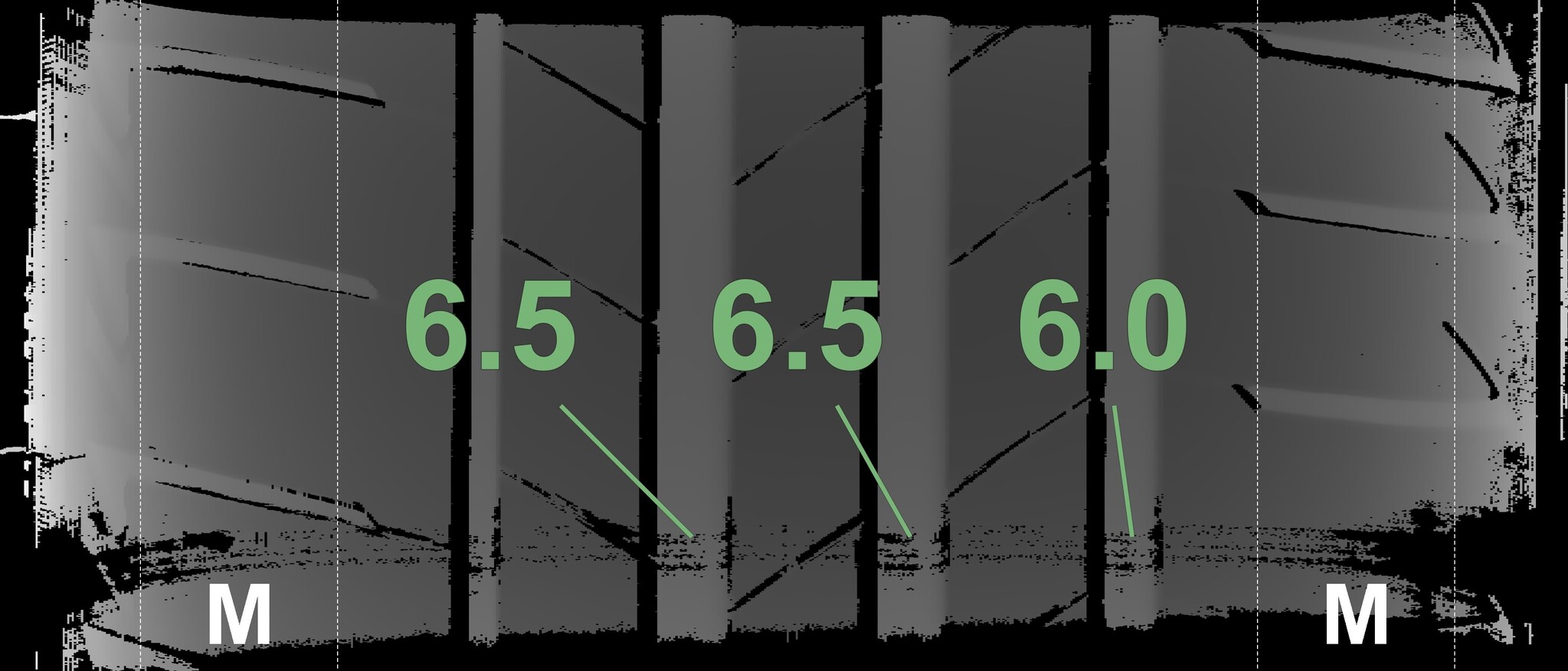 Condition | Profile depth | DOT | Rear Left | Demo studs still visible | 6.5 mm | 2422 |