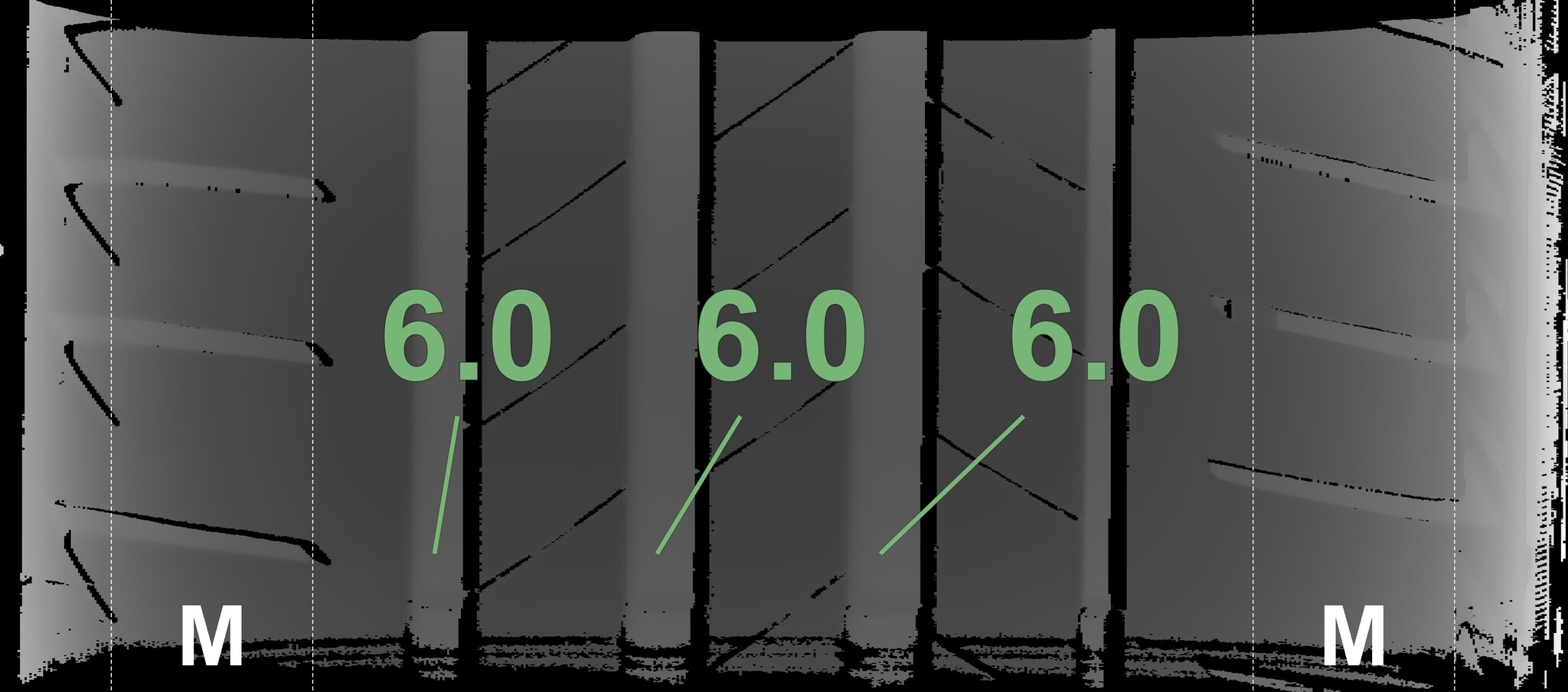 The measured tread depths and the details of the rims are shown above.