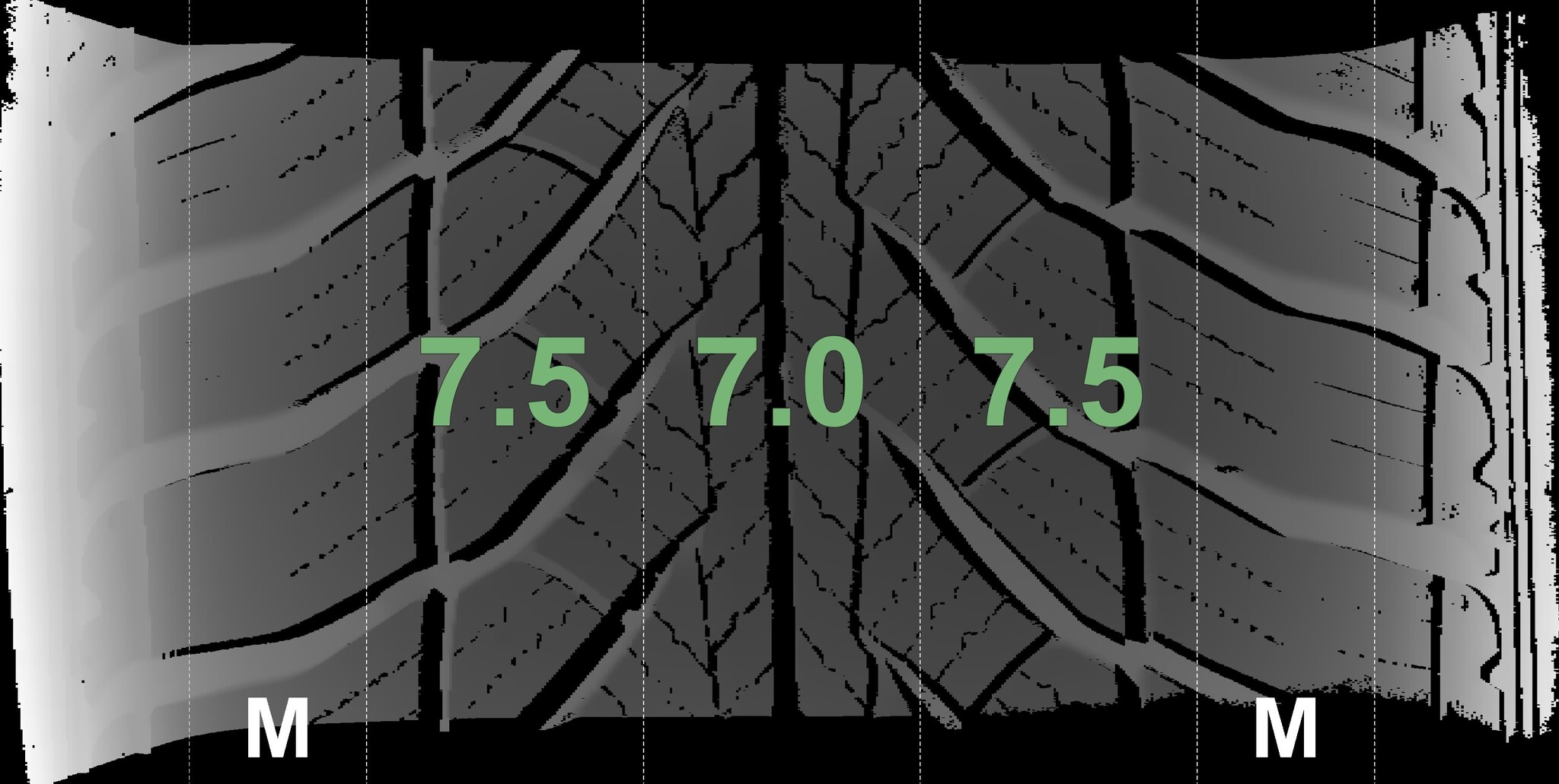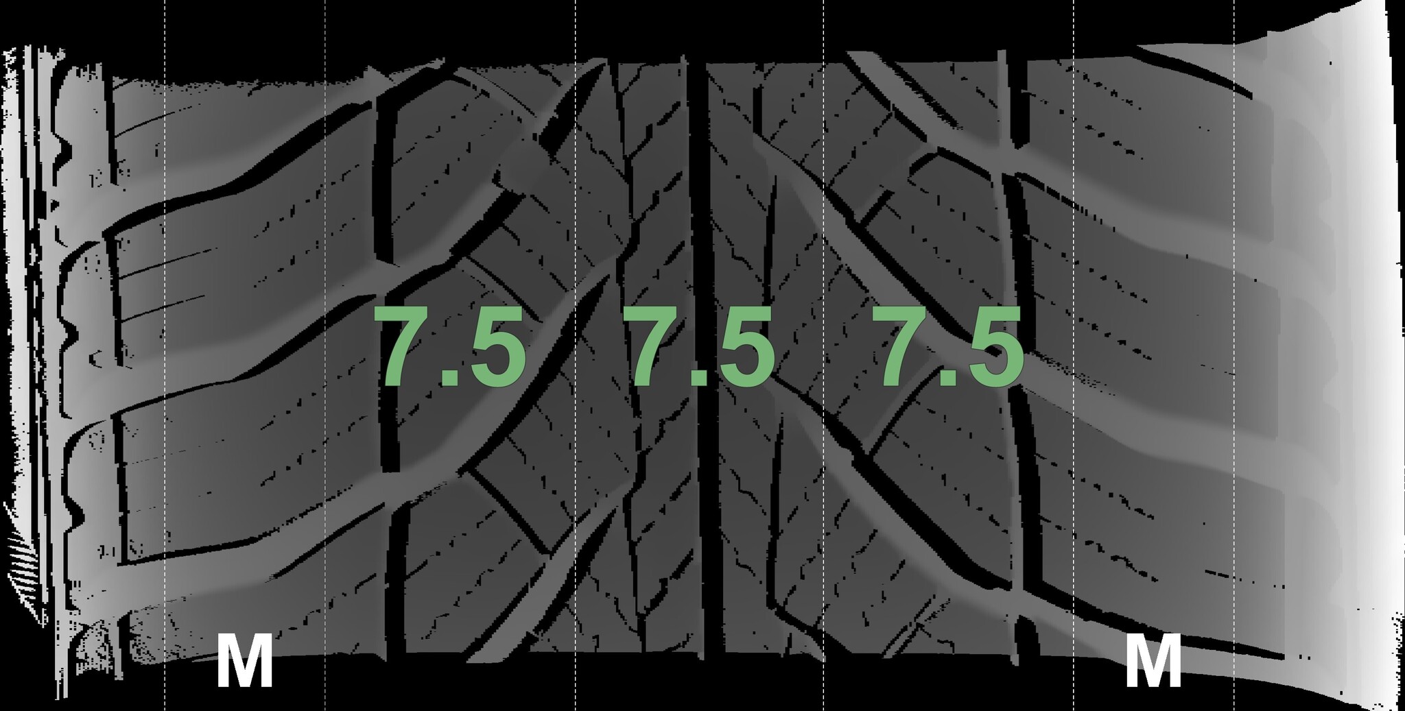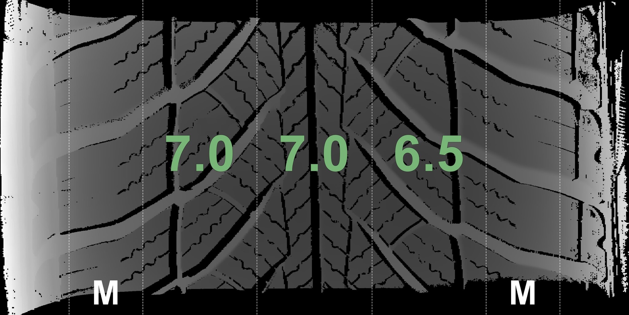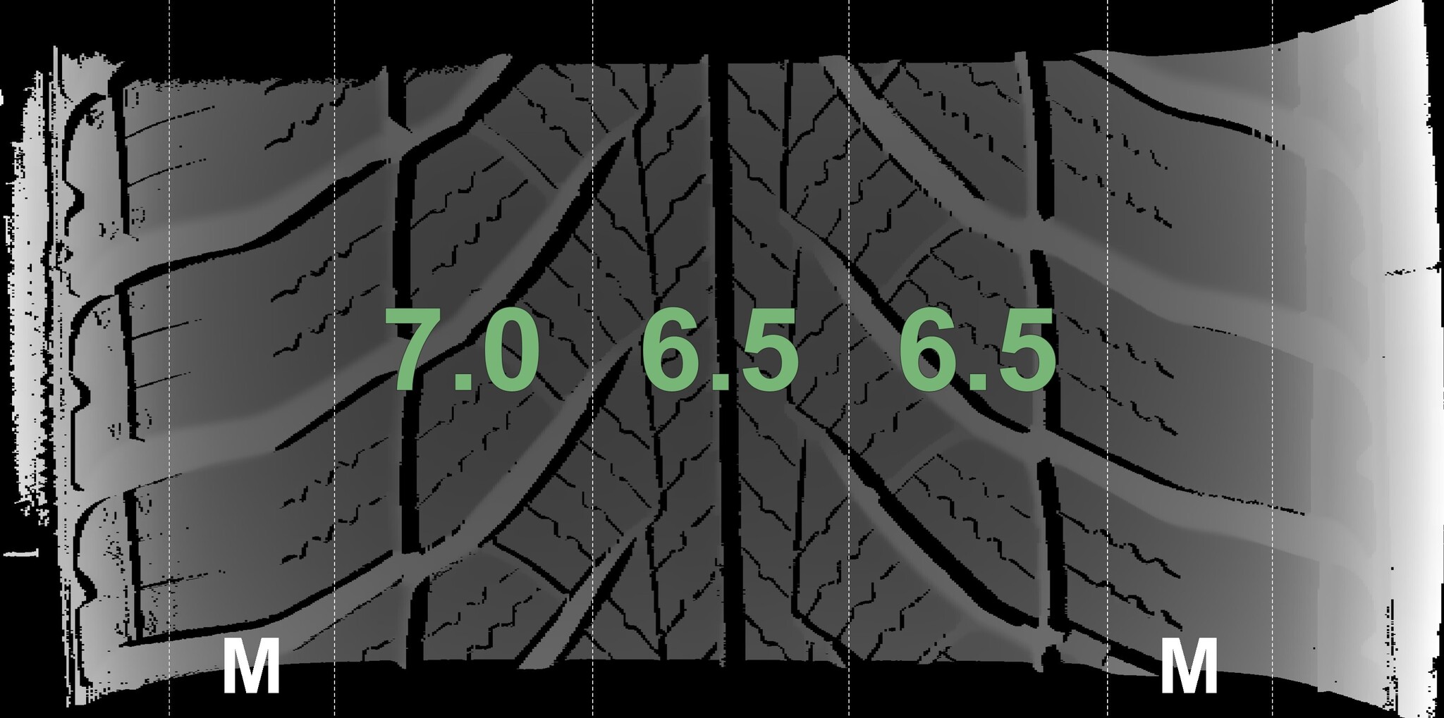 | Condition | Profile depth | DOT | Front Left | Used | 6.5 mm | 3119 |