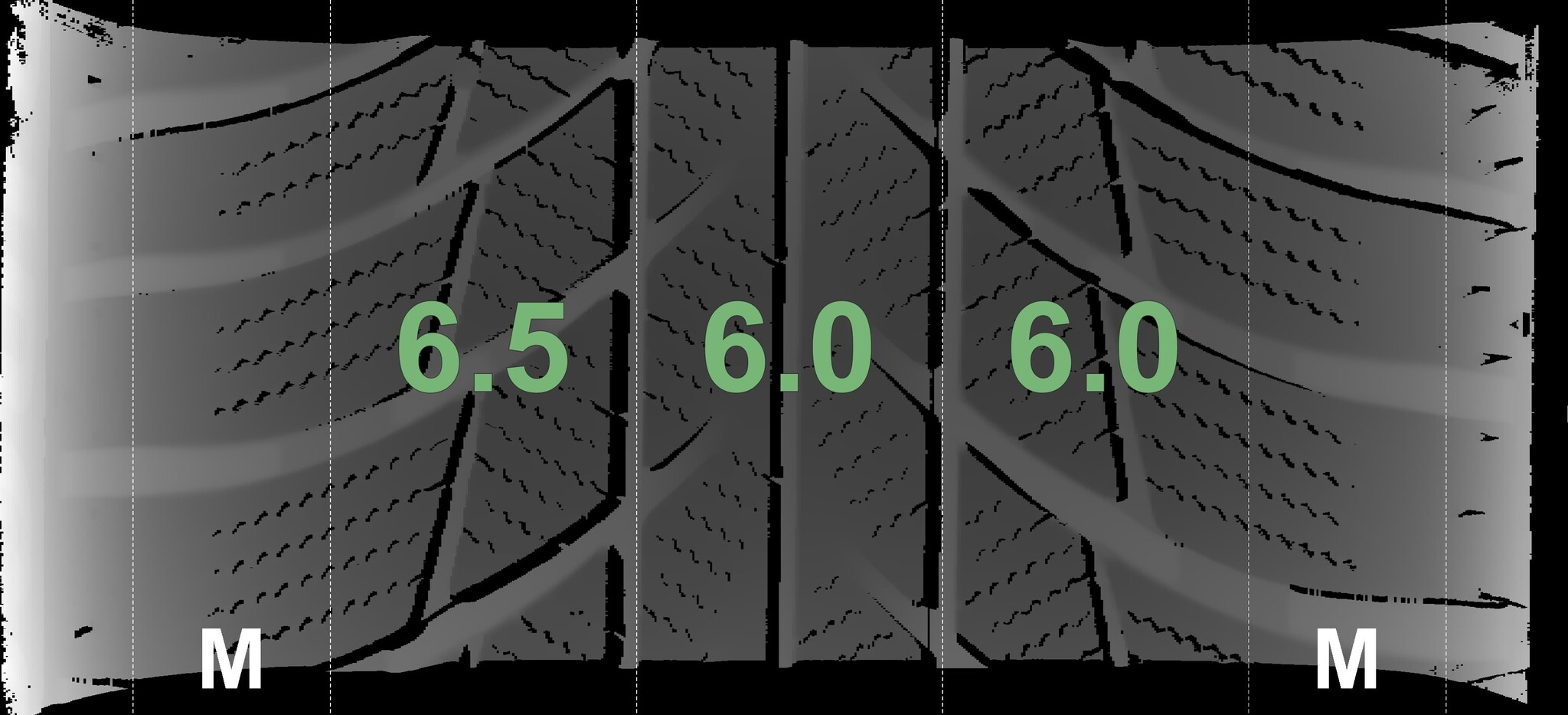 | Condition | Profile depth | DOT | Front Left | Used | 6.2 mm | 4022 |
