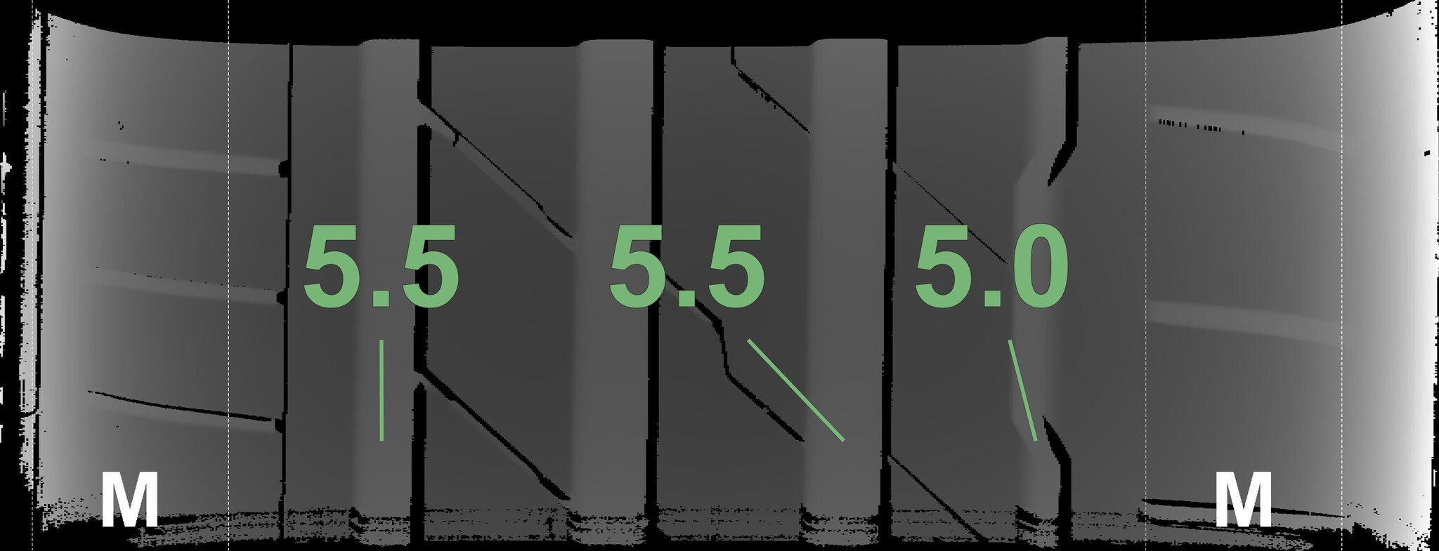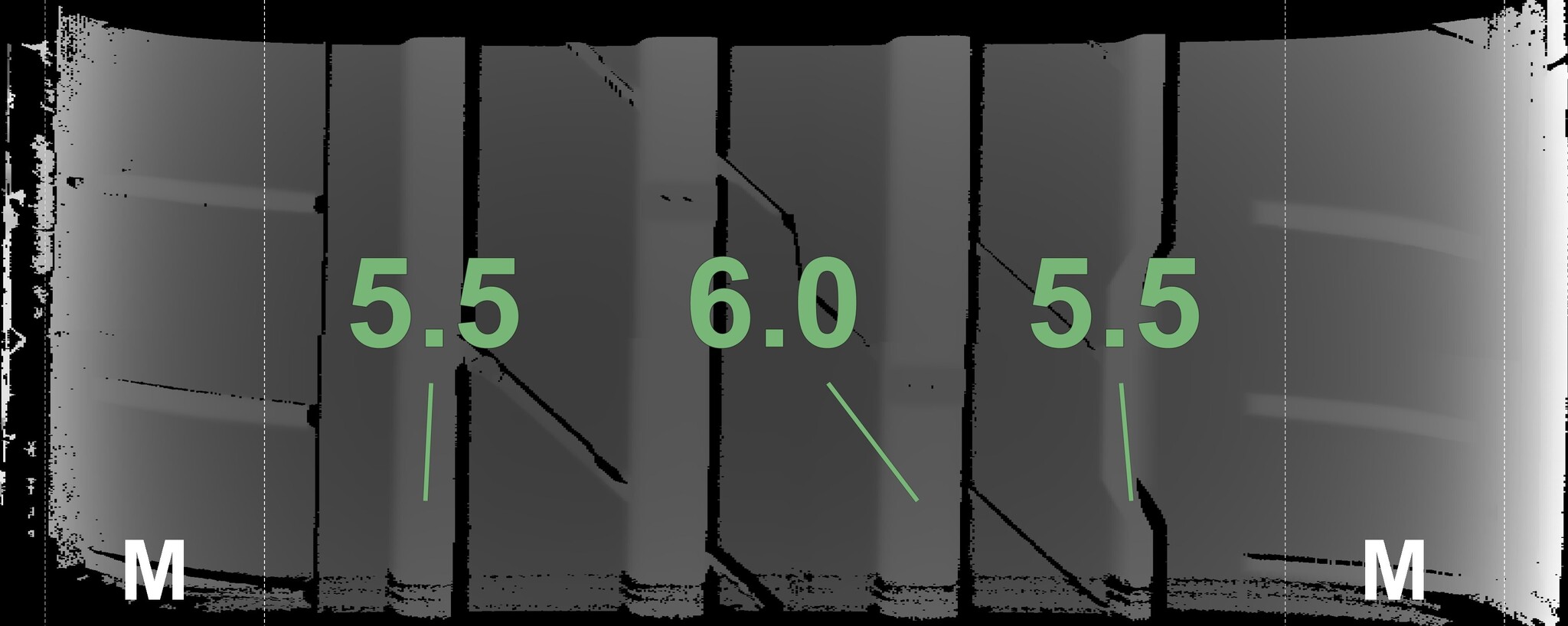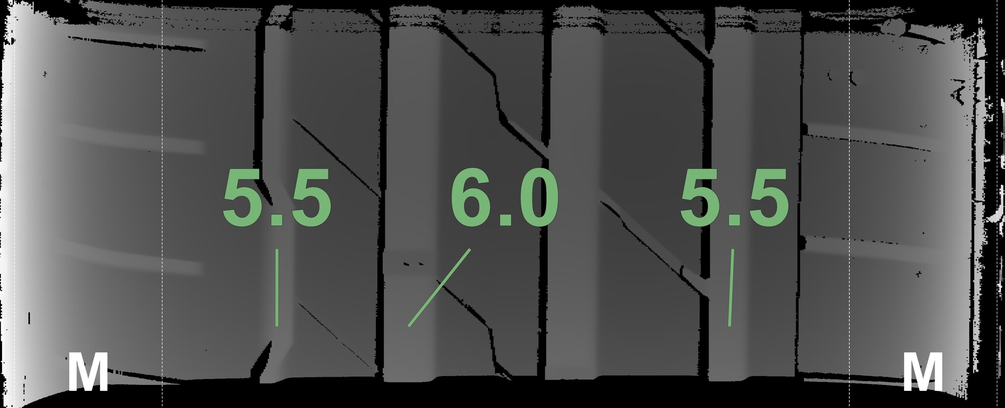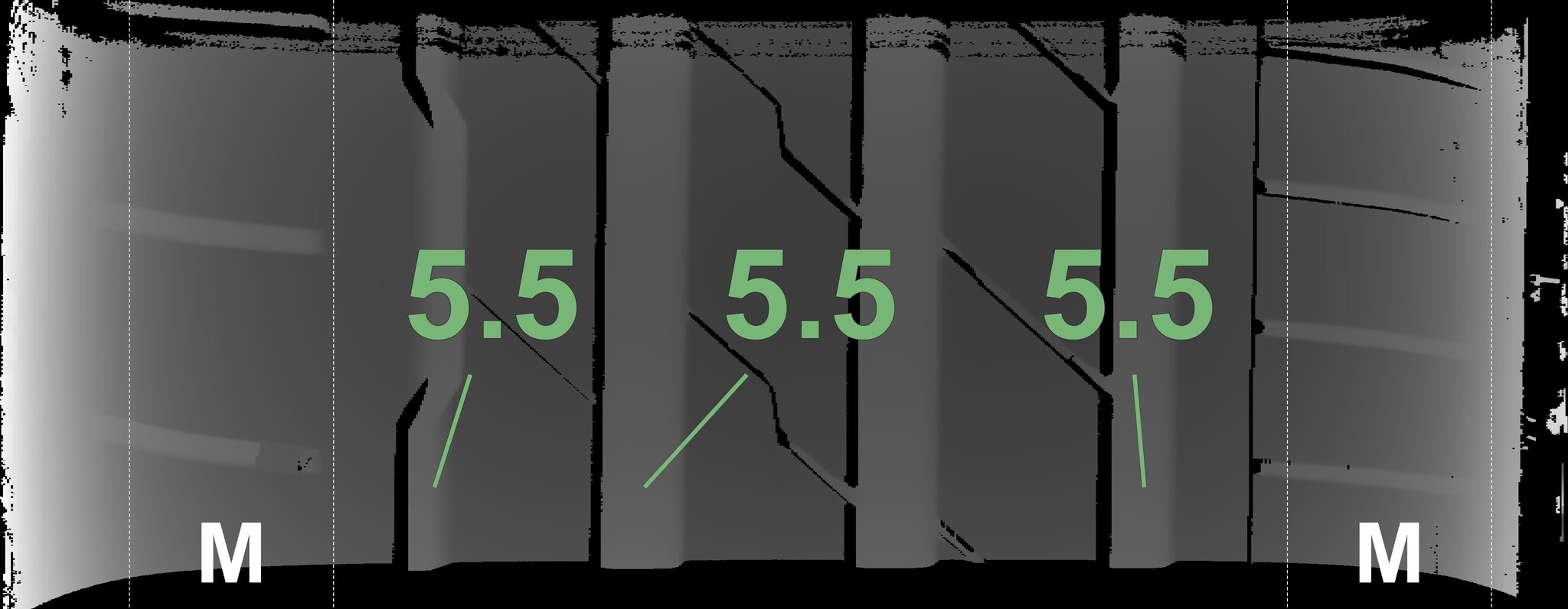 The measured tread depths and the details of the rims are shown above.
