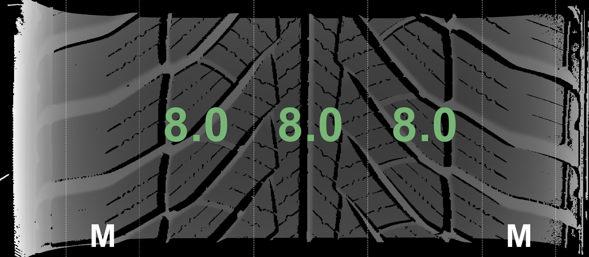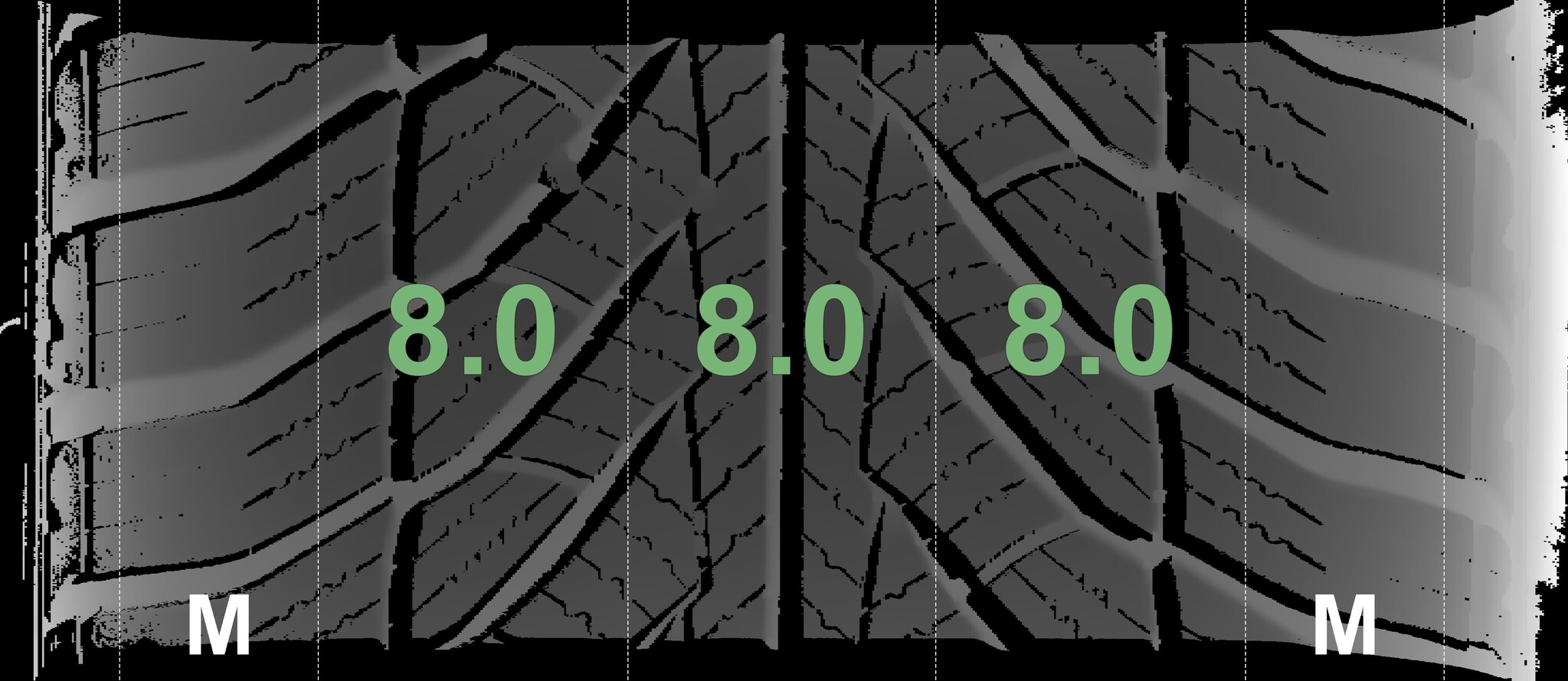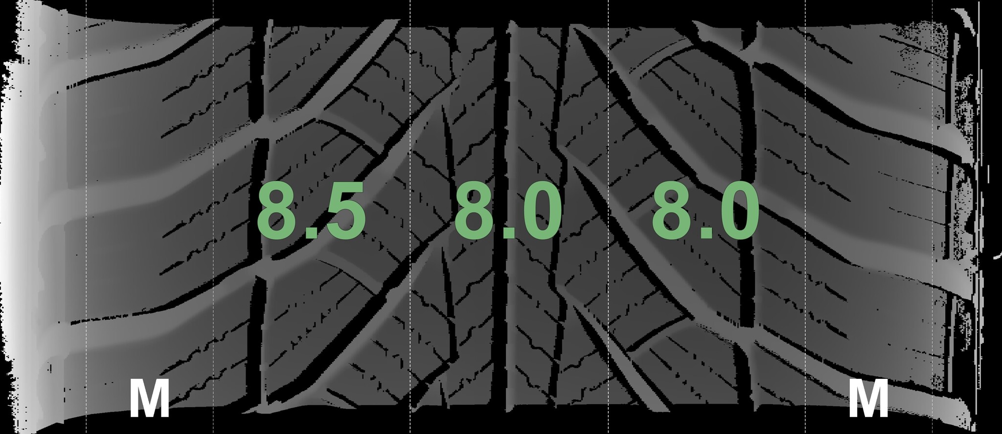 Condition | Profile depth | DOT | Front Left | Used | 8.0 mm | 4320 |