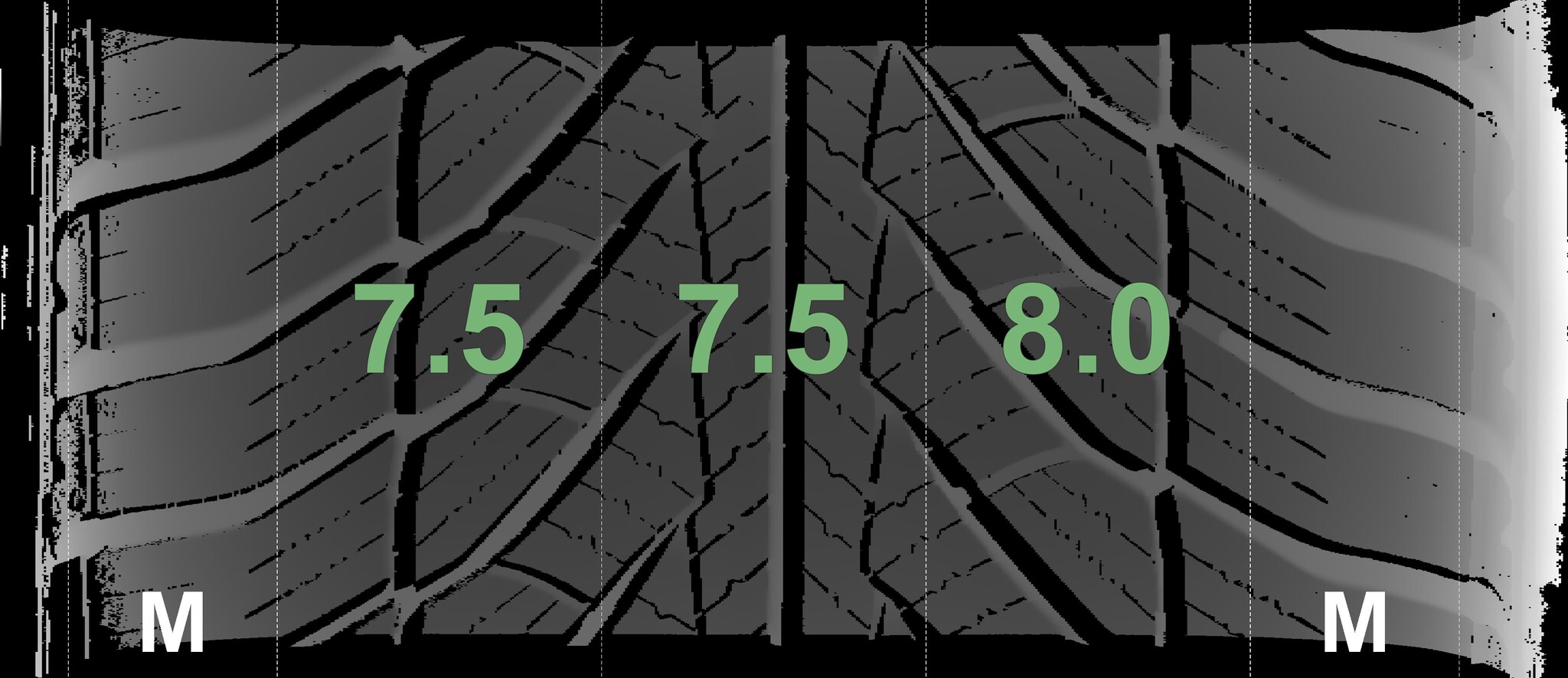 Condition | Profile depth | DOT | Front Right | Used | 7.5 mm | 4320 |