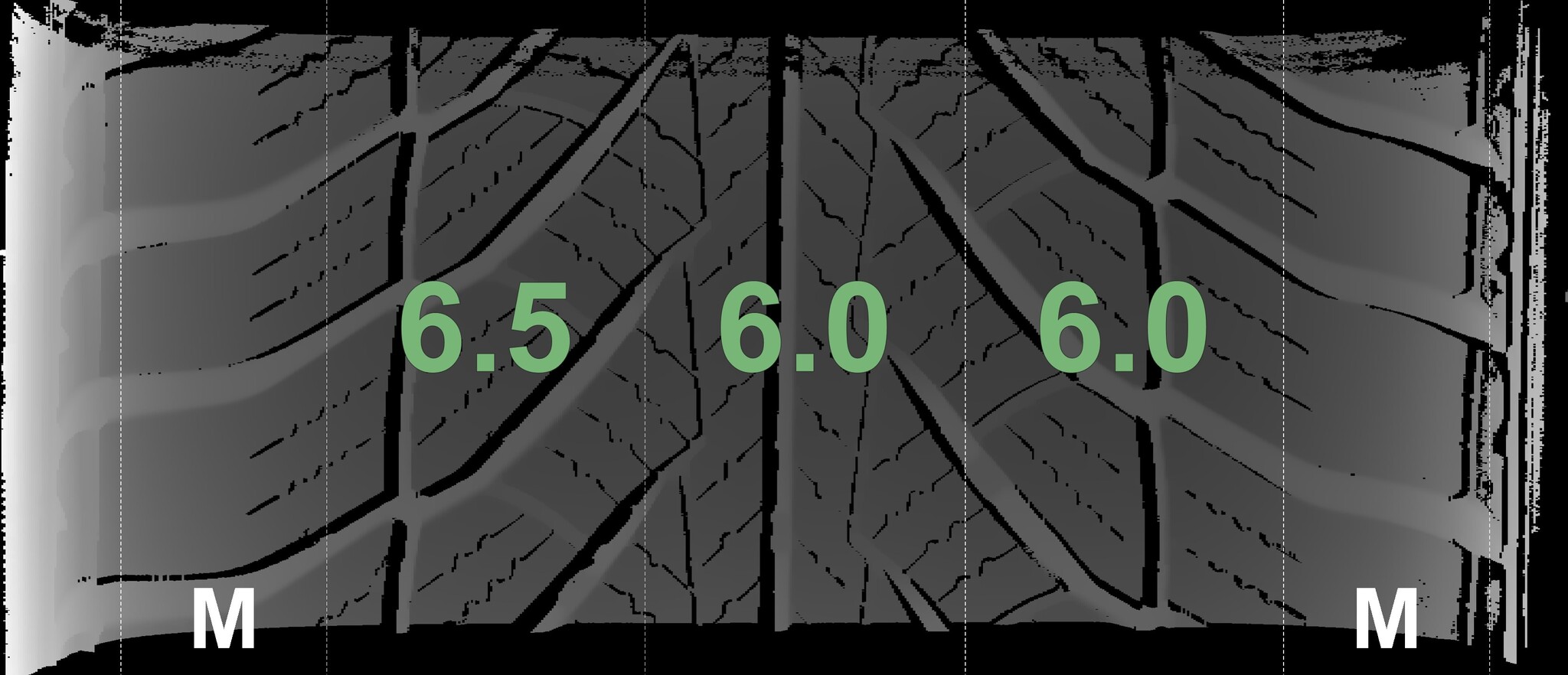 | Condition | Profile depth | DOT | Front Left | Used | 6.2 mm | 4117 |