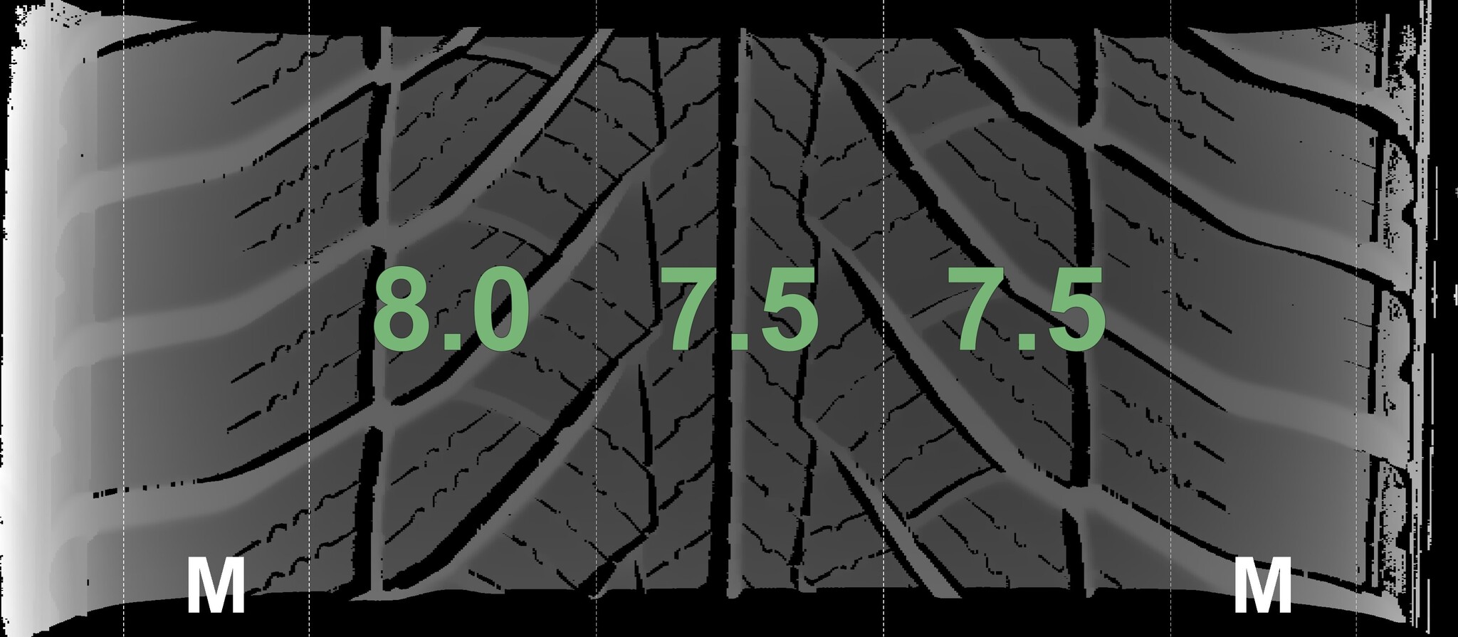 | Condition | Profile depth | DOT | Front Left | Used | 7.7 mm | 3920 |