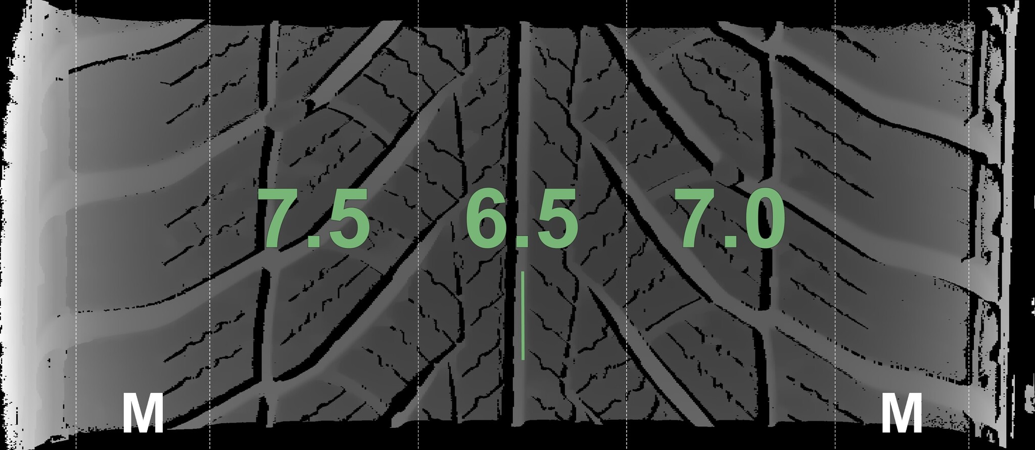 | Condition | Profile depth | DOT | Front Left | Used | 6.5 mm | 3919 |