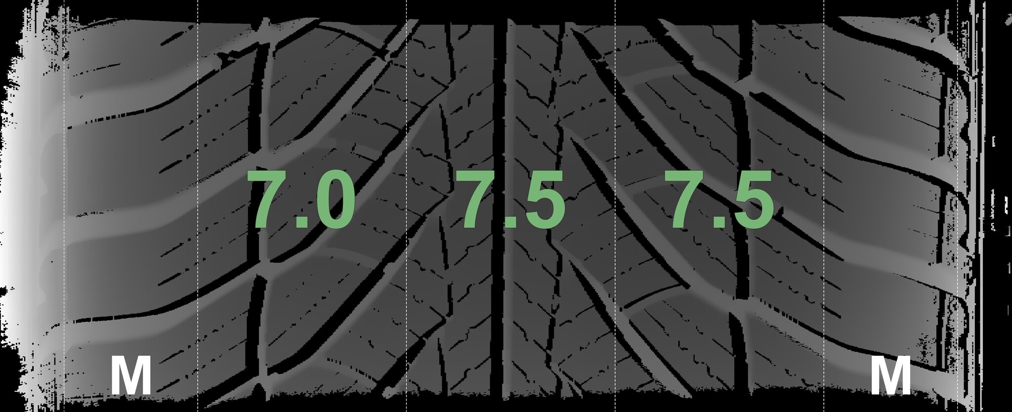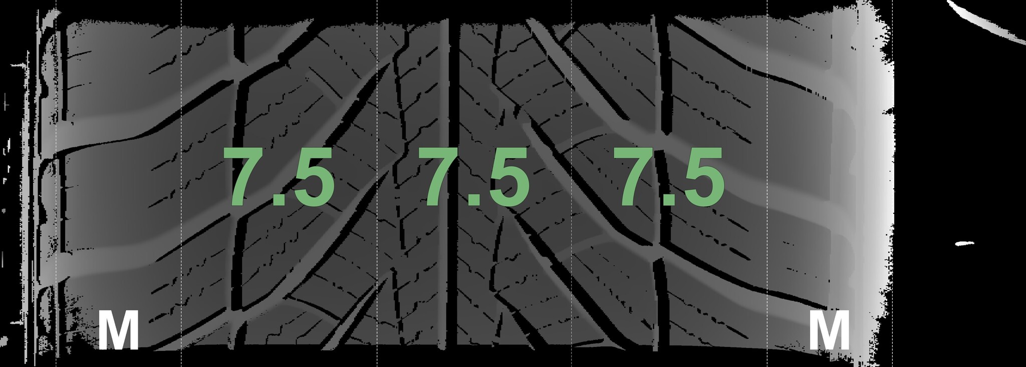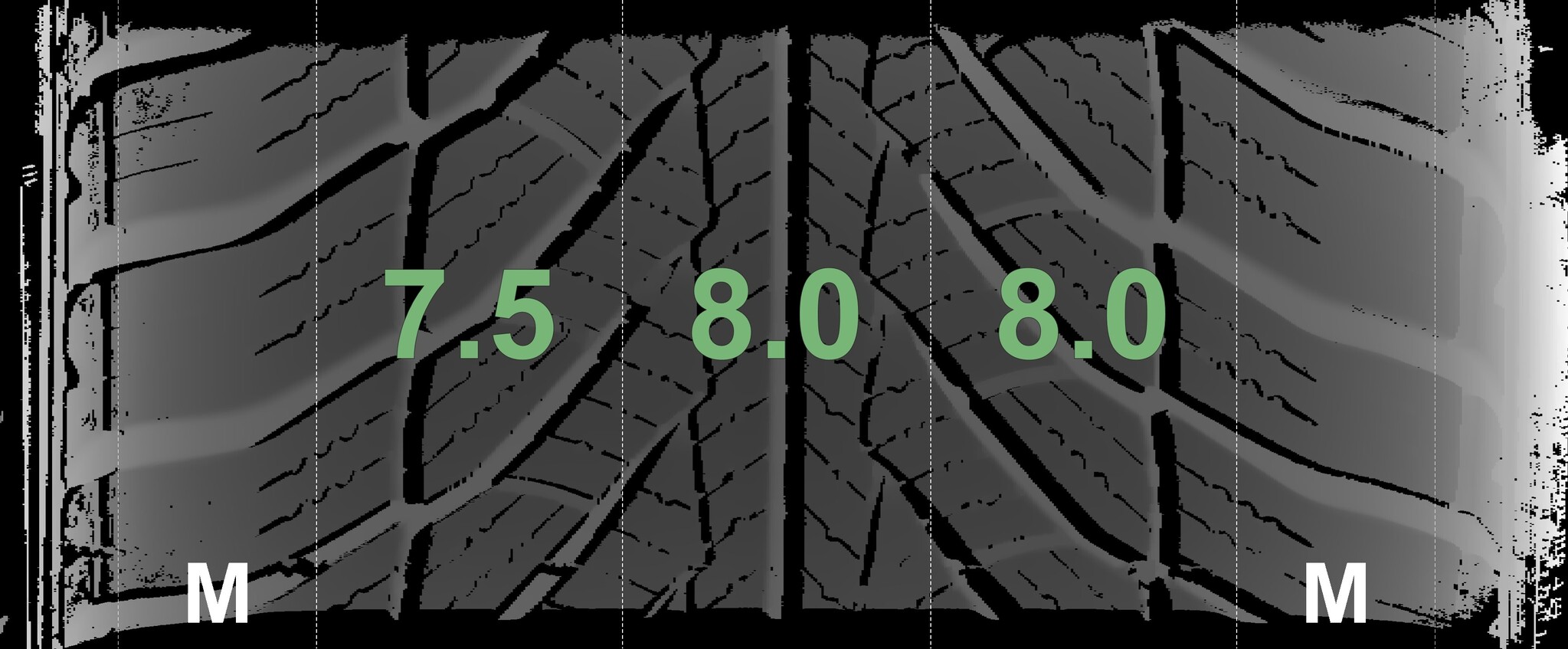 Condition | Profile depth | DOT | Front Right | Used | 7.5 mm | 3519 |