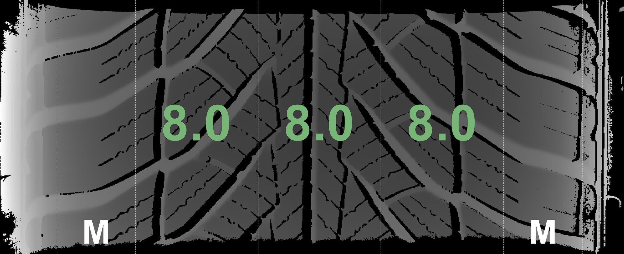 Condition | Profile depth | DOT | Front Left | Used | 8.0 mm | 3519 |