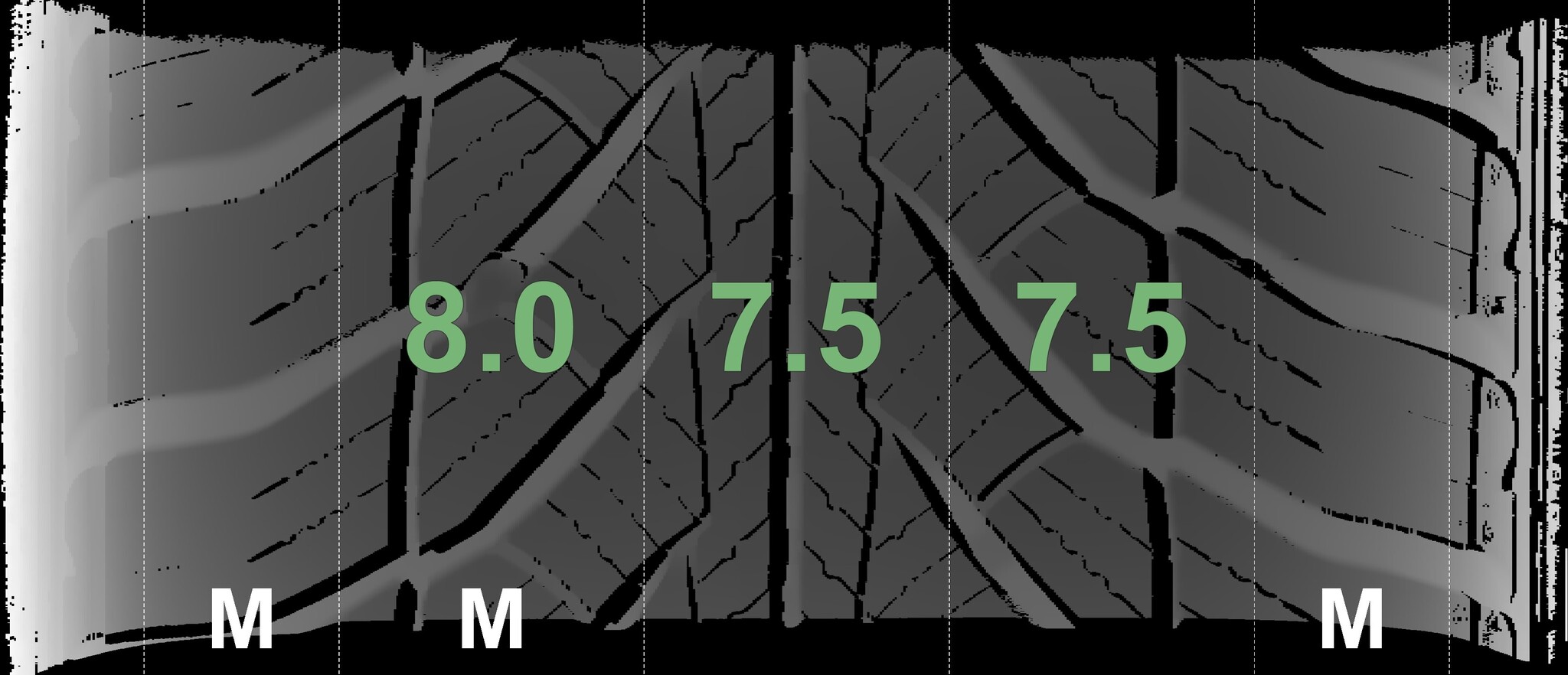 | Condition | Profile depth | DOT | Front Right | Used | 7.0 mm | 2519 |