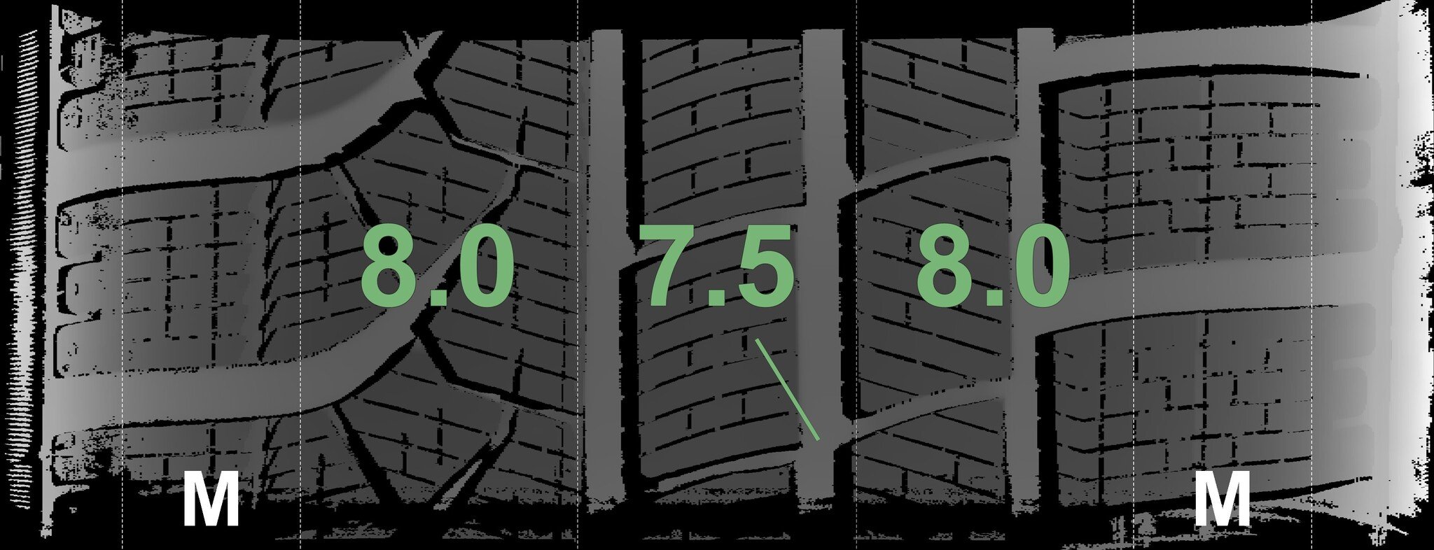 The measured tread depths and the details of the rims are shown above.
