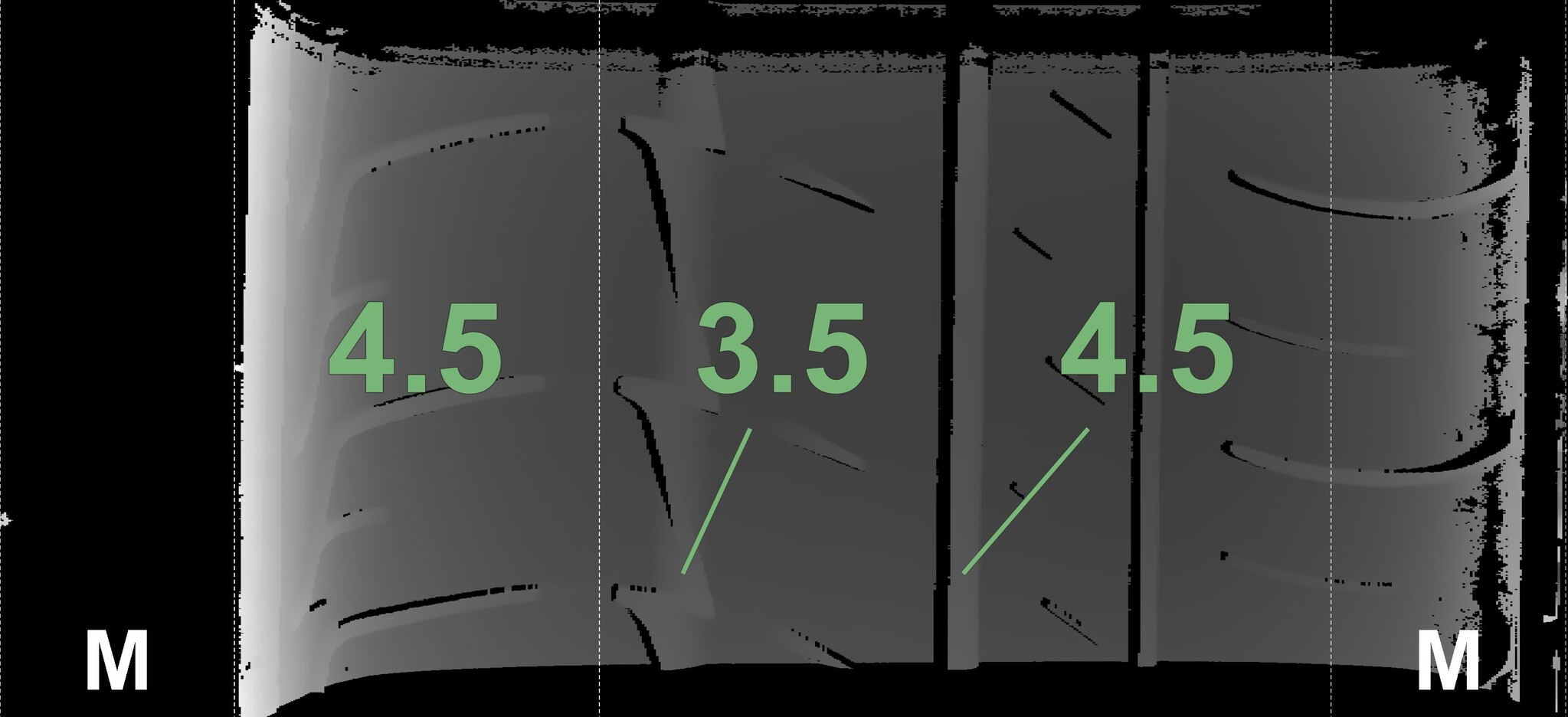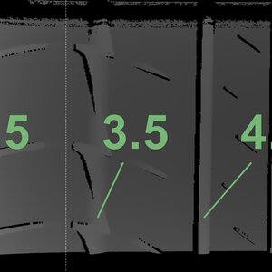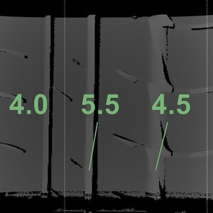 The measured tread depths and the details of the rims are shown above.