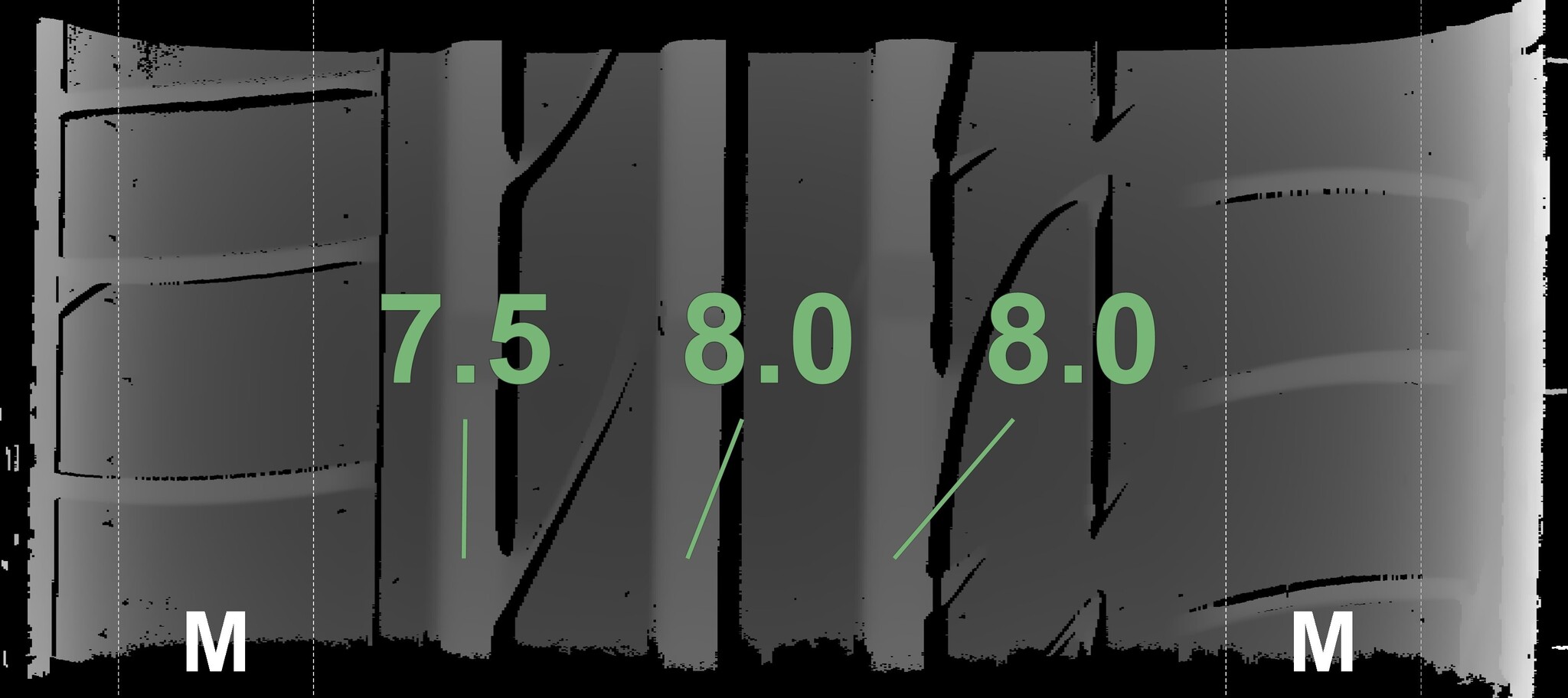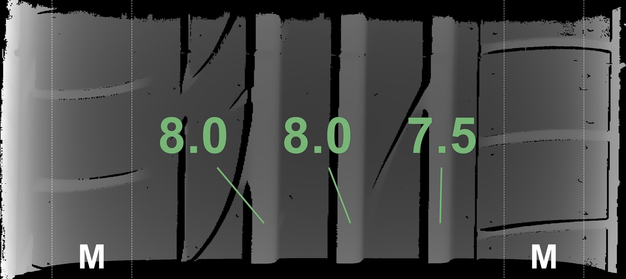 | Condition | Profile depth | DOT | Front Right | New | 7.8 mm | 0524 |
