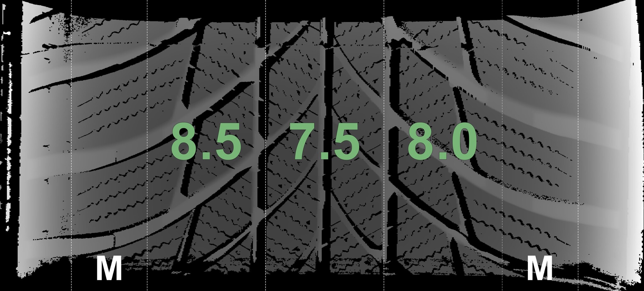 The measured tread depths and the details of the rims are shown above.