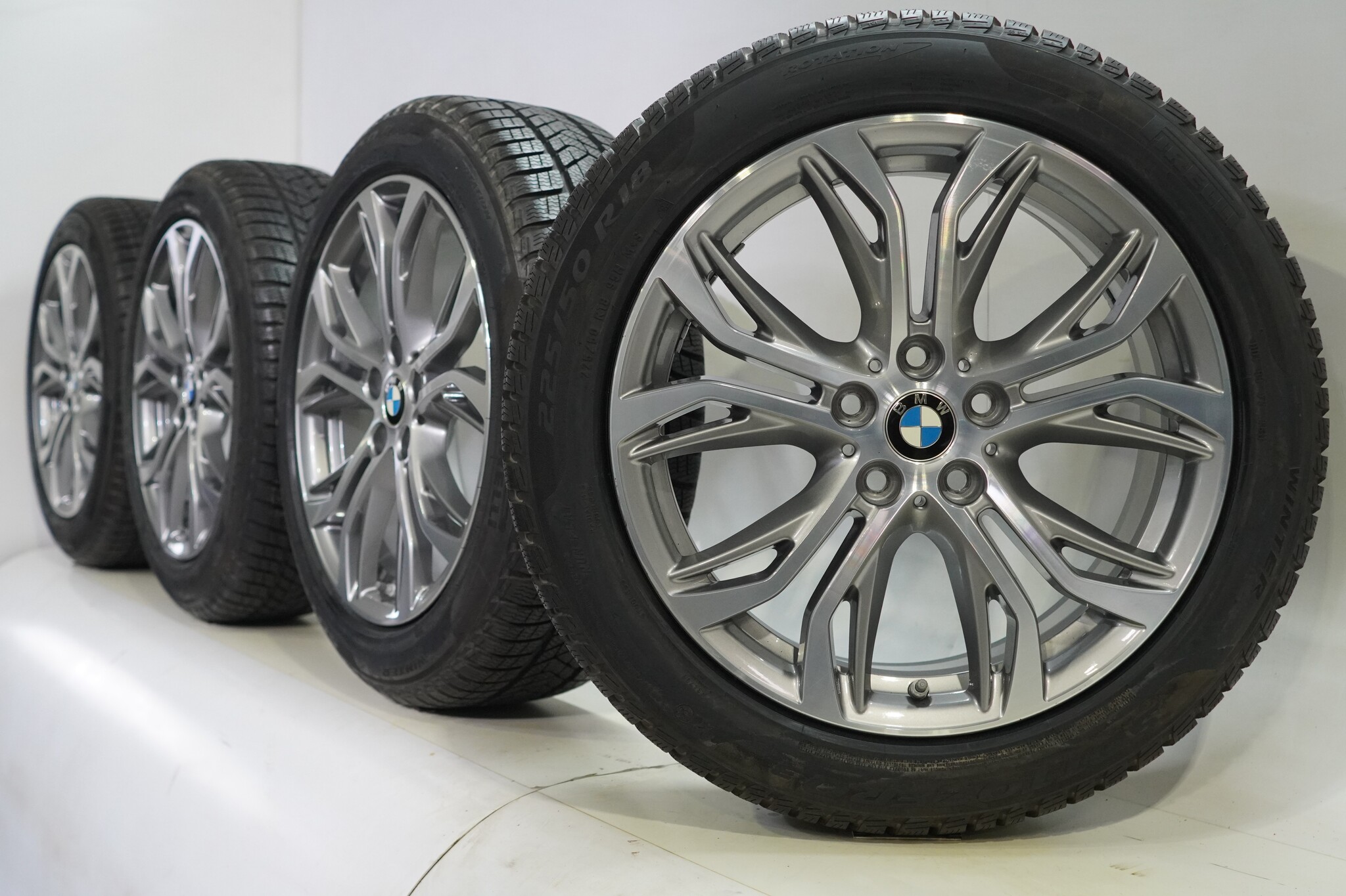 Original wheel set from BMW, styling 566, 18 inch wheels with Pirelli Winter Sottozero 3 Runflat winter tires. These wheels are original wheels from the BMW brand and suitable for: BMW X1 F48 X2 F39.