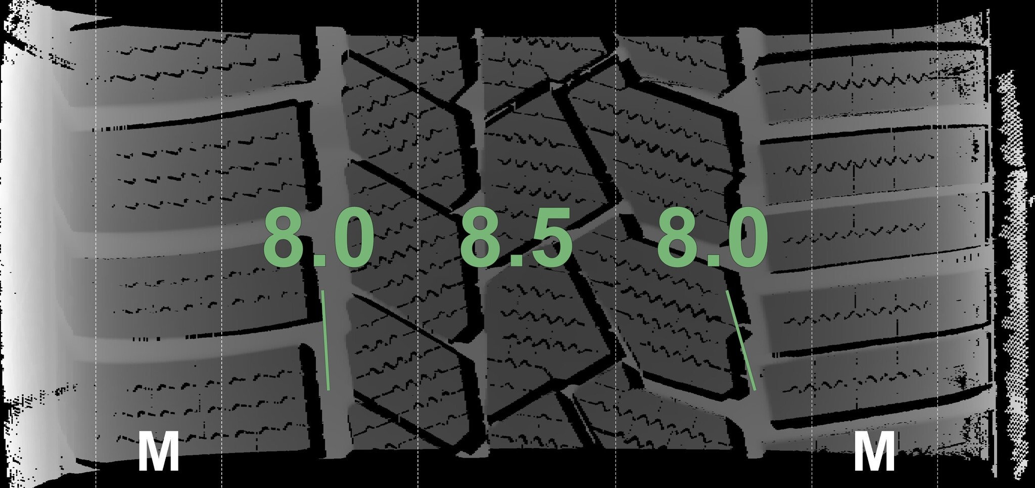 Condition | Profile depth | DOT | Front Left | New | 8.0 mm | 5020 |