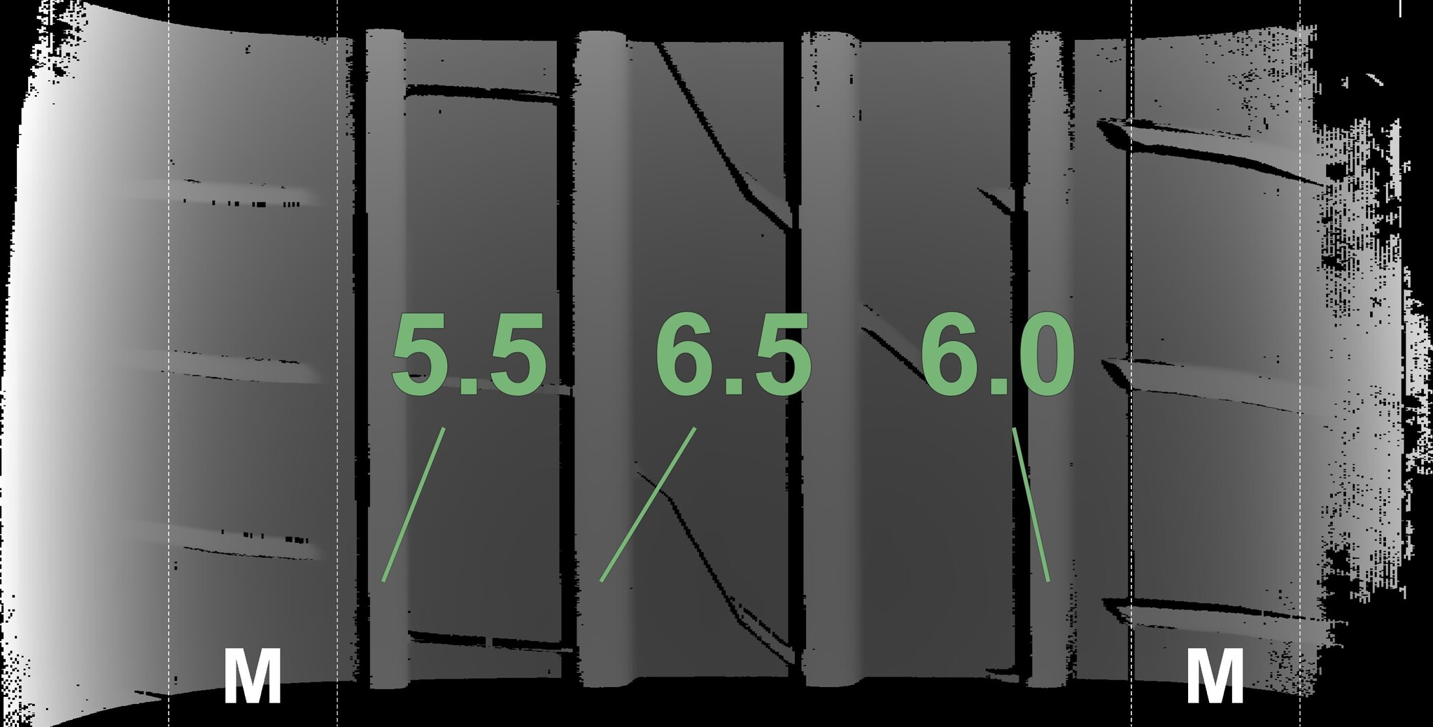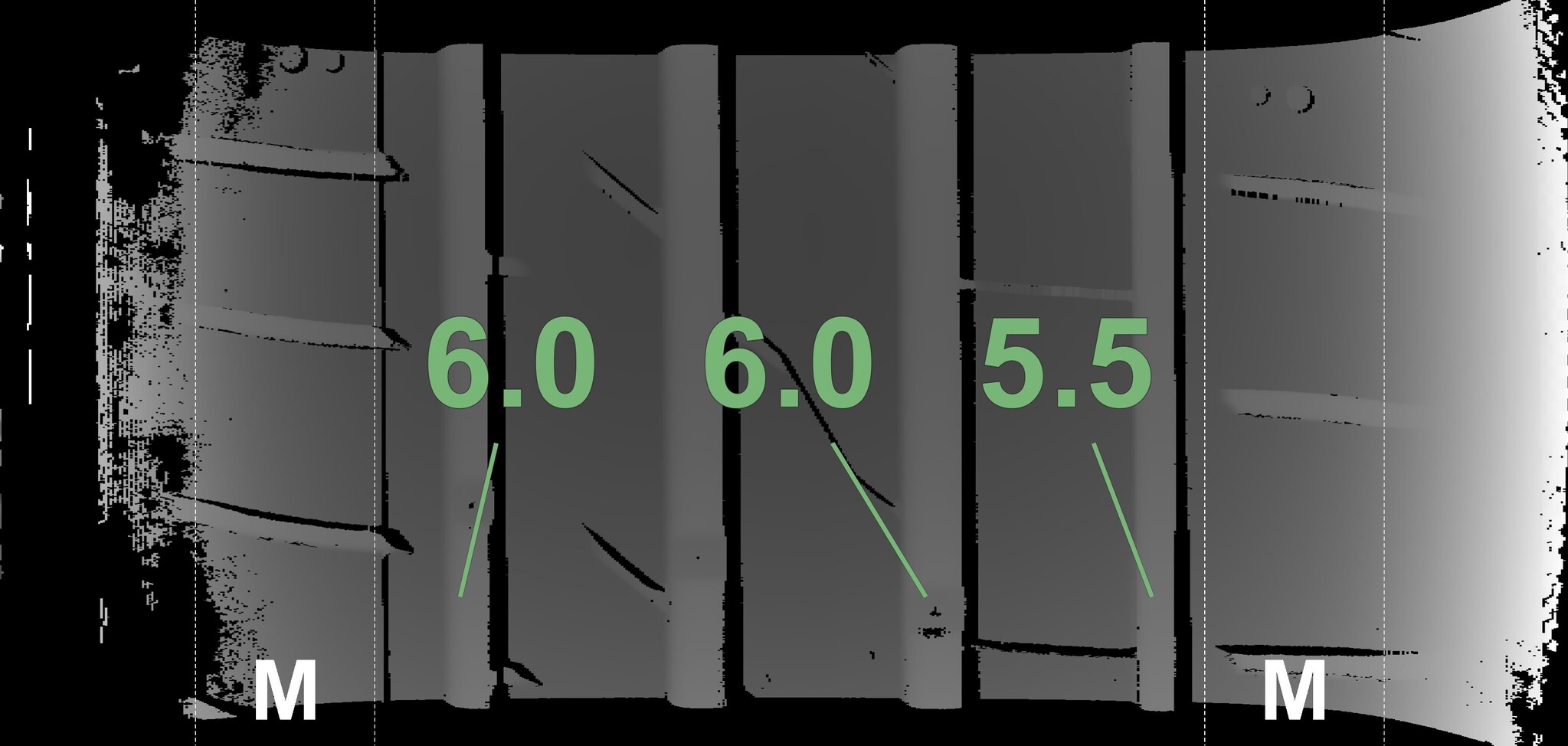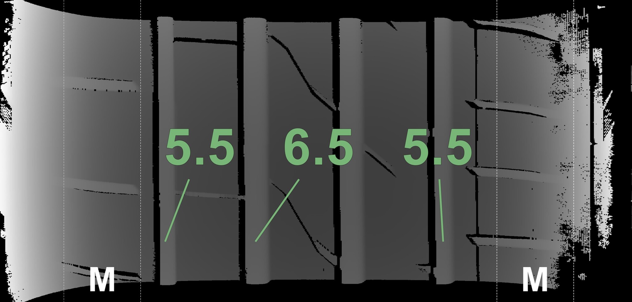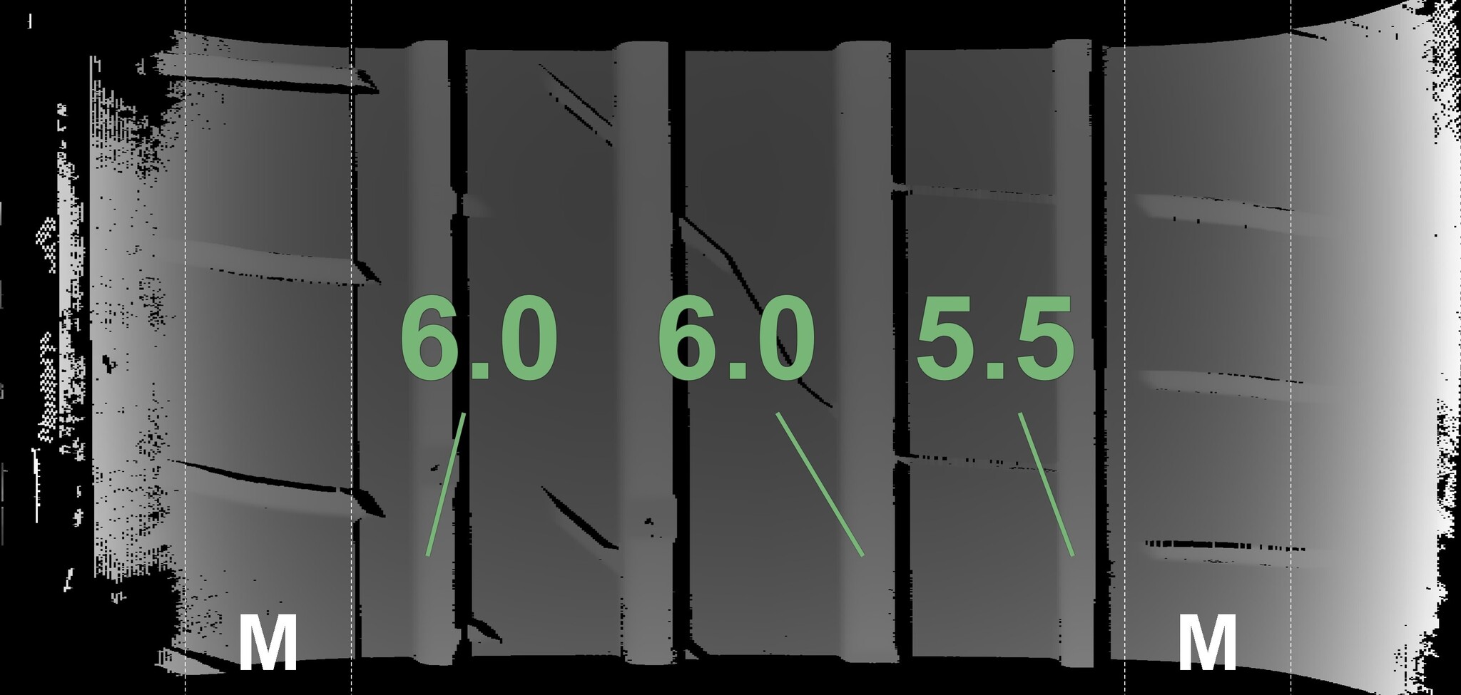 Condition | Profile depth | DOT | Front Left | Demo studs still visible | 5.5 mm | 1624 |