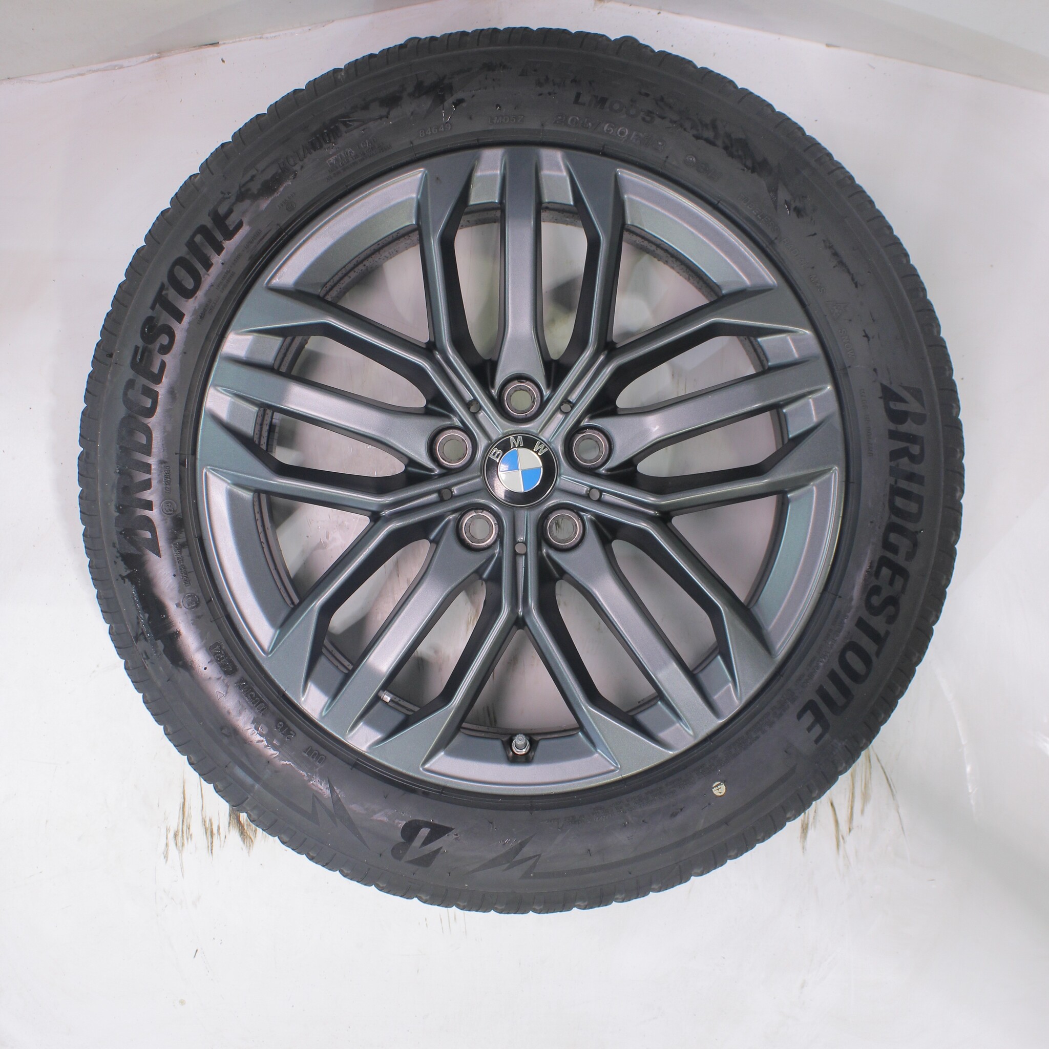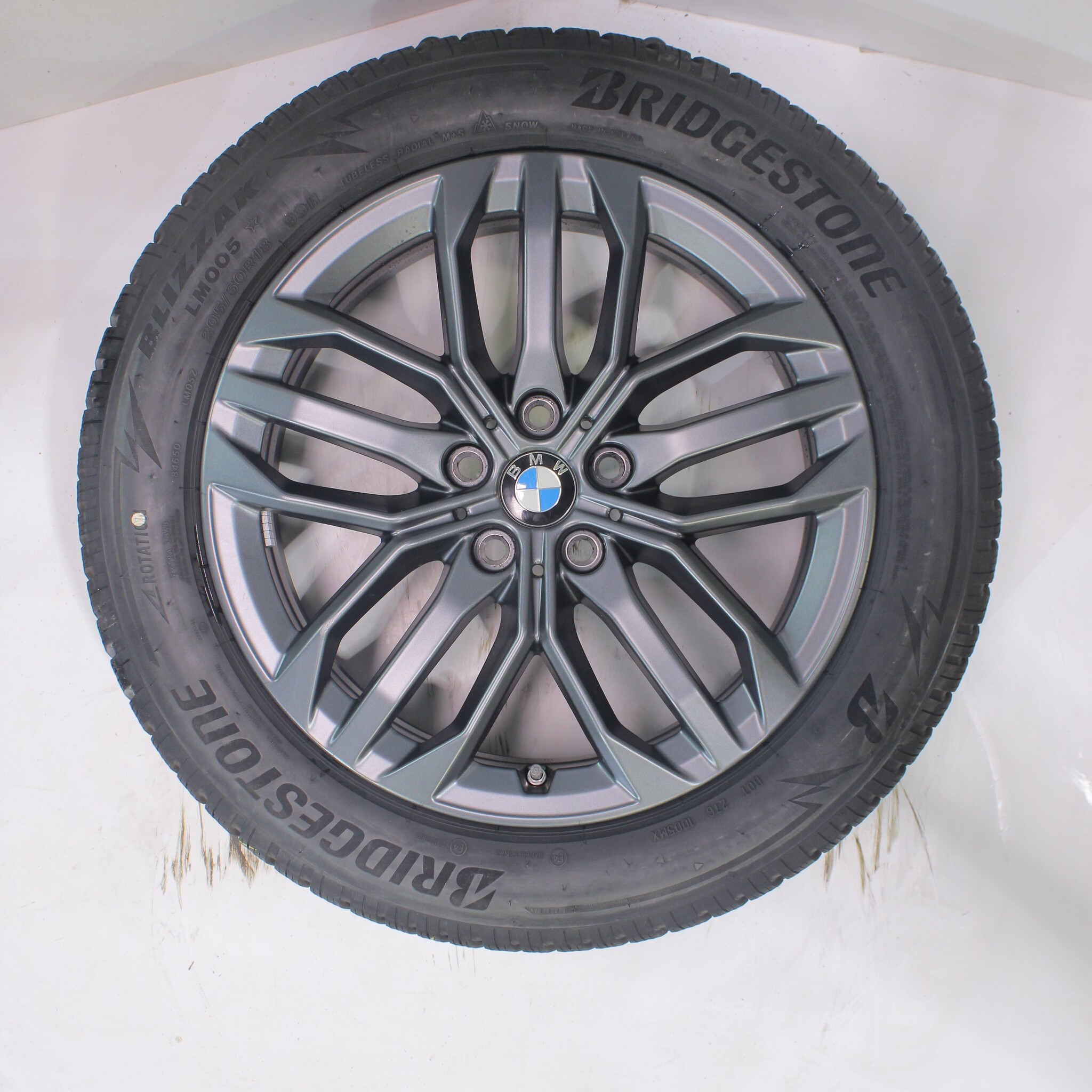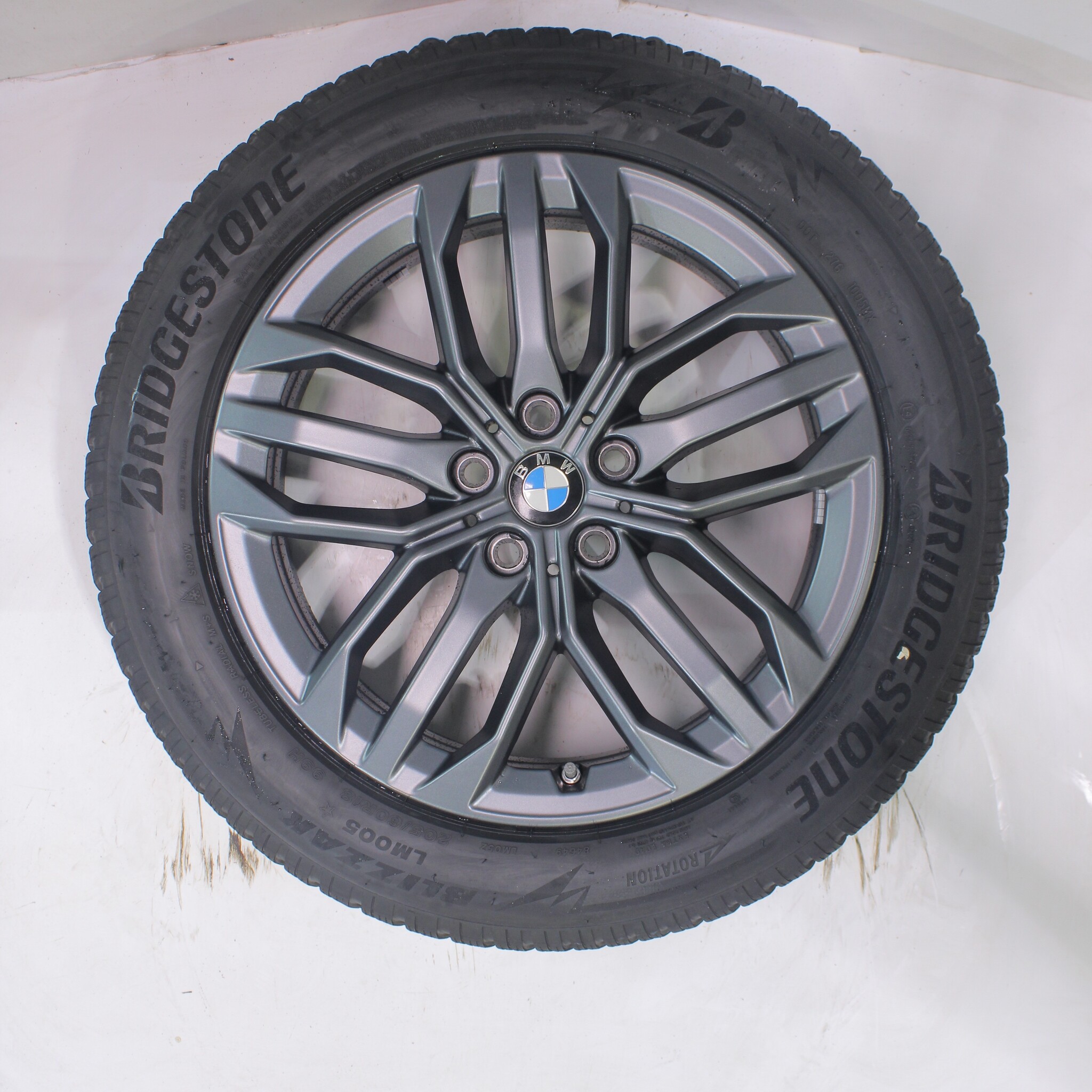 Original BMW wheel set, styling 879, 18-inch rims with Bridgestone BLIZZAK LM005 winter tires. These rims are original BMW rims and suitable for: BMW X1 iX1 U11 BEV X2 iX2 U10.