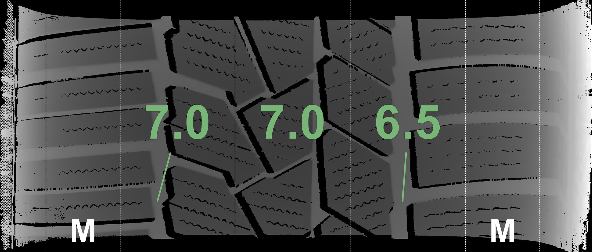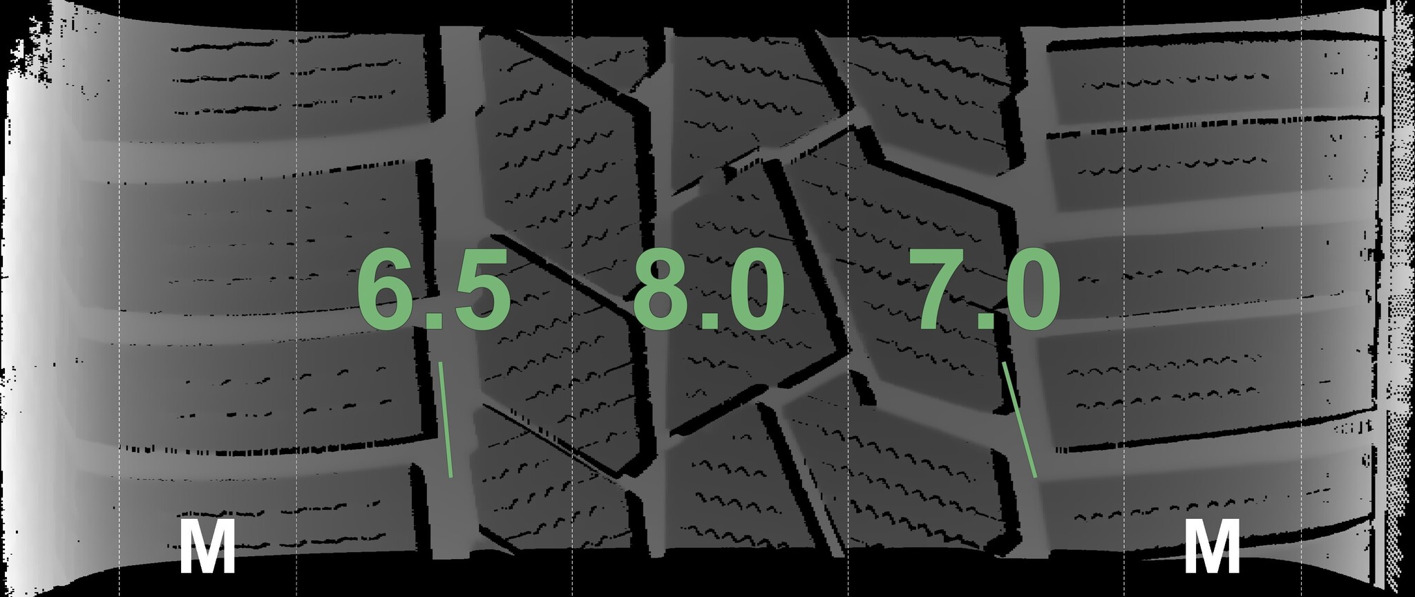 | Condition | Profile depth | DOT | Front Left | Used | 6.5 mm | 2821 |