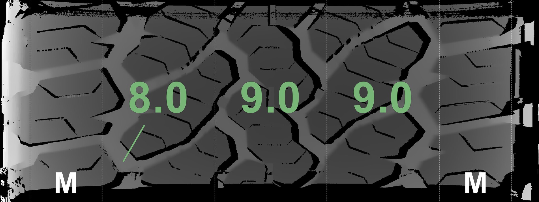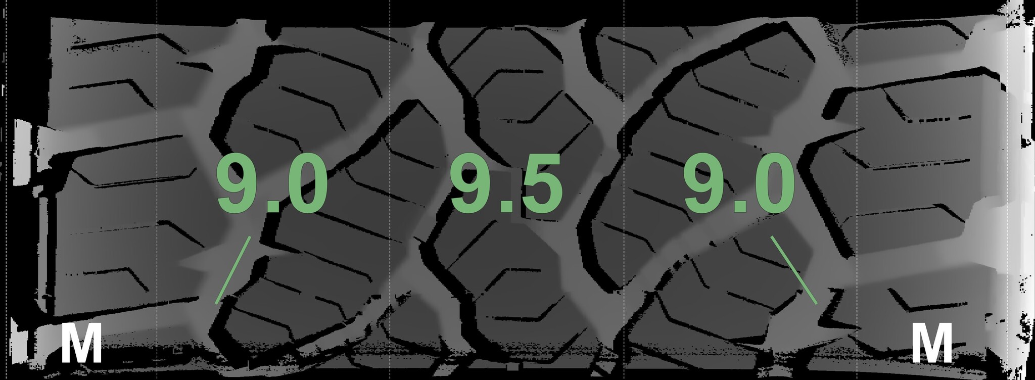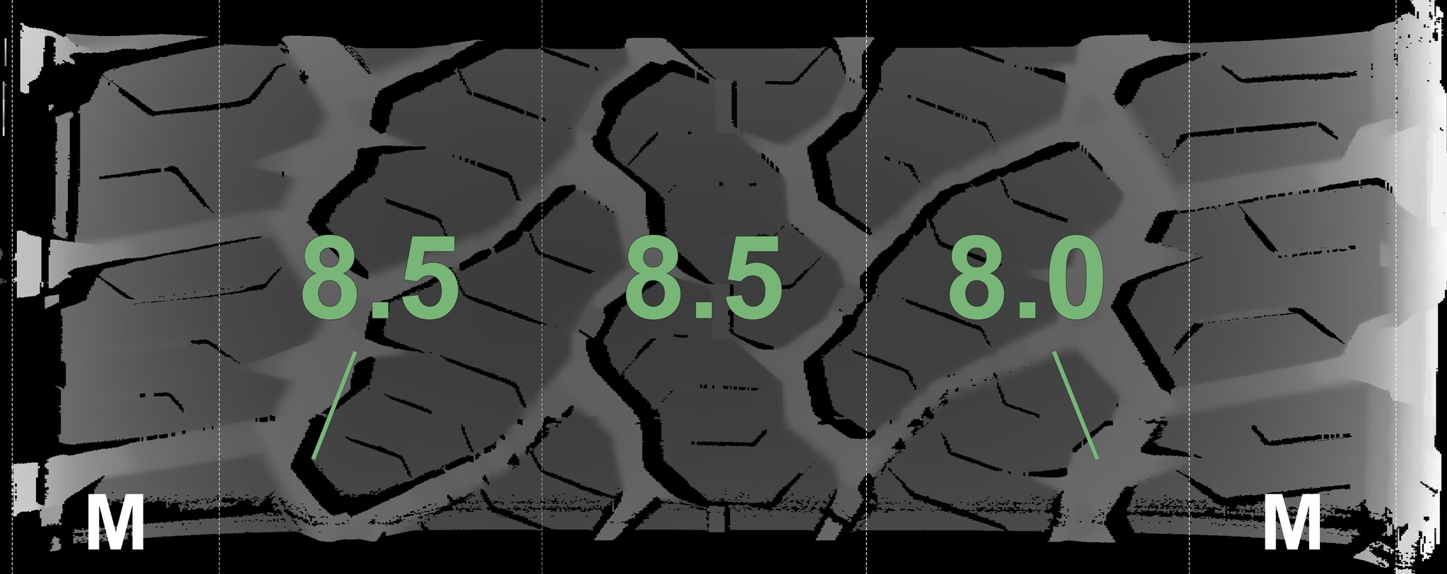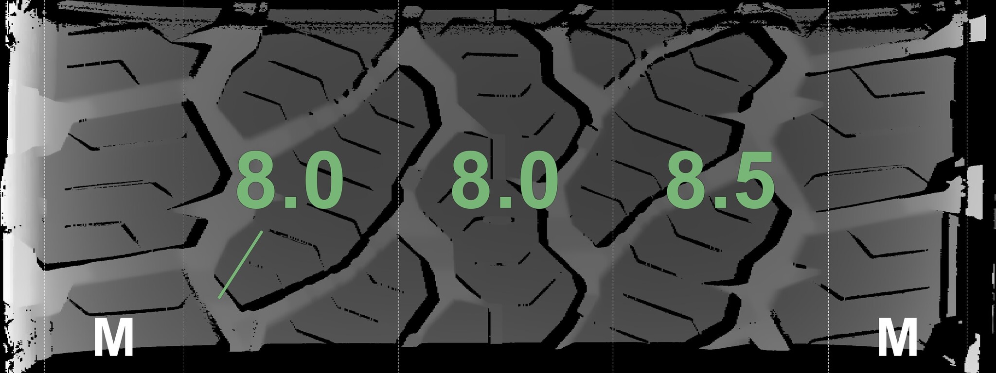 The measured tread depths and the details of the rims are shown above.