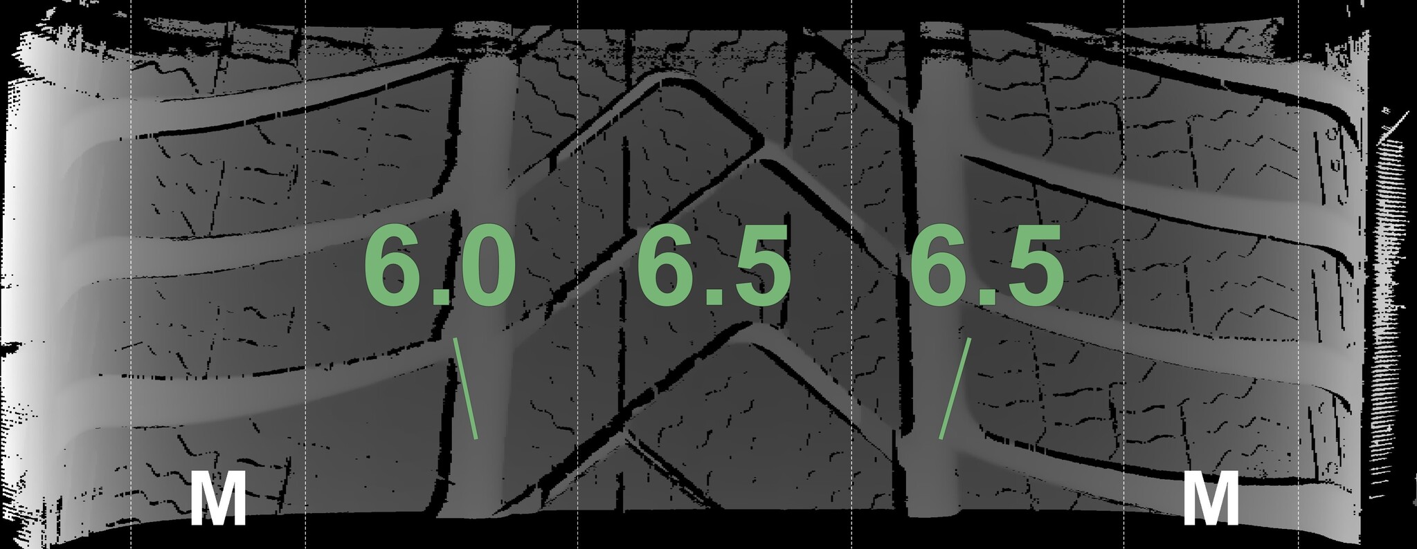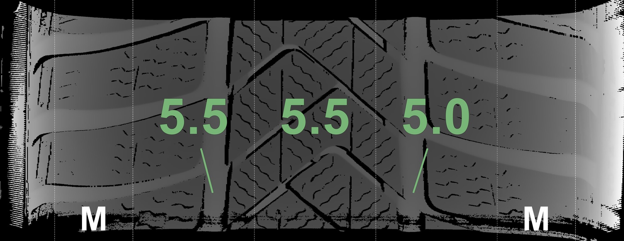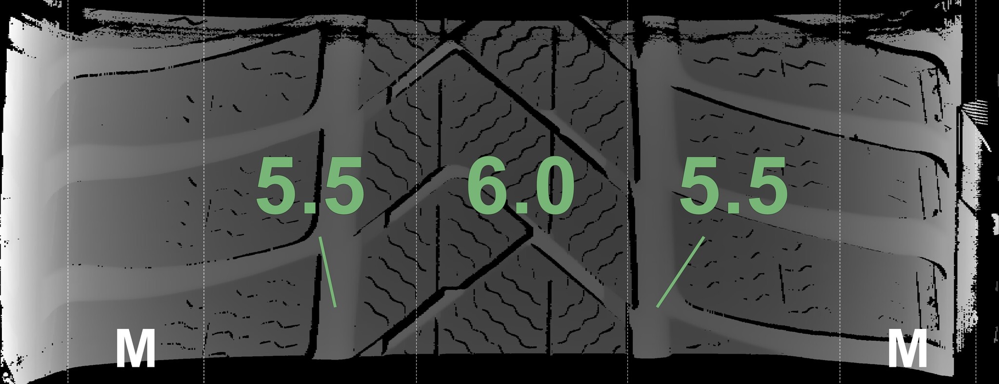 The measured tread depths and the details of the rims are shown above.