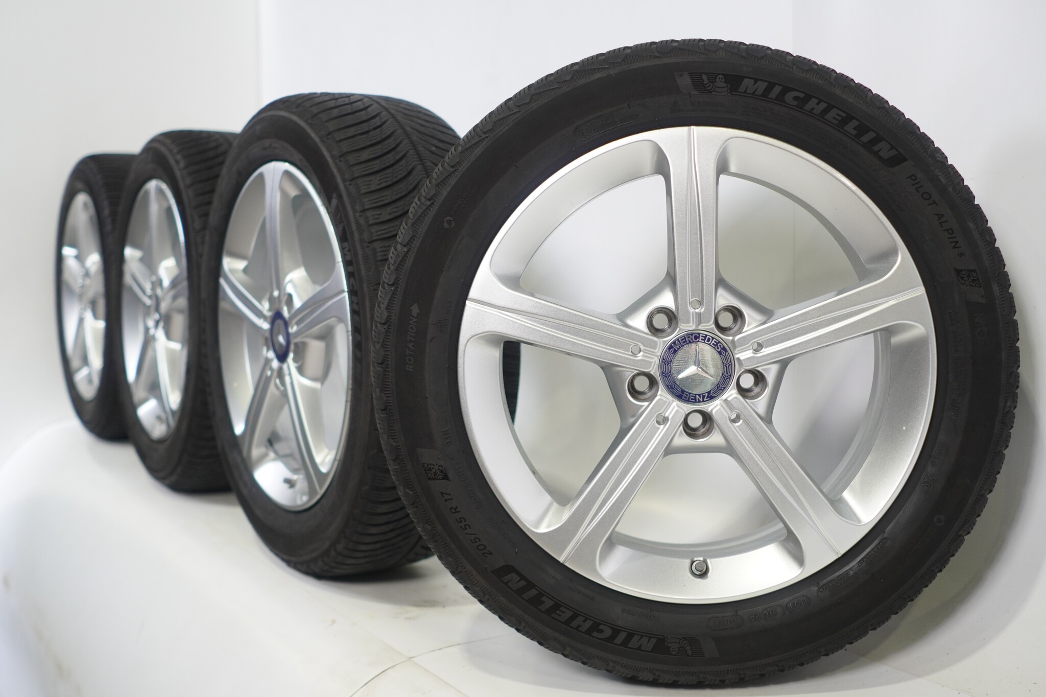 Original wheel set from Mercedes, styling 17 inch rims with Michelin Pilotalpin 5 Winter tires. These rims are original rims of the Mercedes brand and suitable for: Mercedes A B CLA Class W177 C118 W247.