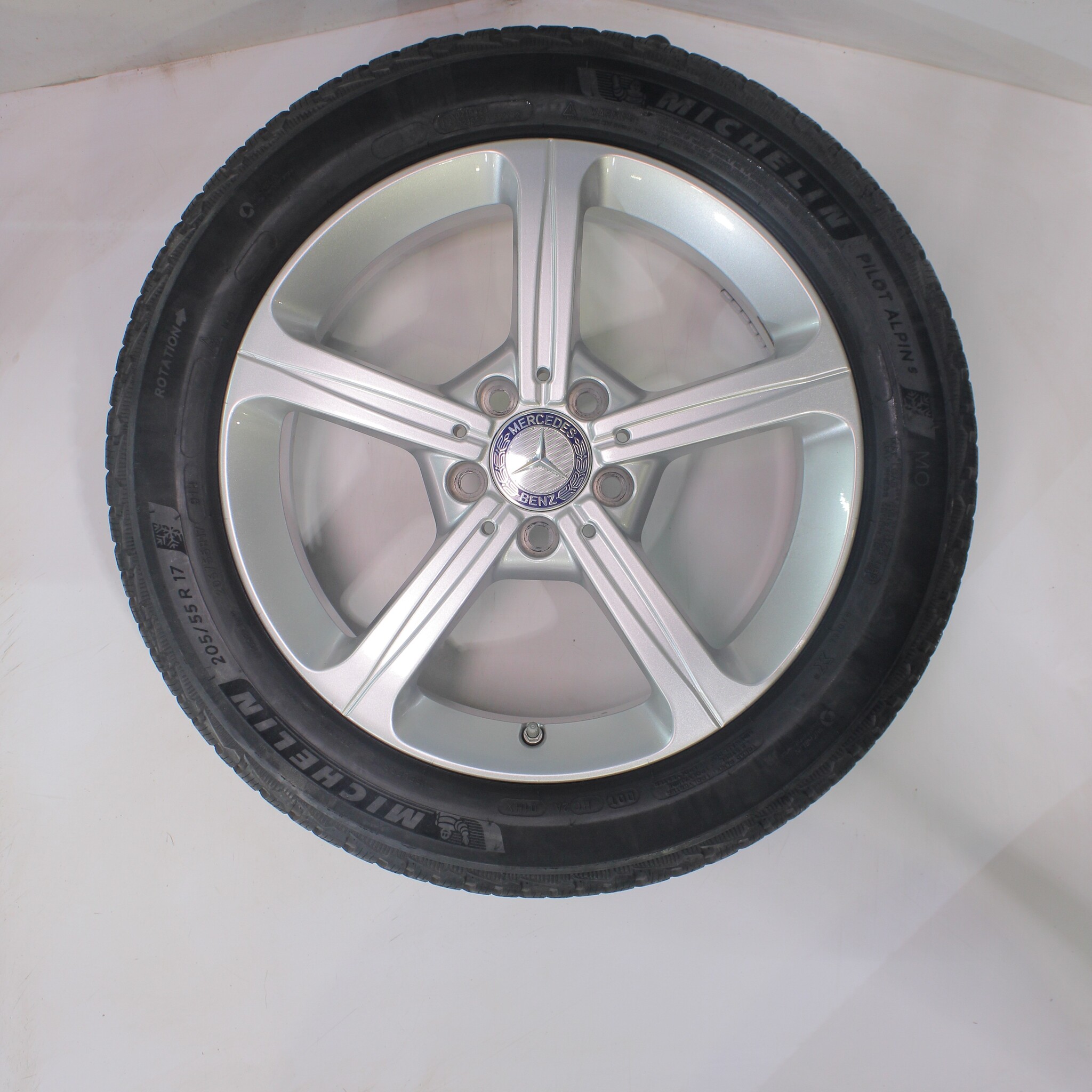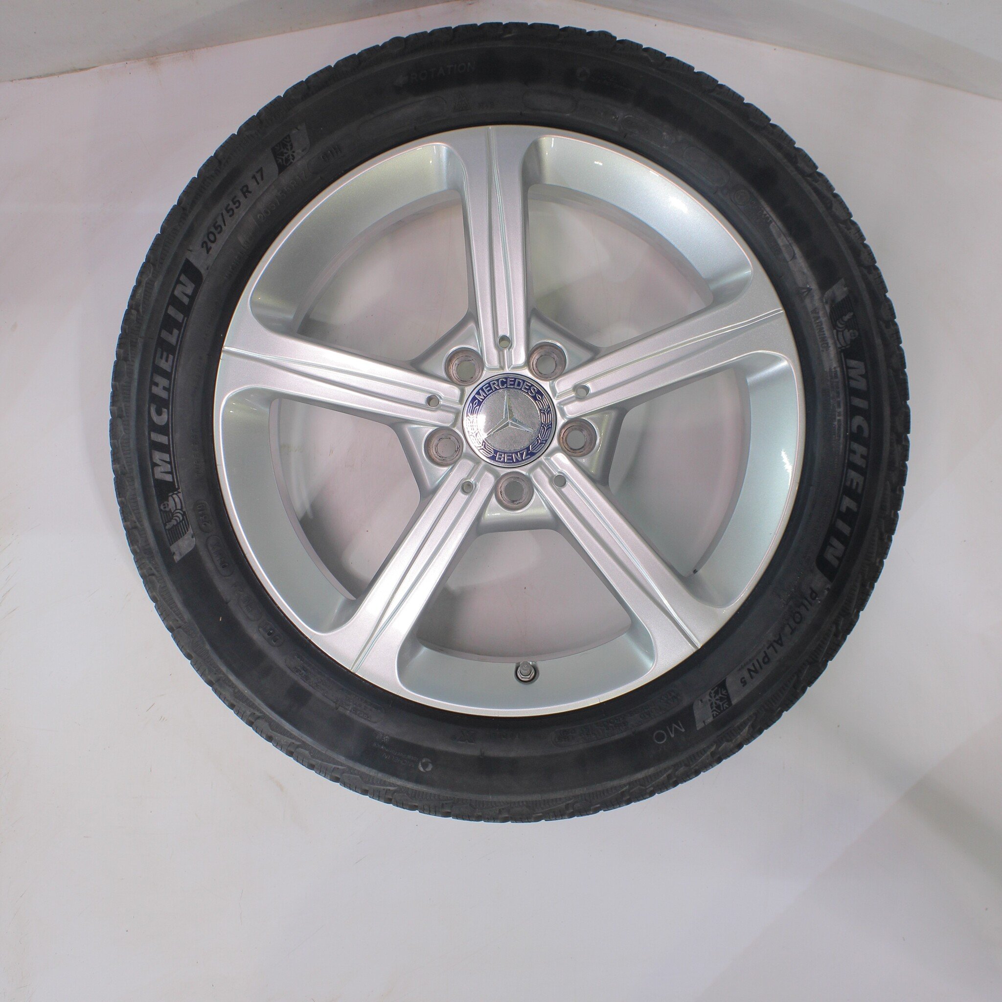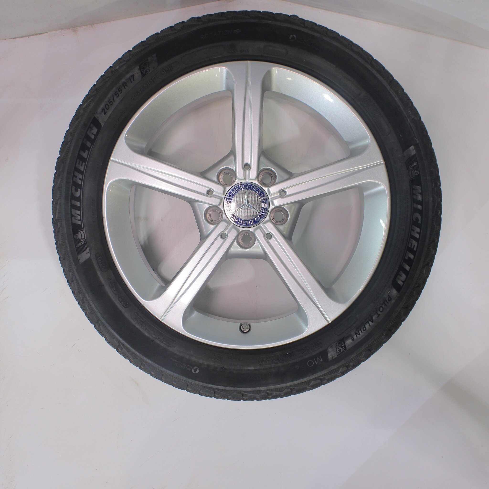 Original wheelset from Mercedes, 17-inch rims with Michelin Pilotalpin 5 winter tires. These rims are original Mercedes brand rims and suitable for: Mercedes A B CLA Class W177 C118 W247.