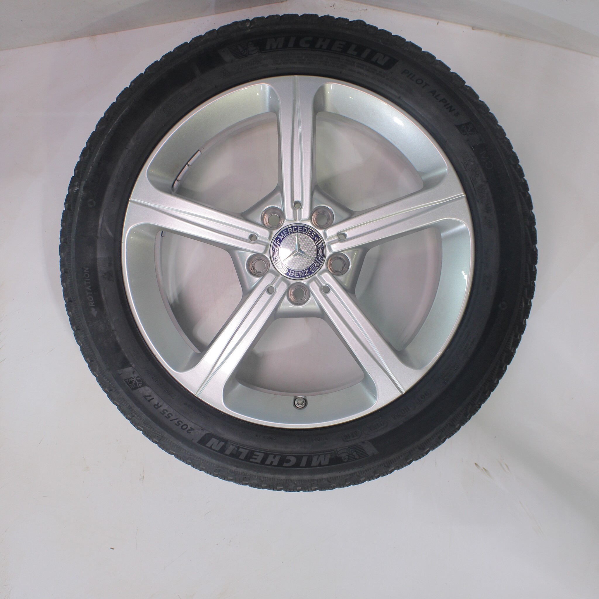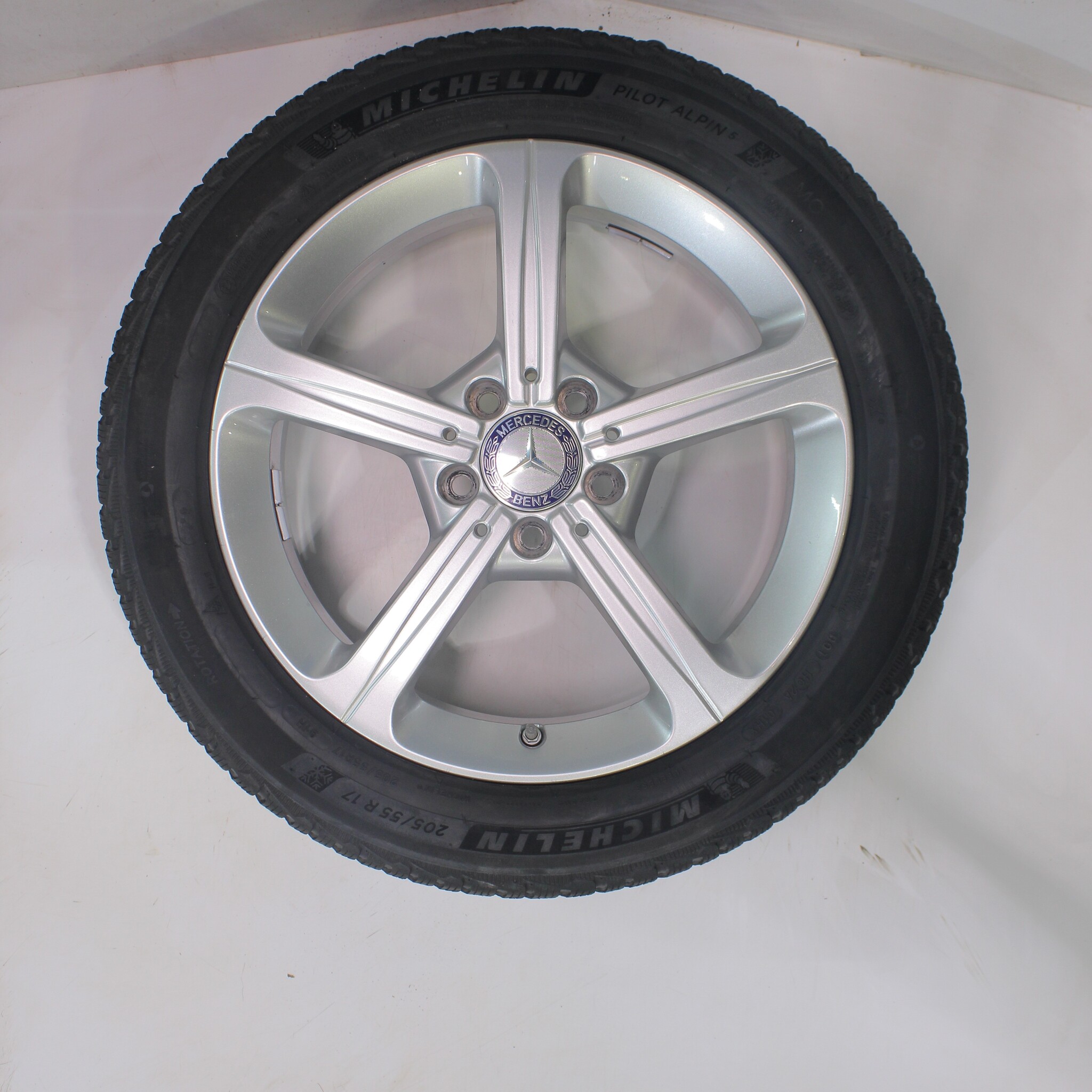 Original Mercedes wheelset, 17-inch rims with Michelin Pilotalpin 5 Winter tires. These rims are original Mercedes brand rims and suitable for: Mercedes A B CLA Class W177 C118 W247.