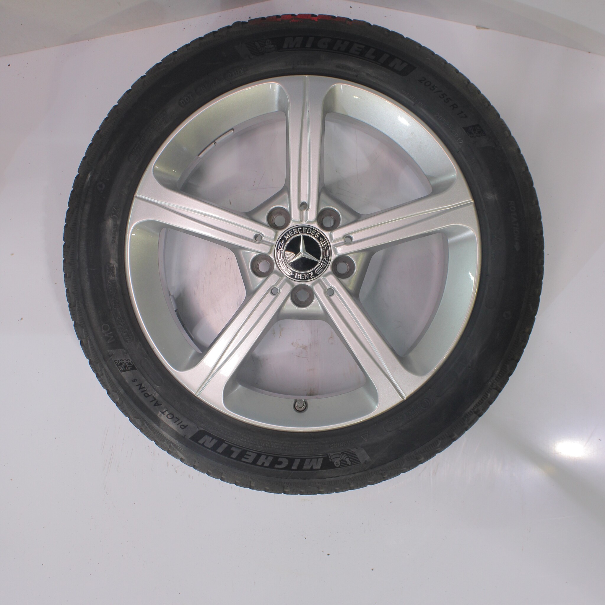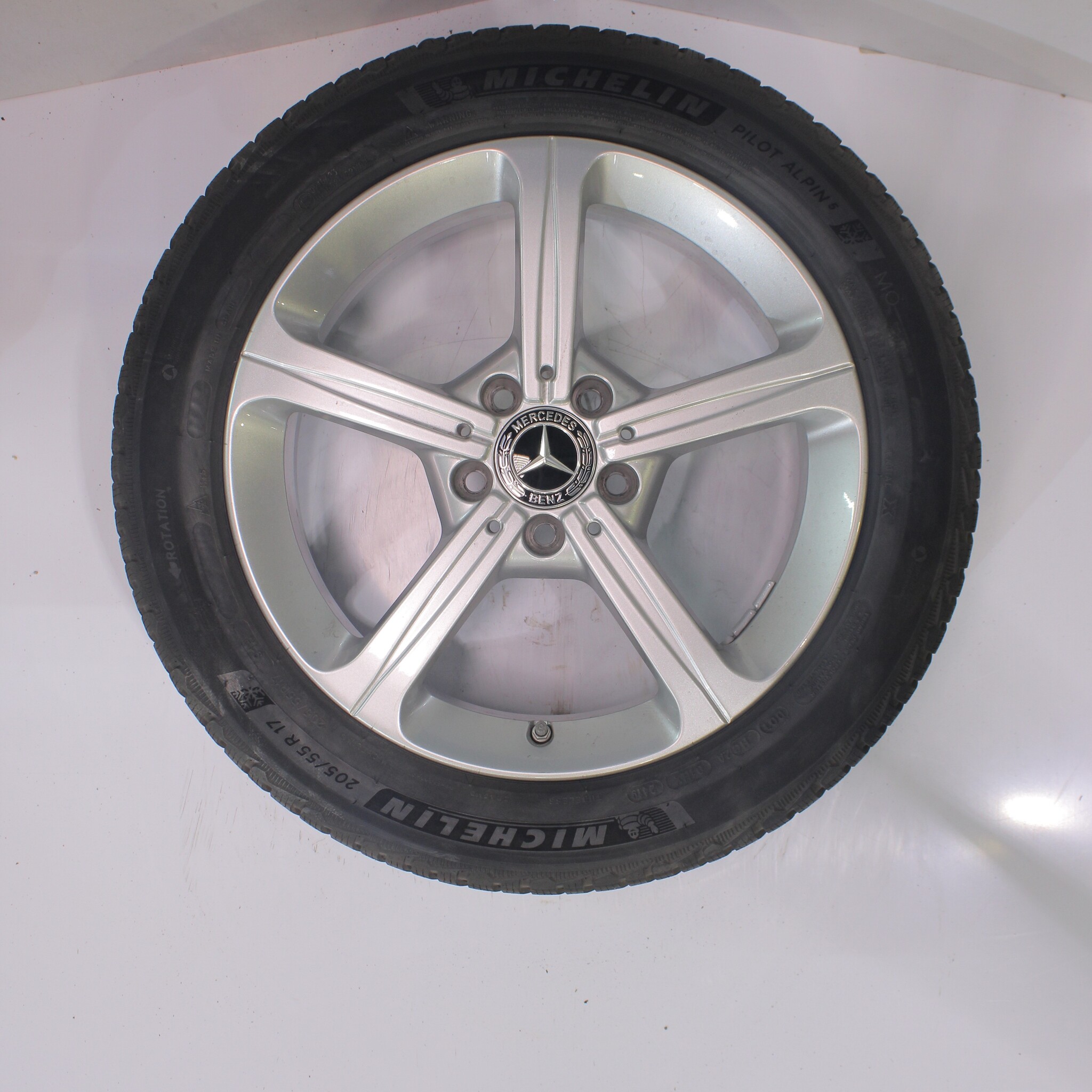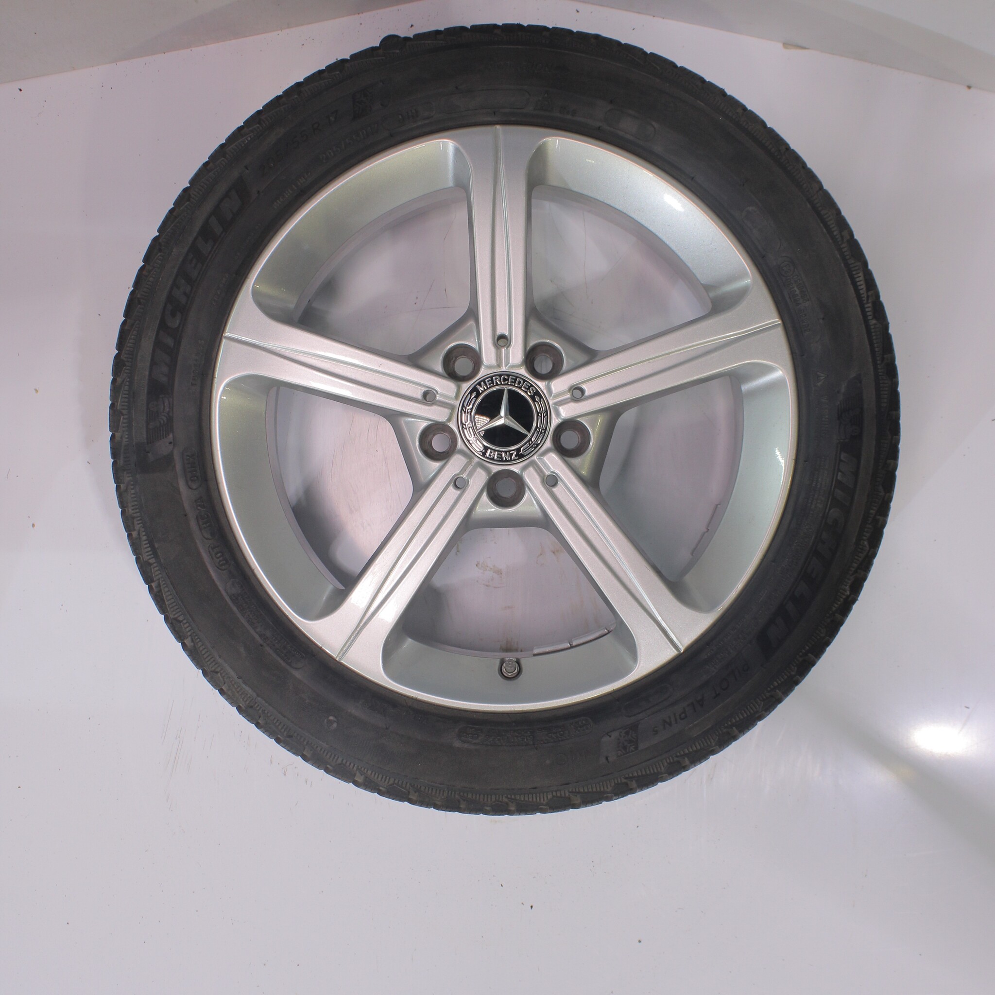 Original wheel set from Mercedes, 17-inch rims with Michelin Pilotalpin 5 winter tires. These rims are original Mercedes brand rims and suitable for: Mercedes A B CLA Class W177 C118 W247.