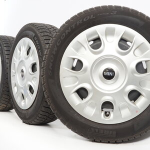 Steel set of Original Mini Cooper F55 F56 steel rims 15 inch with Pirelli Snowcontrol Winter 210 series 3* winter tires. These rims are original rims of the Mini brand and suitable for the F55 F56. The wheel set is a steel set. The caps show traces of use.